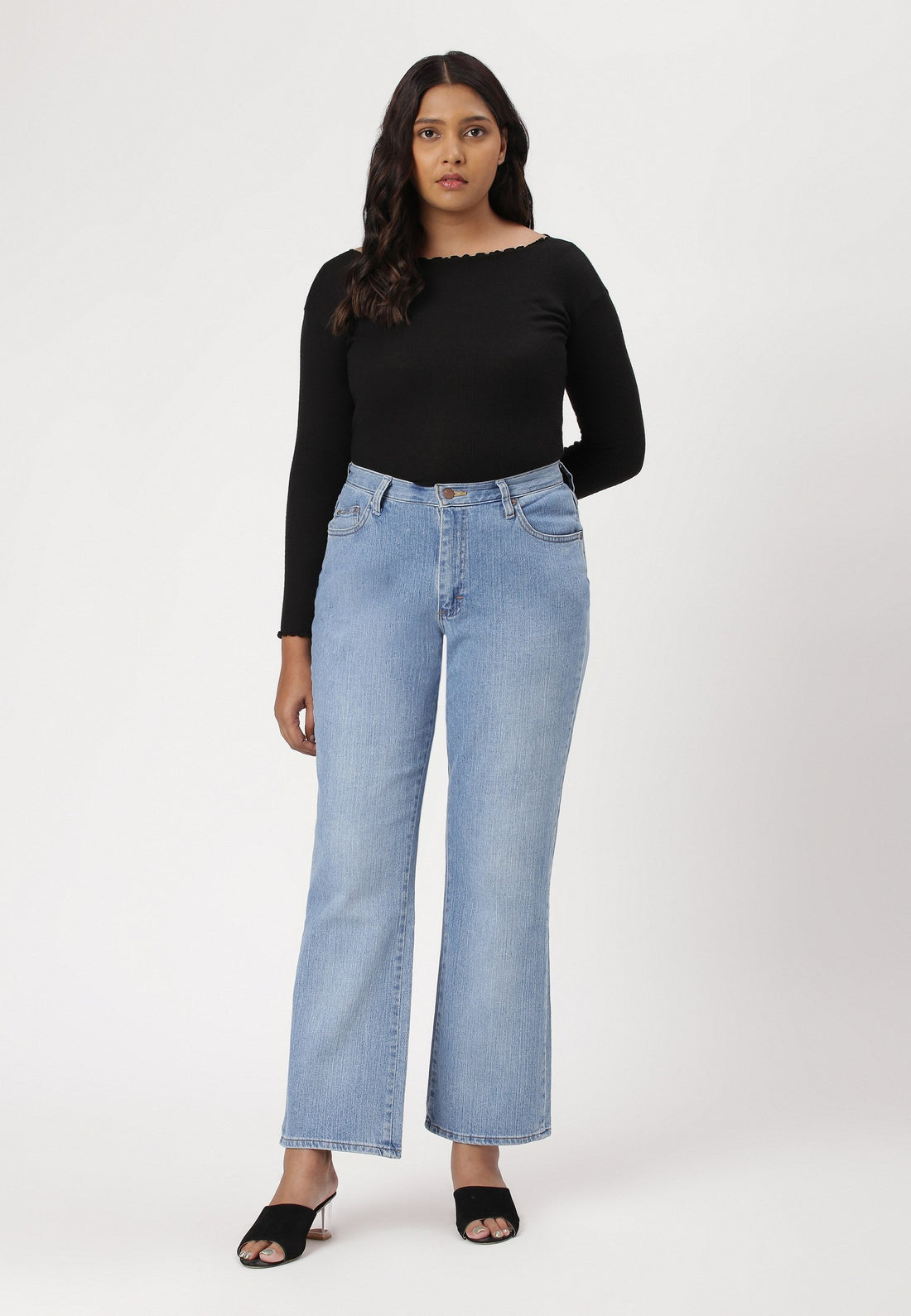 Women's light indigo straight jeans that sit comfortably at the waist with narrow leg openings....