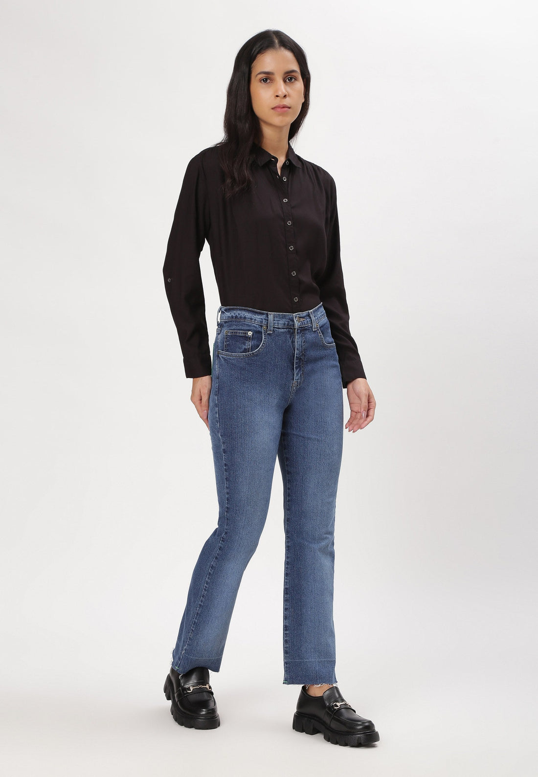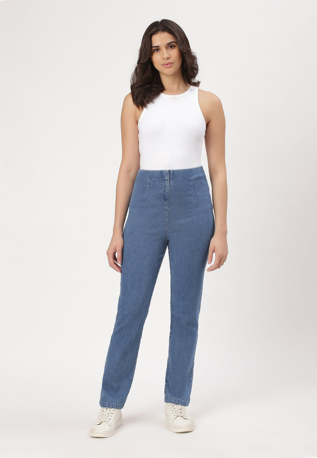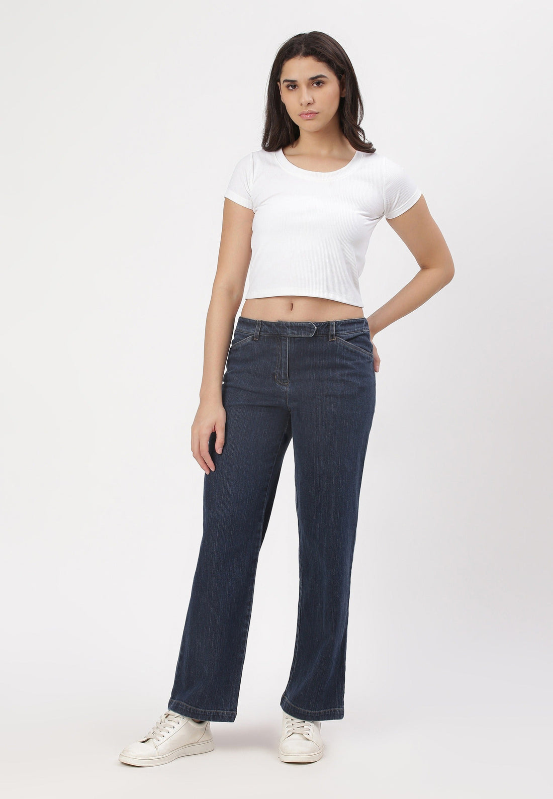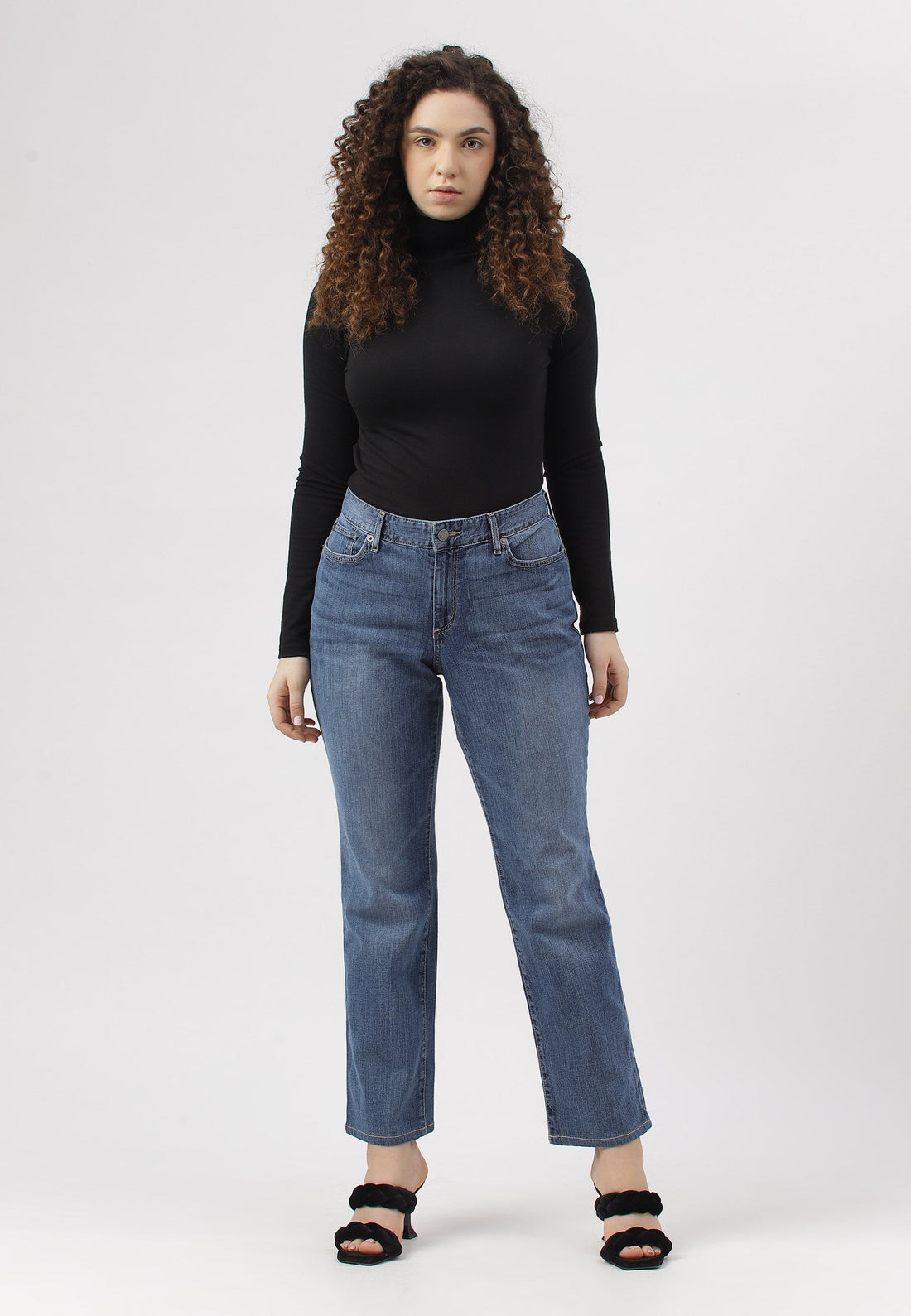 Women's mid indigo straight jeans that sit comfortably at the waist with narrow leg openings....