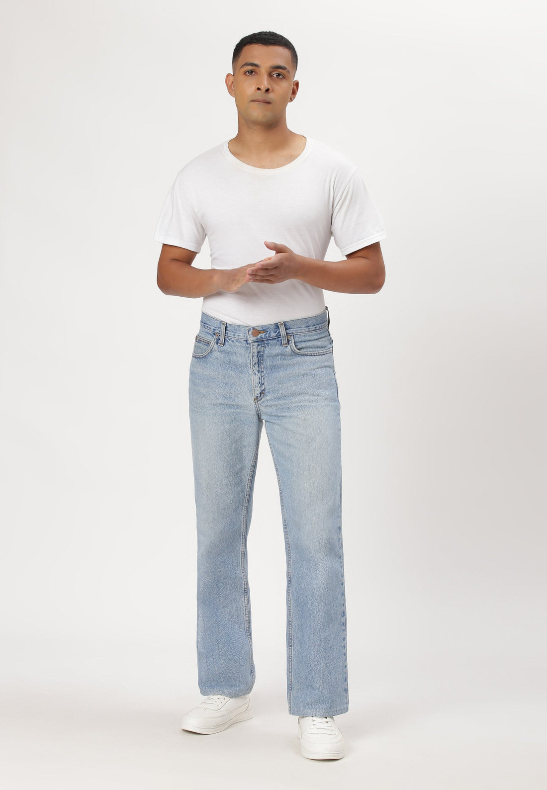 Men's light indigo straight jeans that sit high on the waist with narrow leg openings....
