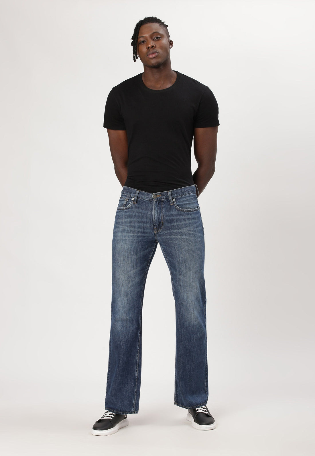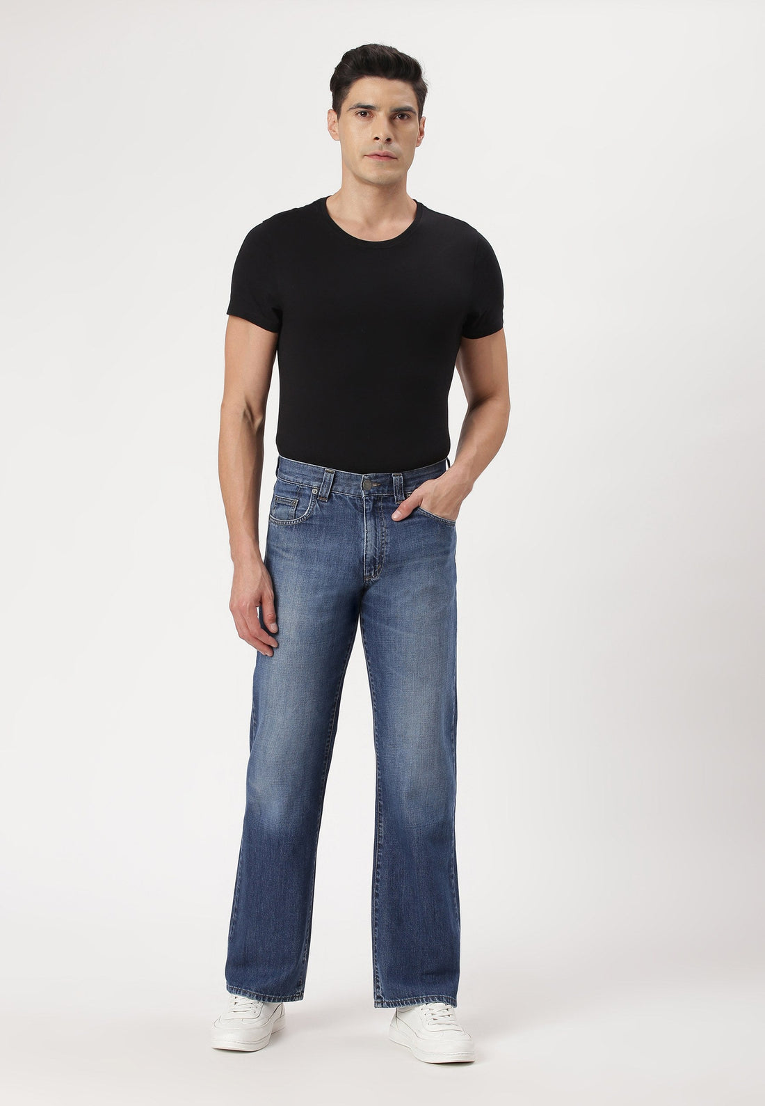 Men's mid indigo straight jeans that sit high on the waist with narrow leg openings....