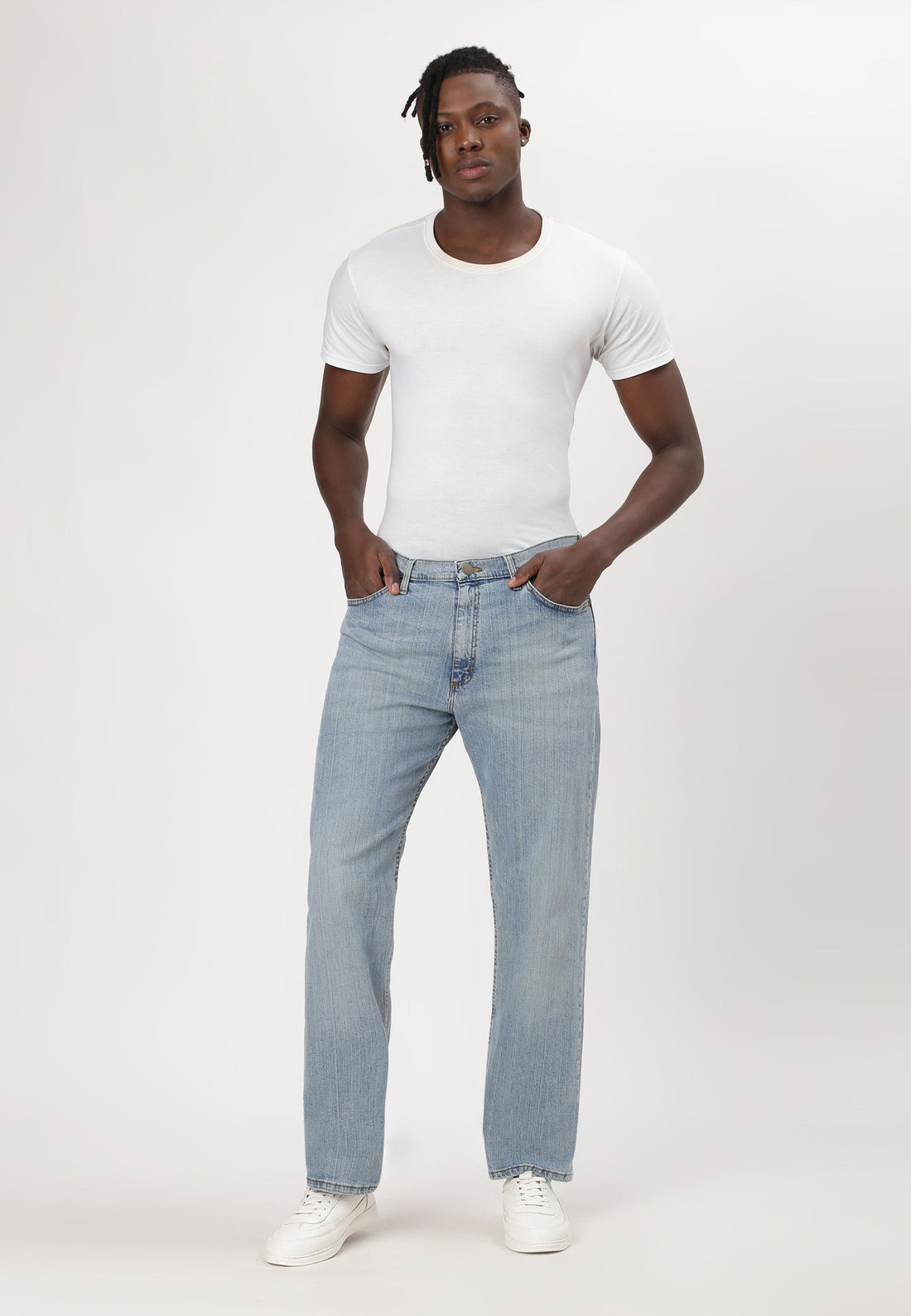 Men's light indigo straight jeans that sit comfortably at the waist with narrow leg openings....