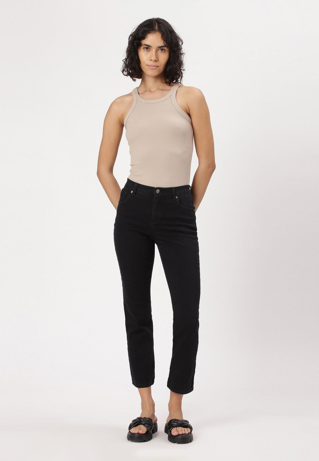 Women's black straight jeans that sit high on the waist with narrow leg openings. They...