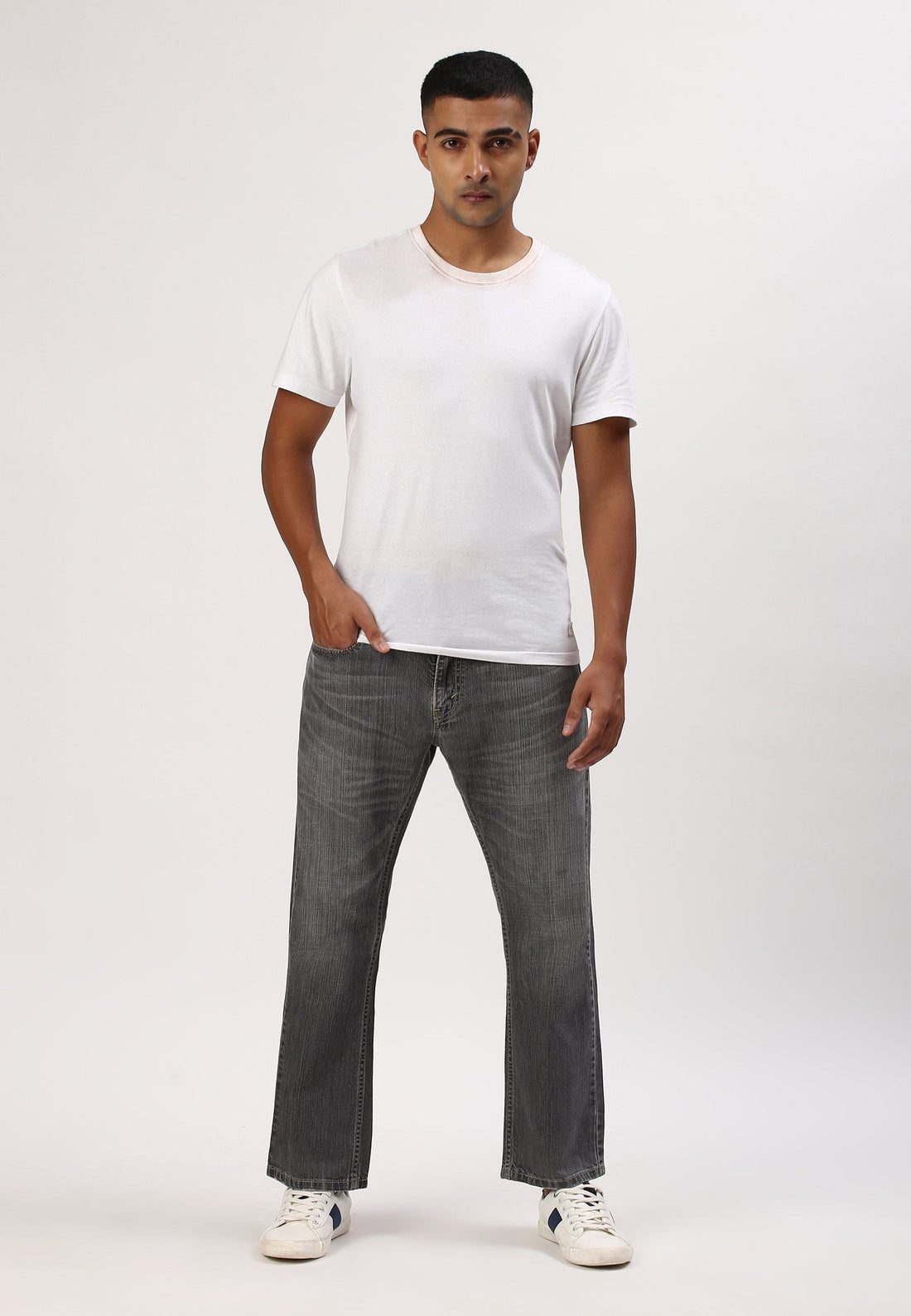 Men's grey straight jeans that sit comfortably at the waist with narrow leg openings. They...