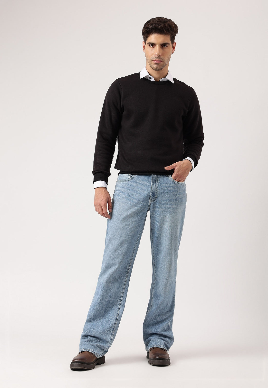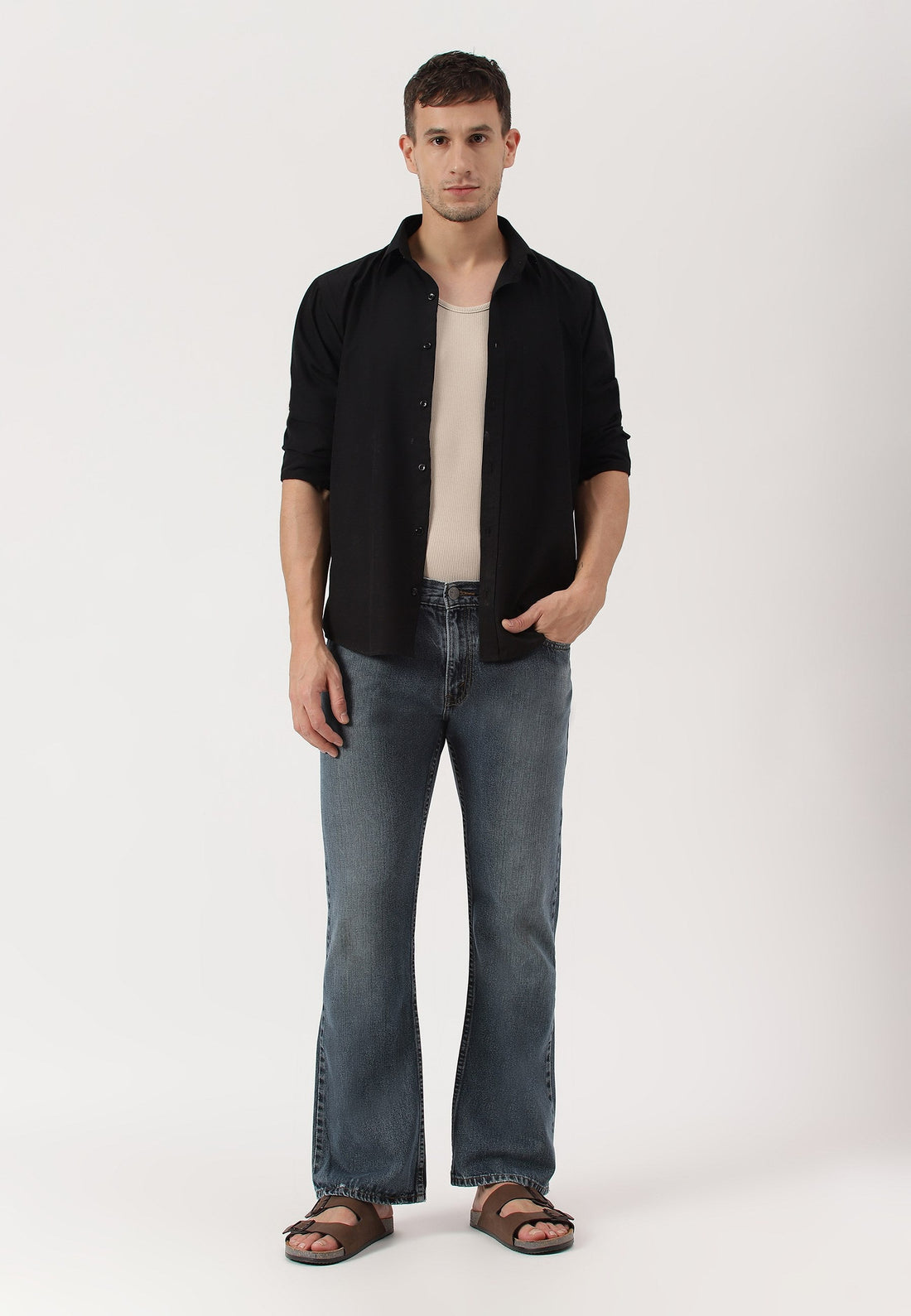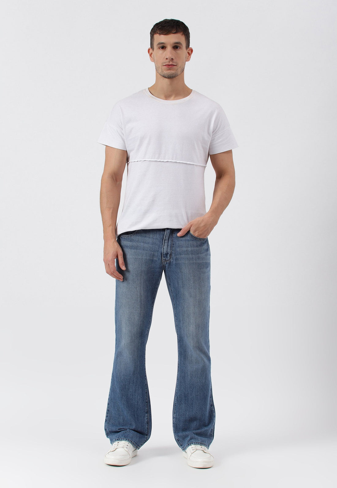 Men's light indigo bootcut jeans that sit comfortably at the waist with wide leg openings....