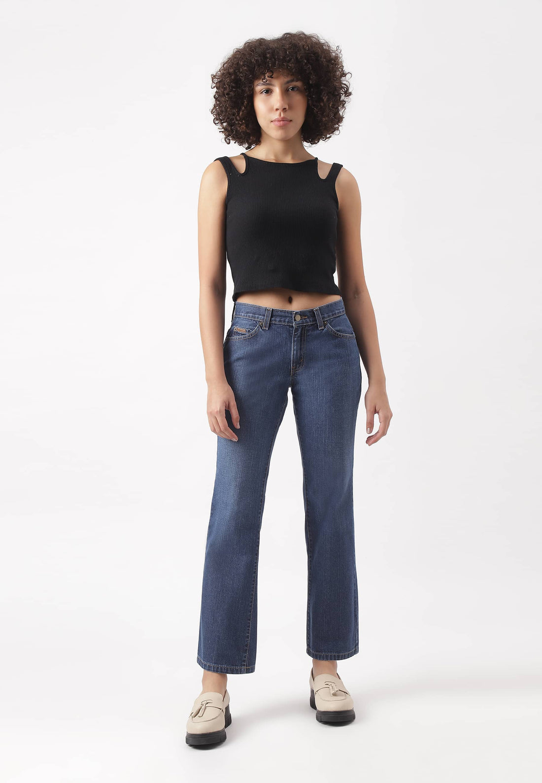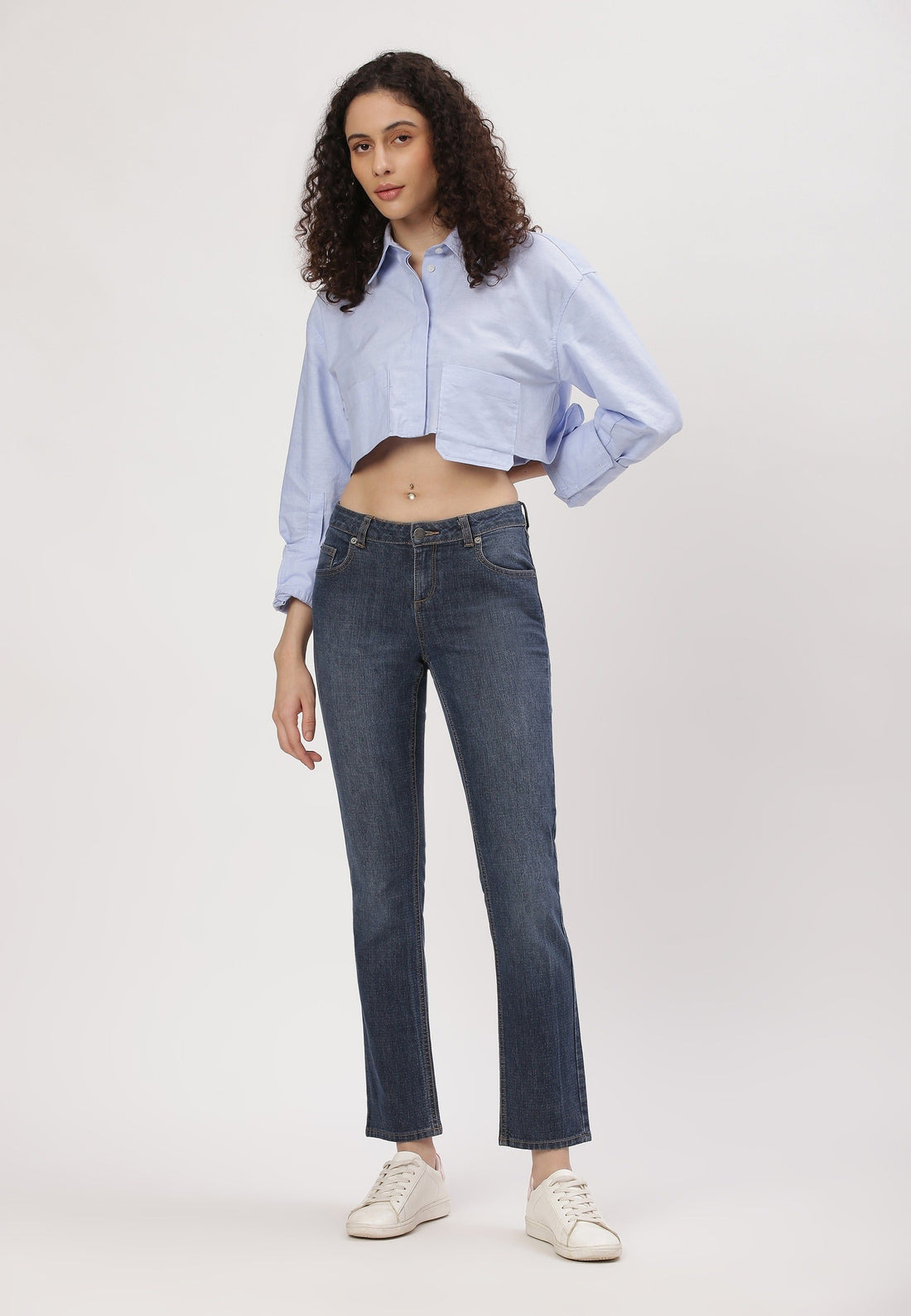 Women's mid indigo straight jeans that sit low on waist with narrow leg openings. They...