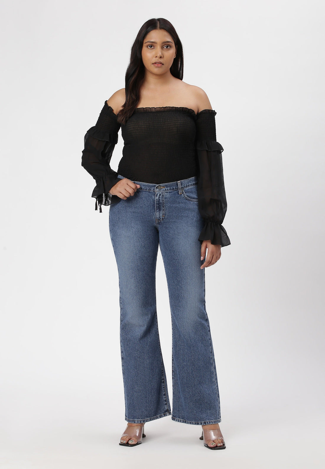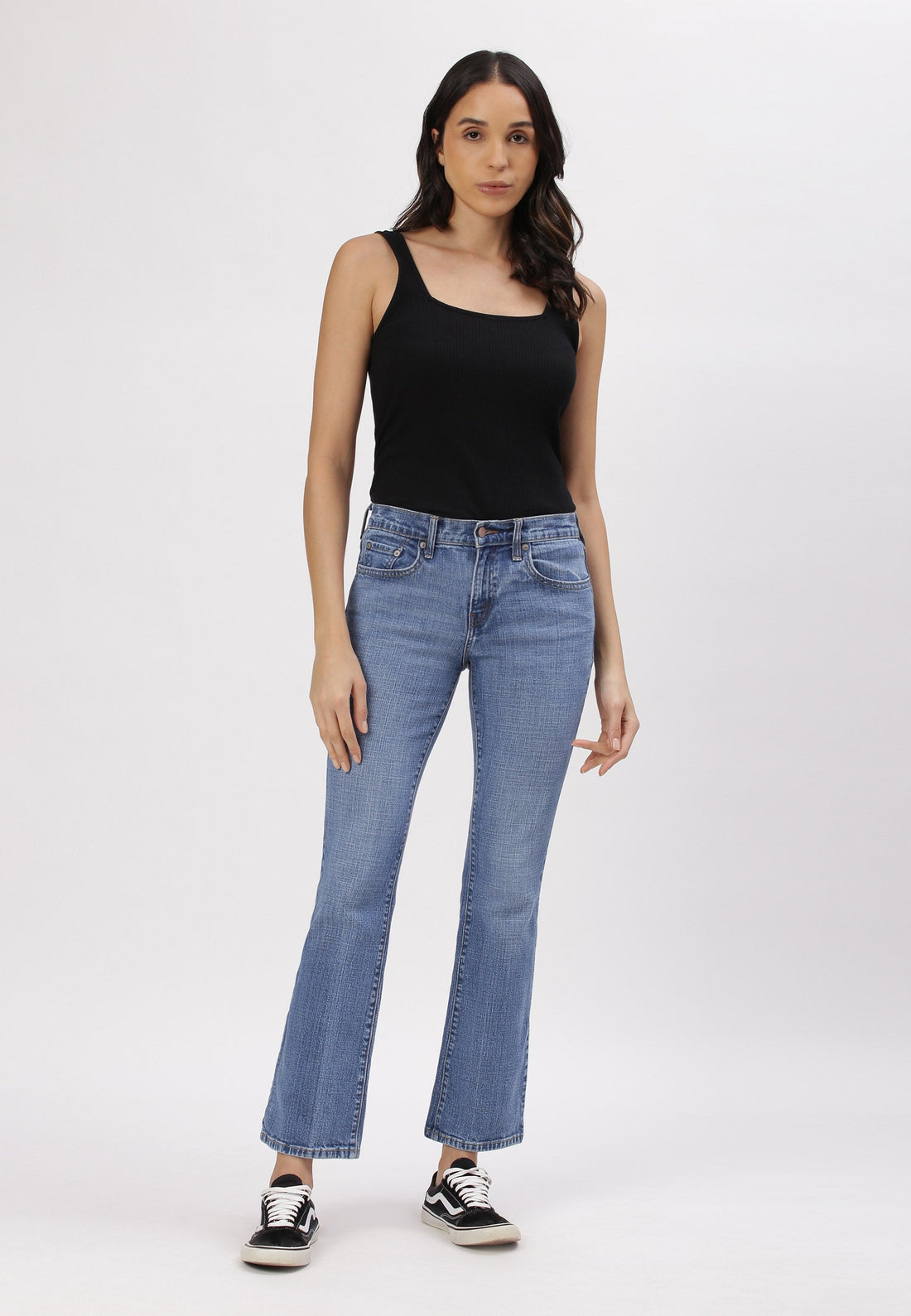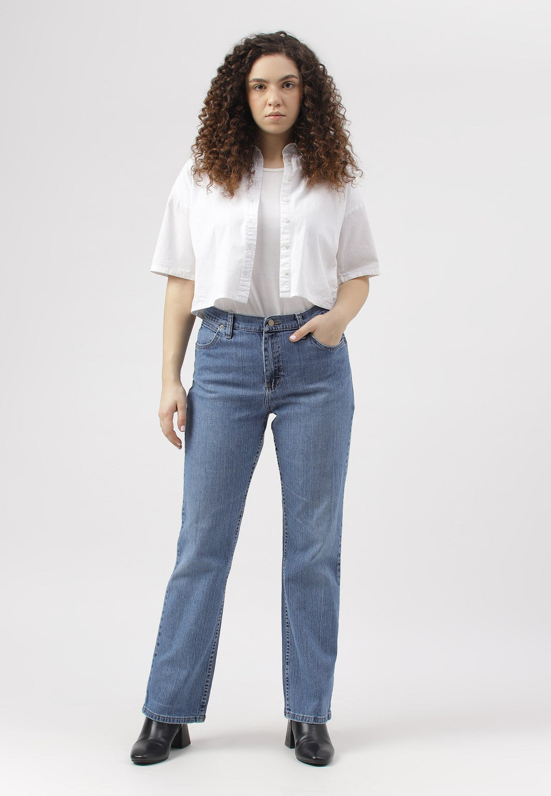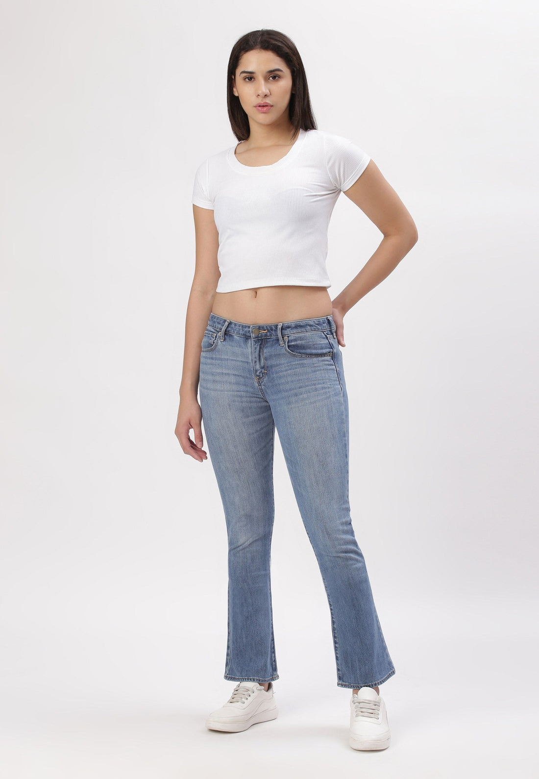 Women's light indigo bootcut jeans that sit comfortably at the waist with wide leg openings....