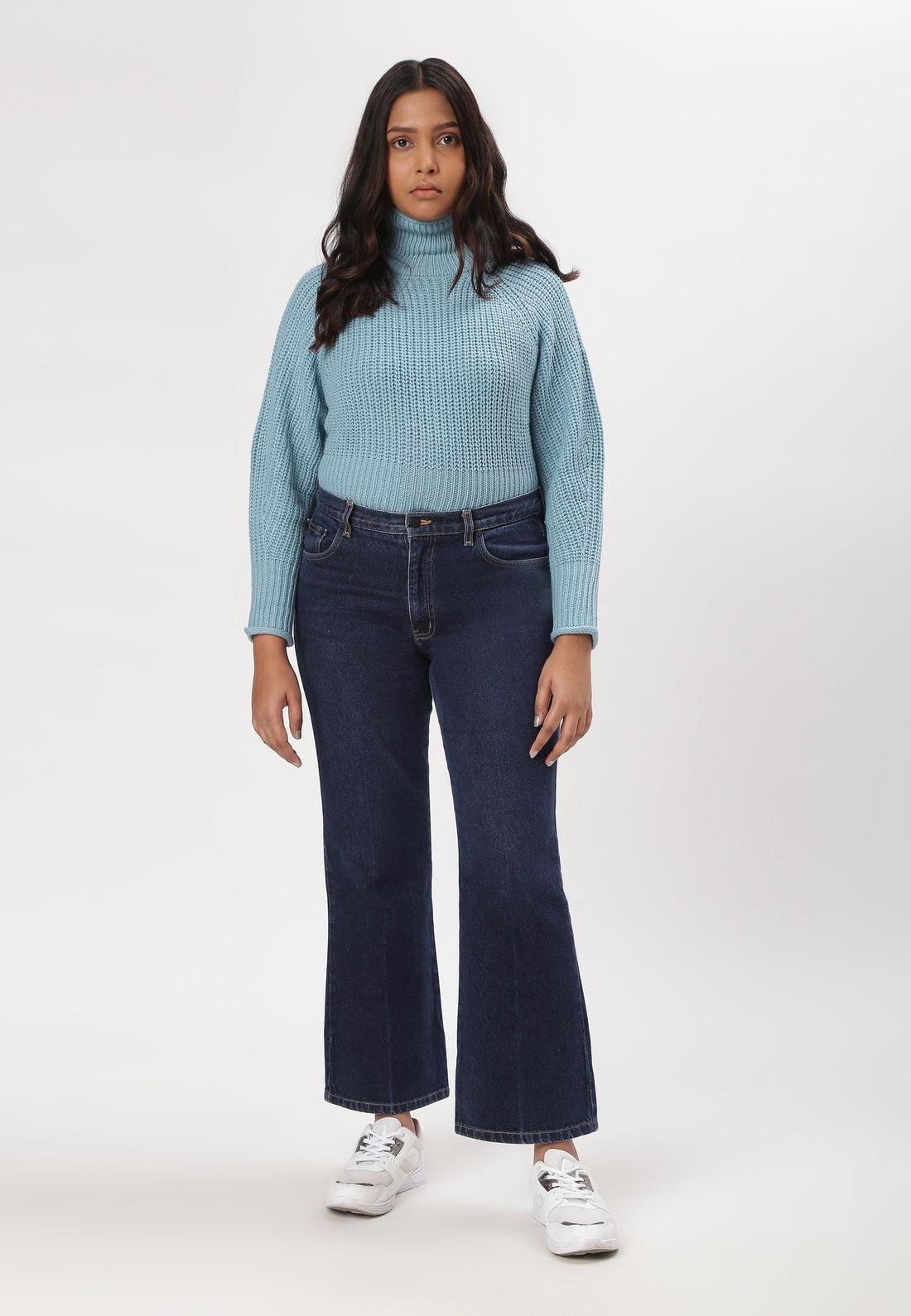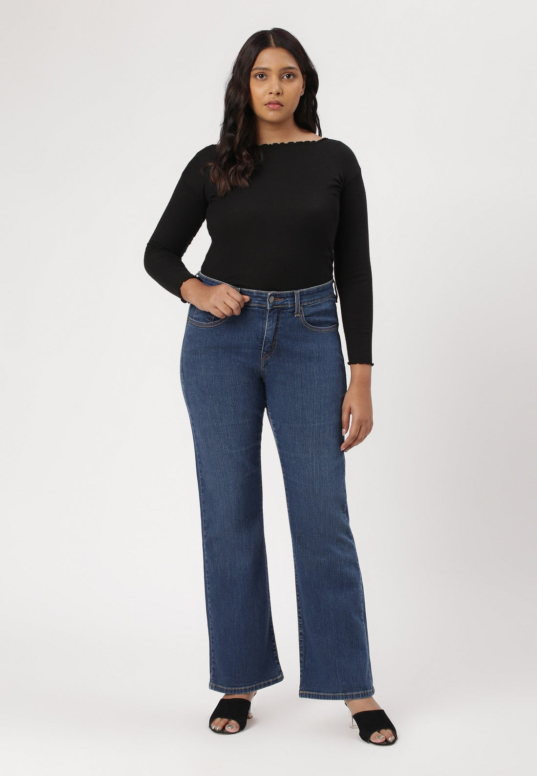 Women's dark indigo bootcut jeans that sit comfortably at the waist with wide leg openings....