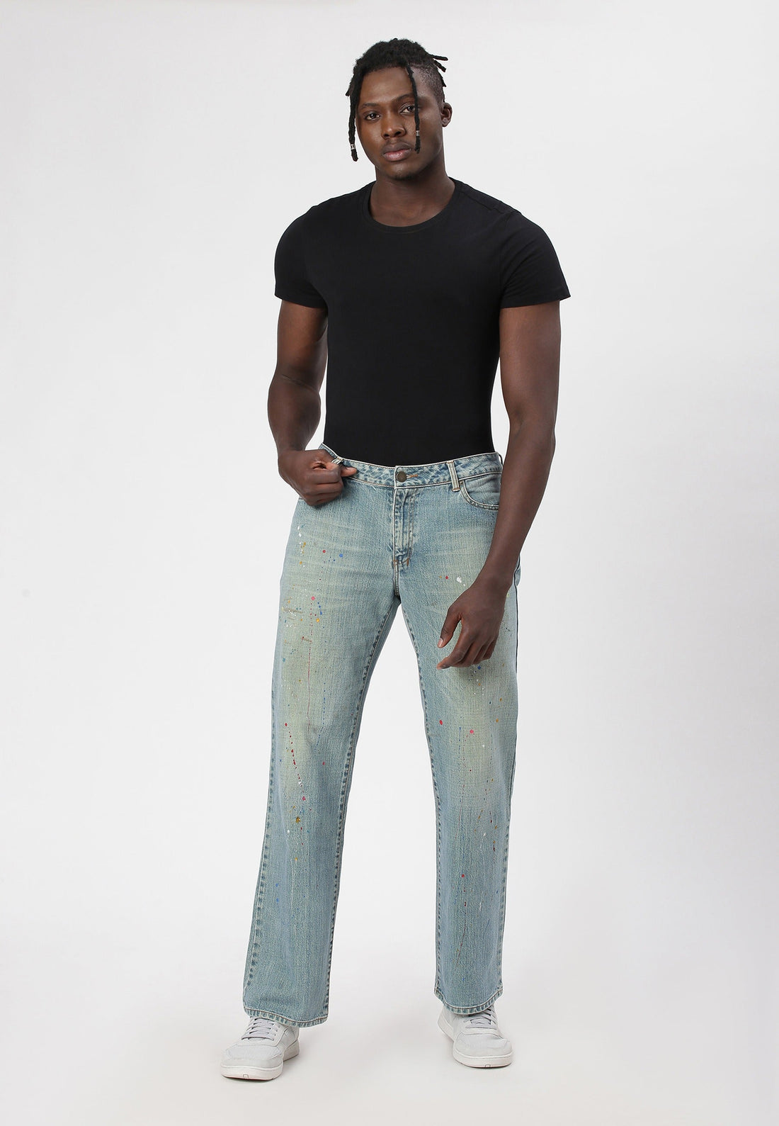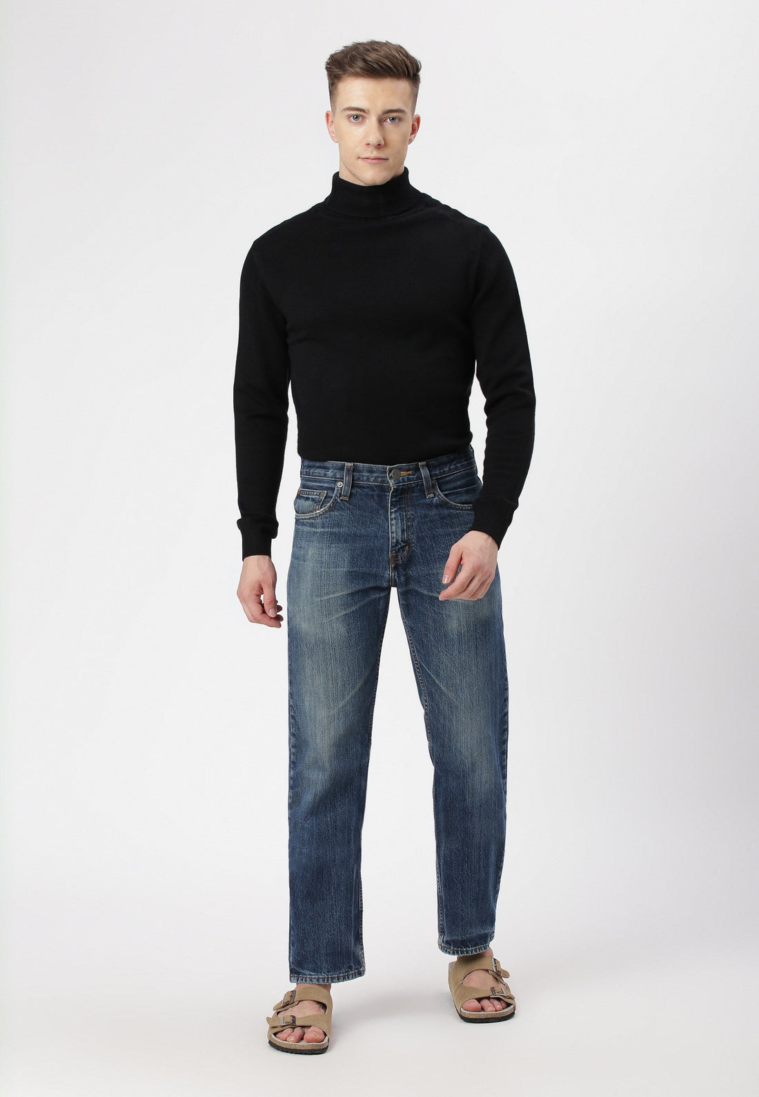 Men's light indigo straight jeans that sit comfortably at the waist with narrow leg openings....