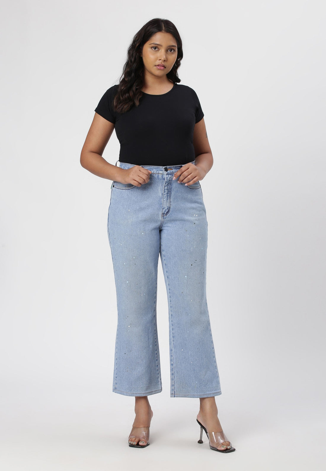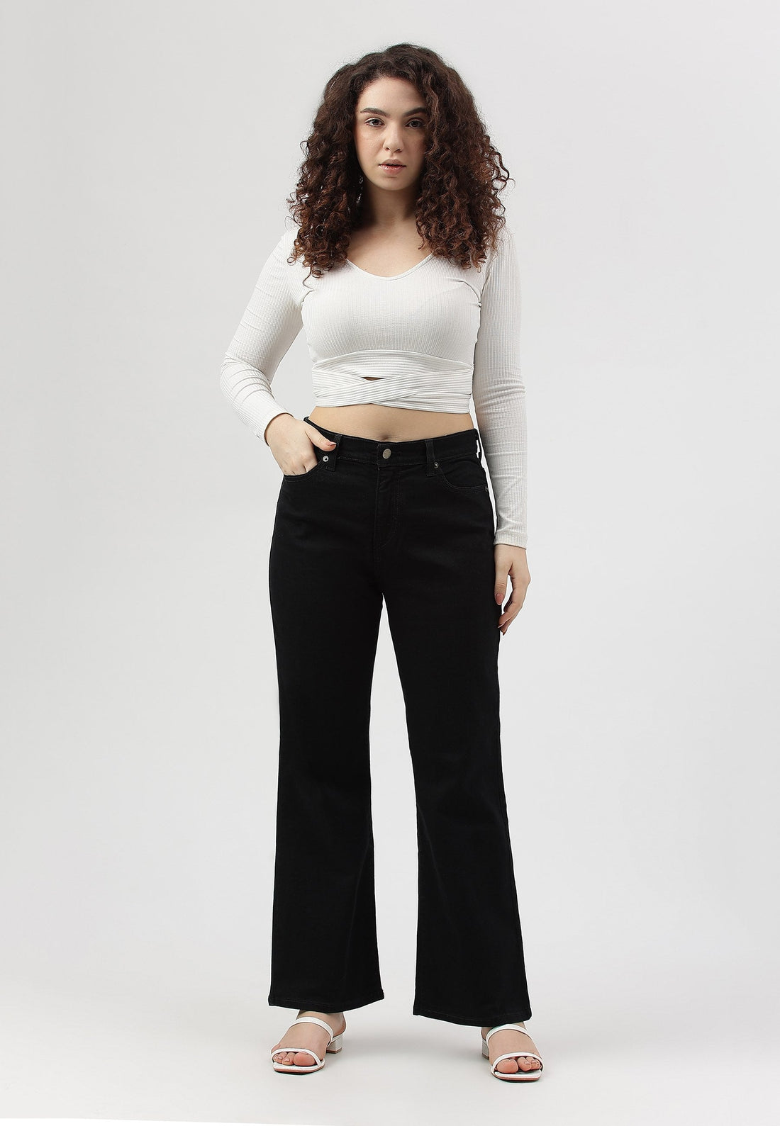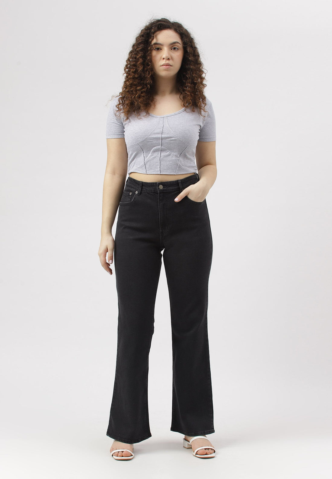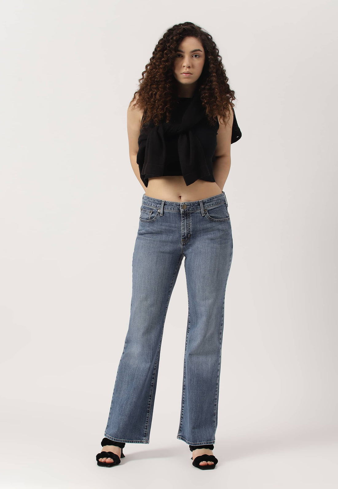 Women's black bootcut jeans that sit high on the waist with wide leg openings. They...