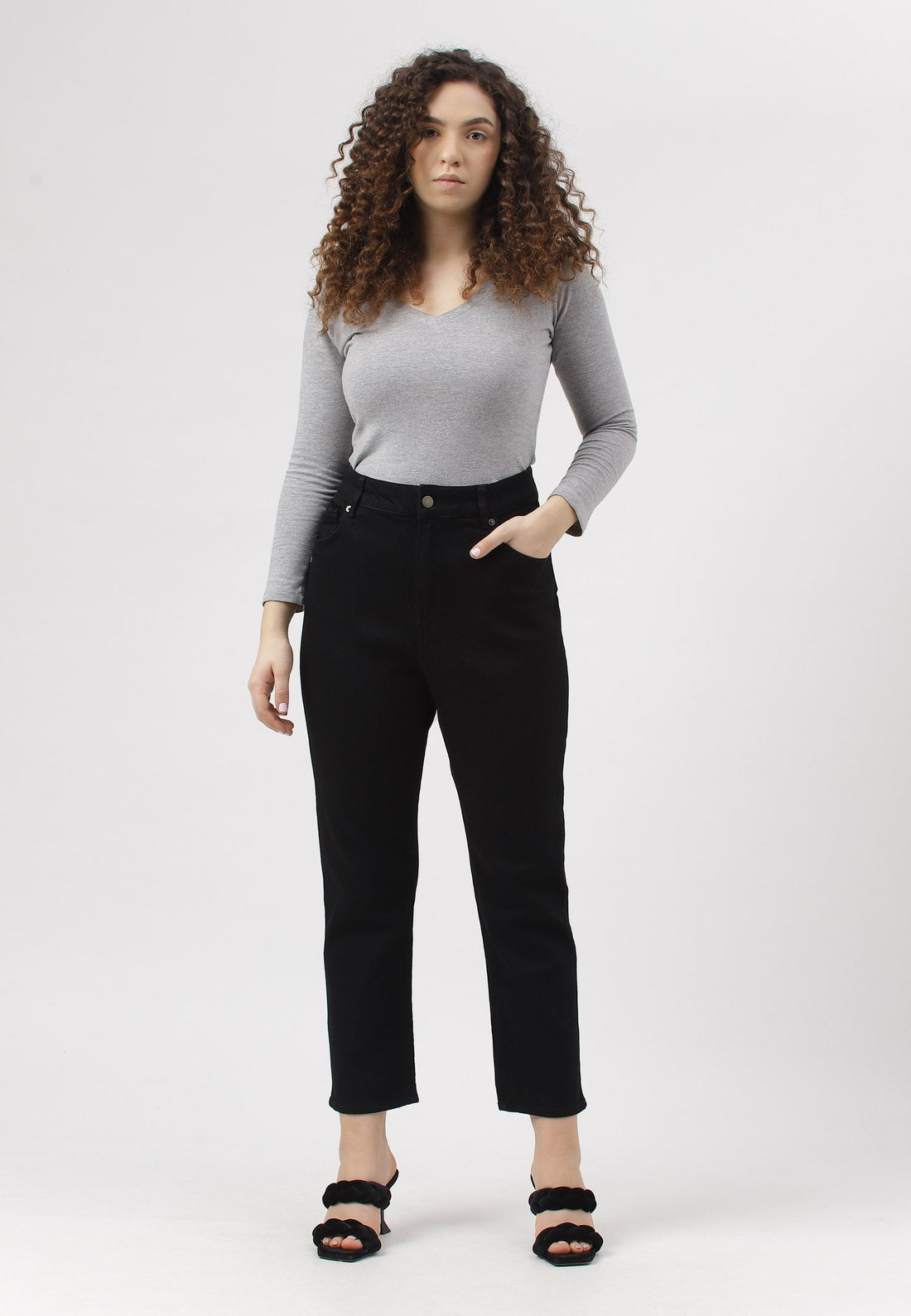 Women's black straight jeans that sit high on the waist with narrow leg openings. They...