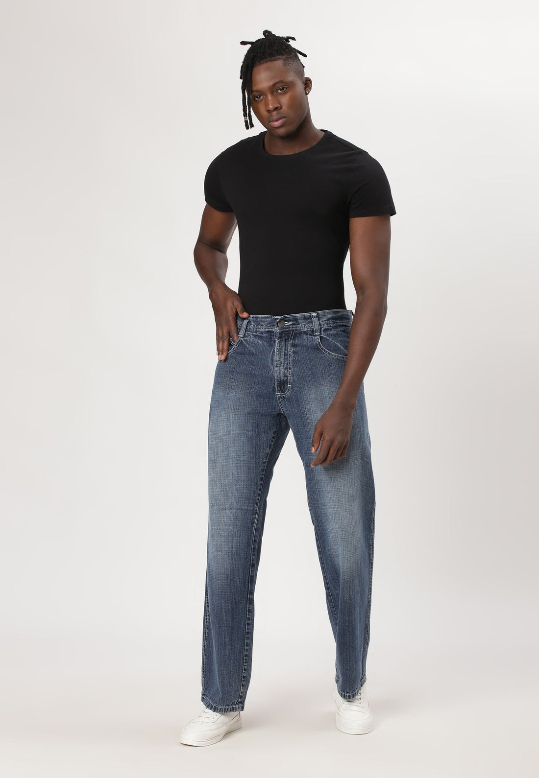 Men's mid indigo straight jeans that sit comfortably at the waist with narrow leg openings....