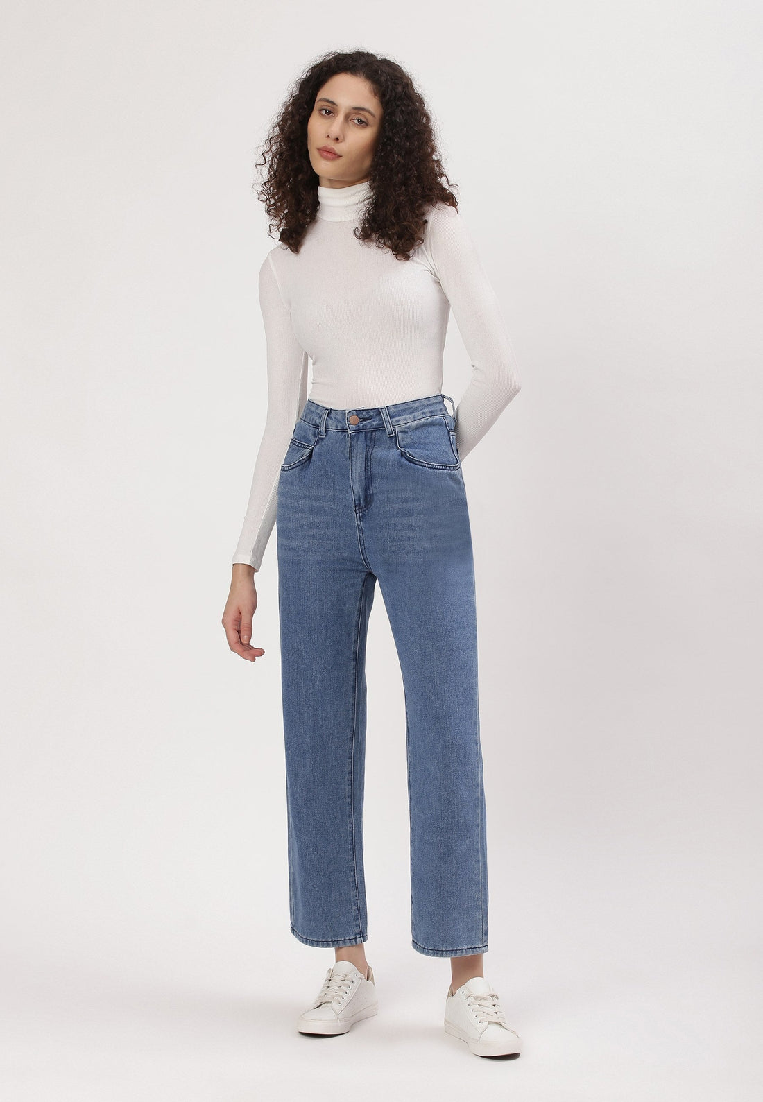 Women's light indigo straight jeans that sit high on the waist with narrow leg openings....