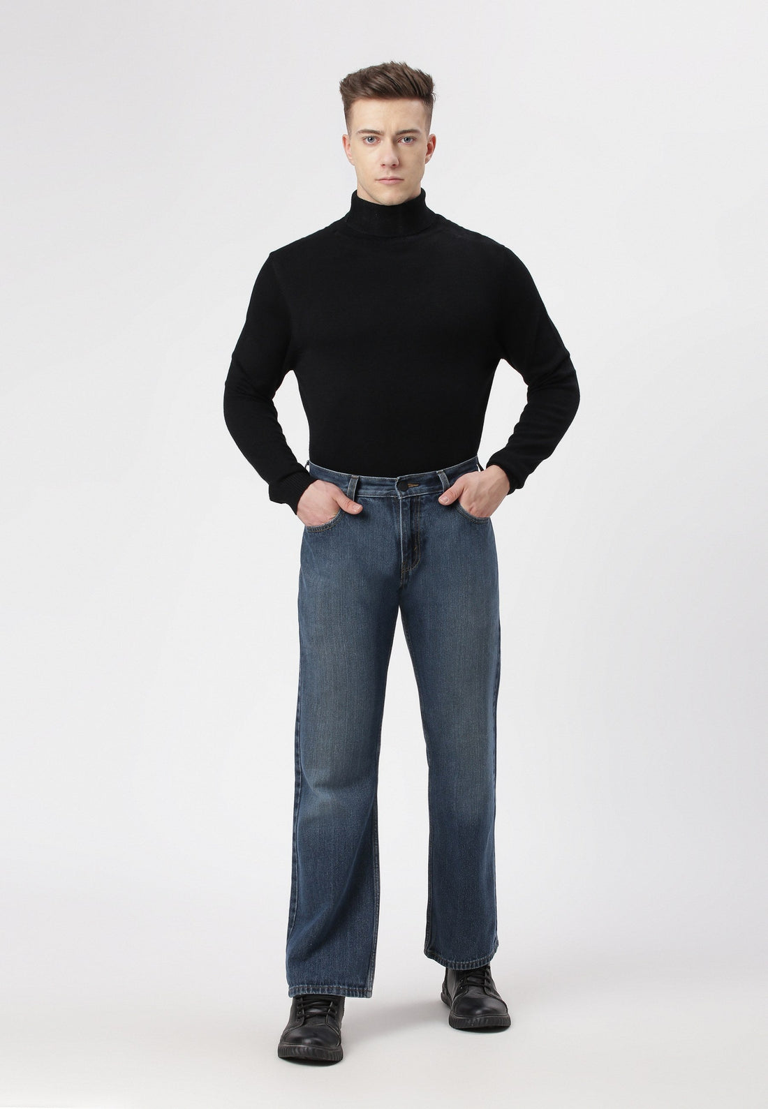 Men's mid indigo bootcut jeans that sit high on the waist with wide leg openings....