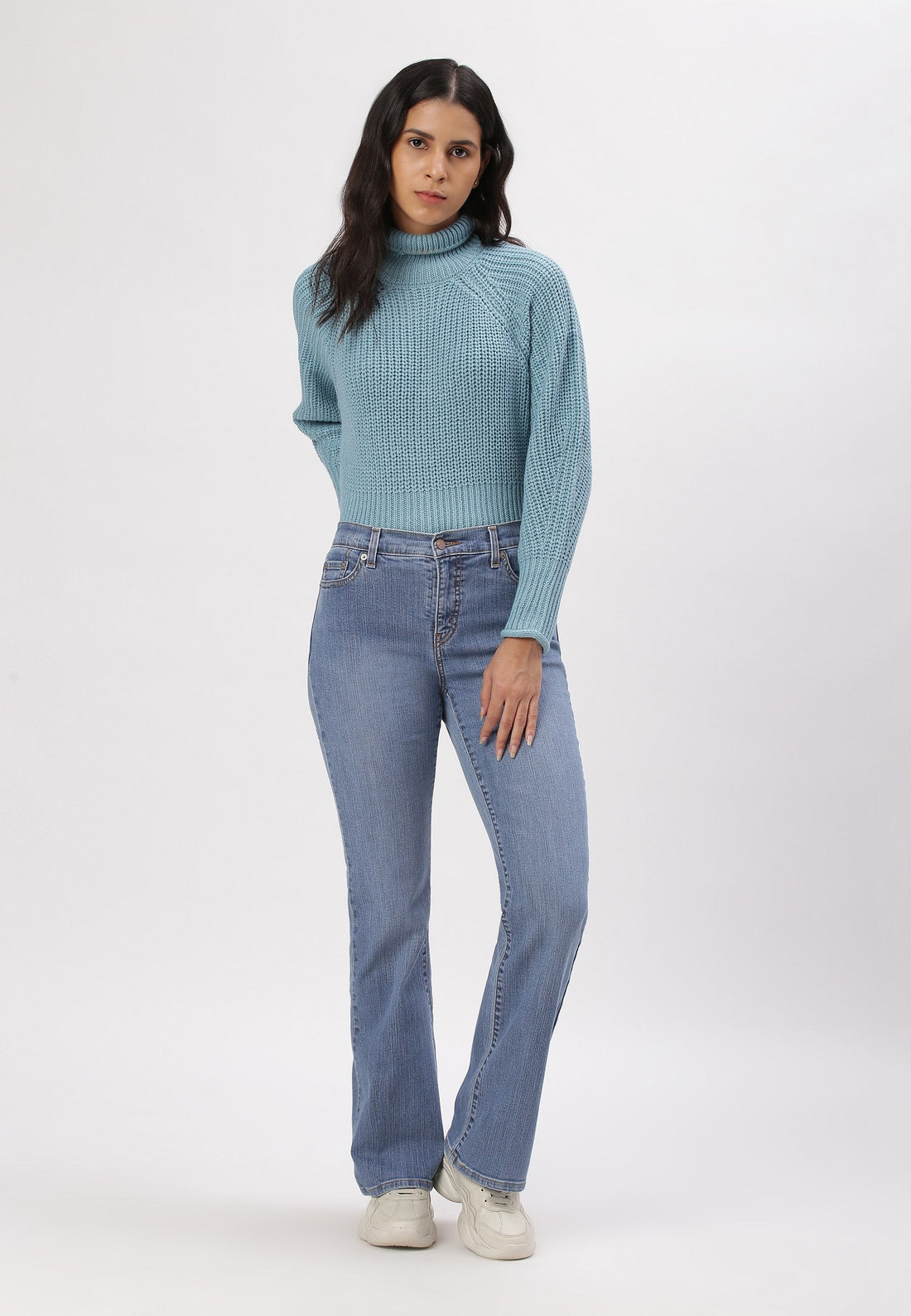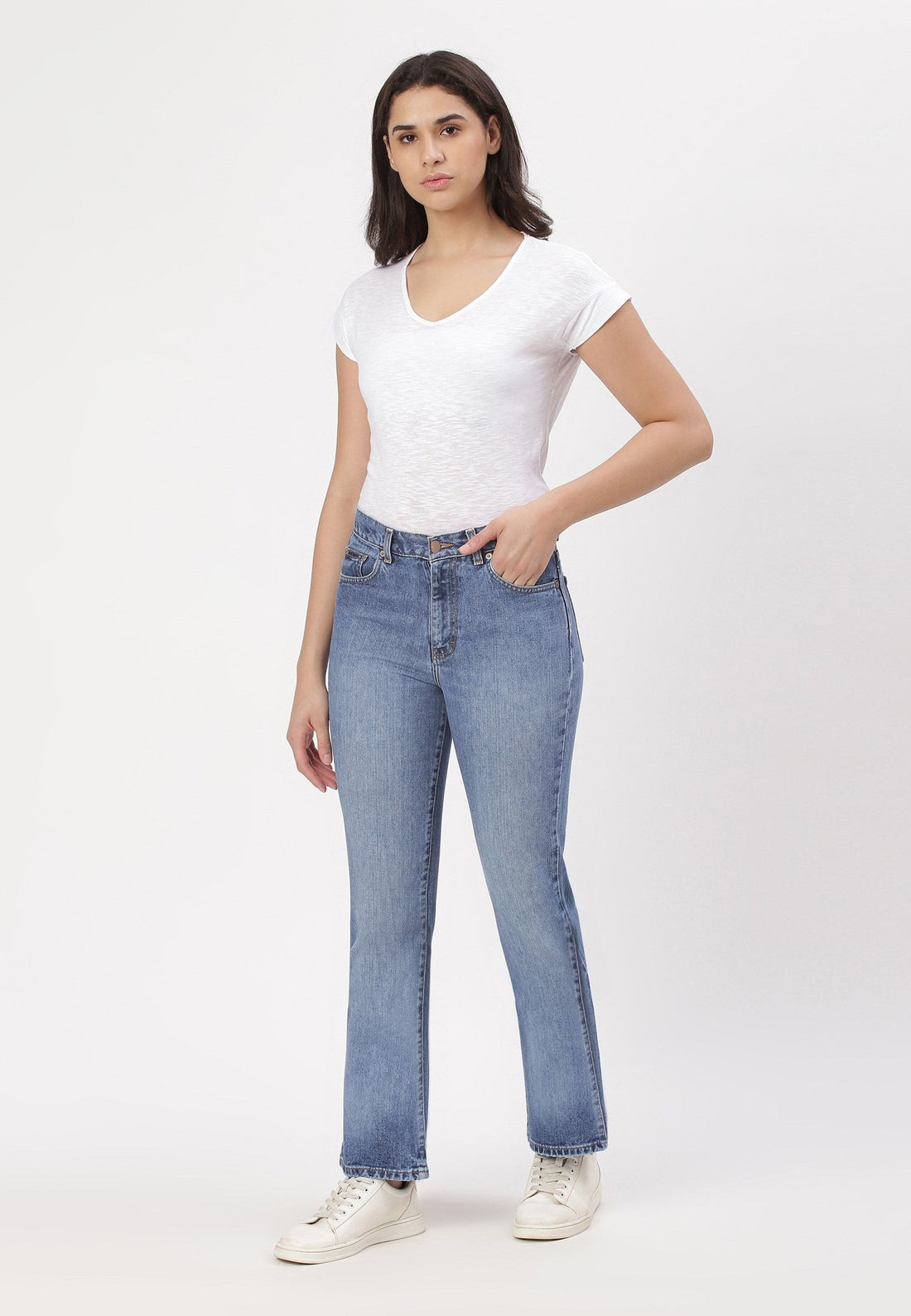 Women's mid indigo bootcut jeans that sit comfortably at the waist with wide leg openings....