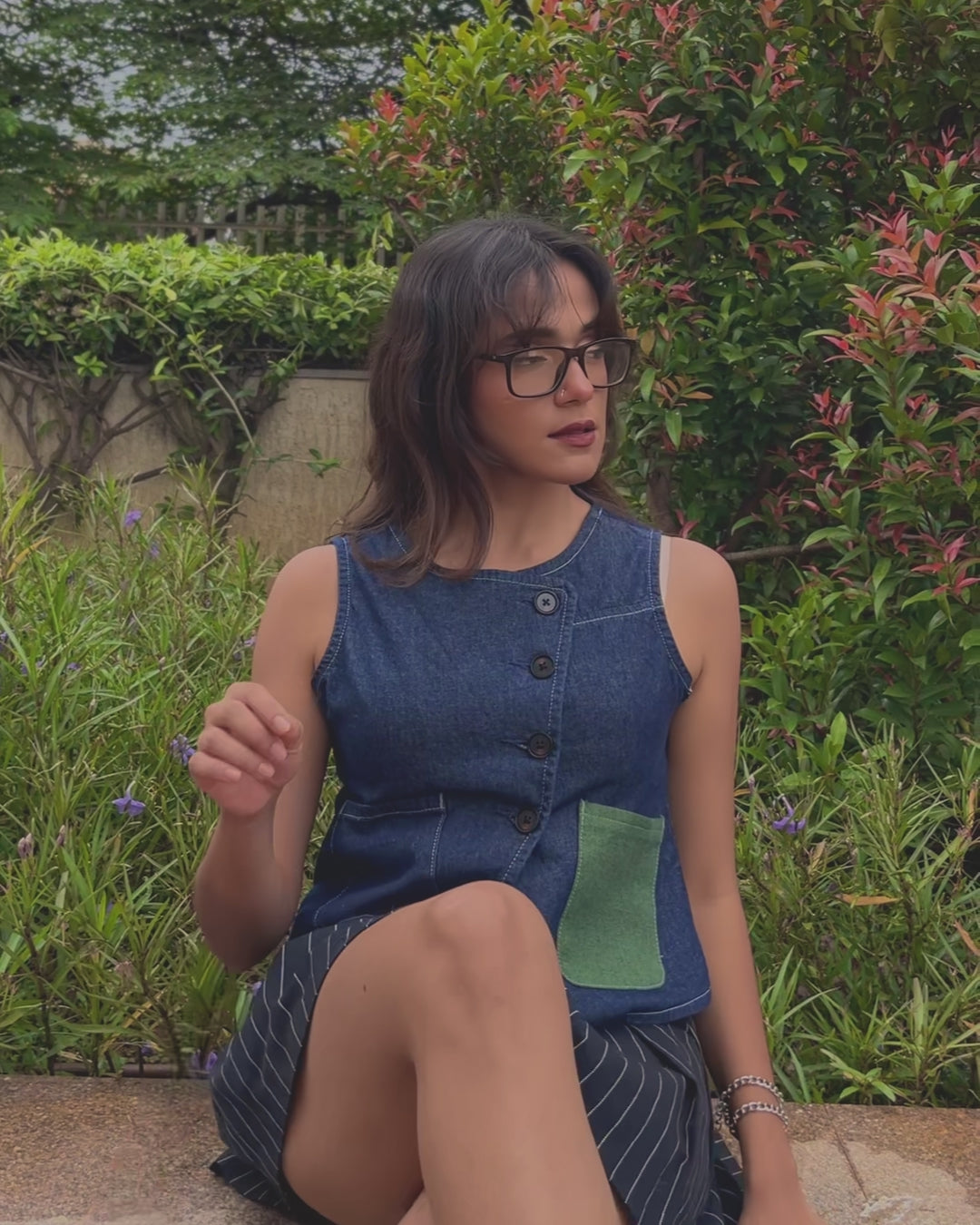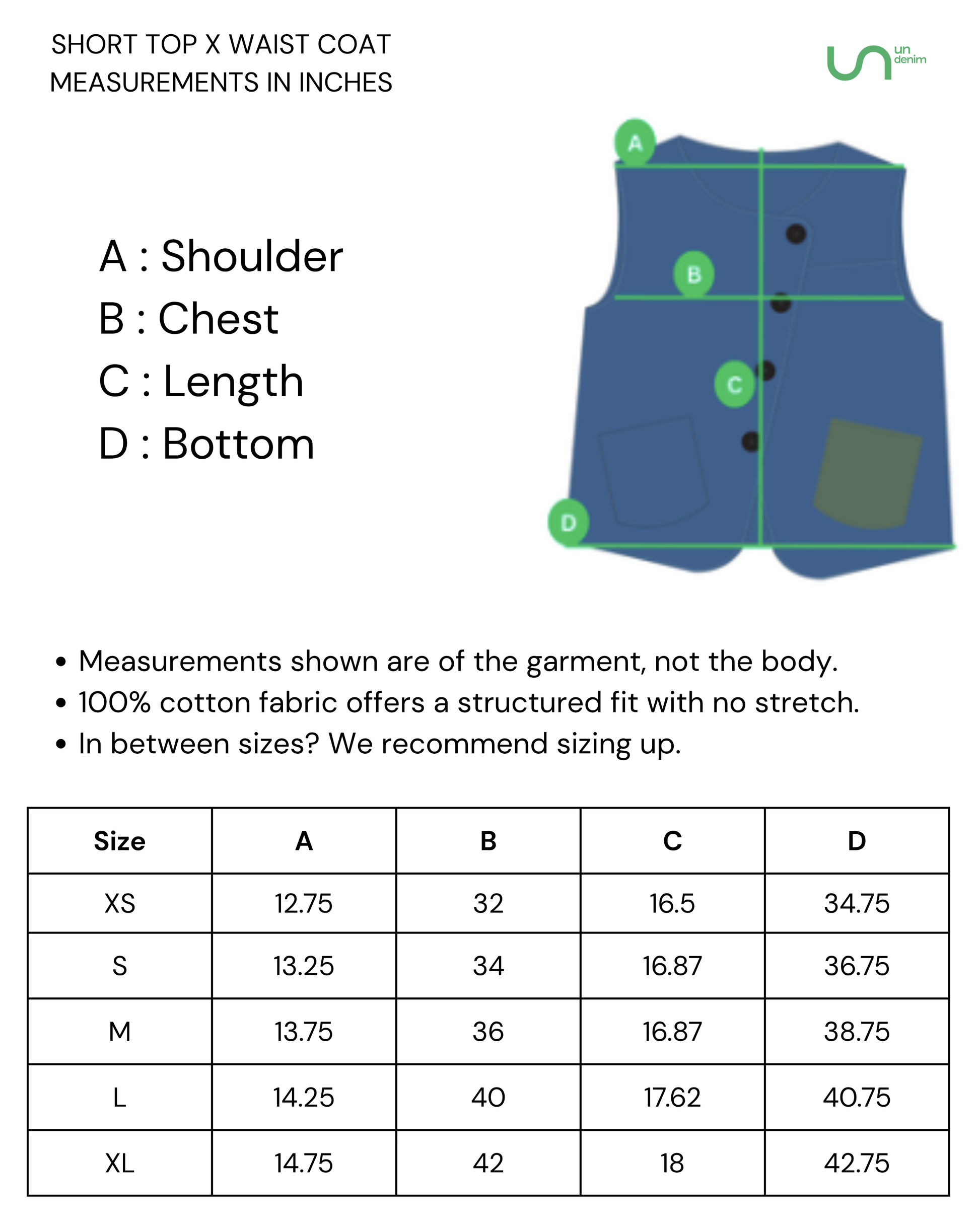 This sleeveless cropped top brings tailored sophistication with a modern edge. Its asymmetrical button closure is the defining feature, offering multiple styling options: fasten it fully for a refined boat neckline, or leave a few buttons open for a sharp, waistcoat-inspired V-neck. Designed for versatility, it works just as effortlessly layered as it does solo—taking you from day to night with ease. The structured fit hits just at the waist, pairing seamlessly with high-rise pants or skirts. Upcycled from premium rescued denim, every piece carries Un Denim’s commitment to sustainability. A contrast Green Pocket adds a bold touch, blending function with contemporary design. Wear it solo or layered—a capsule gem that adapts to your style. Pair it with a flowy long skirt for an elegant touch or distressed denim for laid-back ease.