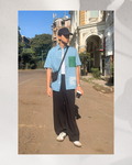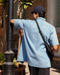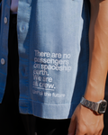 This oversized denim shirt features a straight, boxy fit with drop shoulders and half sleeves for a relaxed, modern silhouette. Crafted from soft, lightweight denim with a subtle crosshatch texture, it drapes effortlessly while holding structure. A soft light indigo wash brings an easy, lived-in feel. Un Denim's signature bold Green Pocket adds a fresh, standout contrast. Finished with light blue stitching and printed text for the planet conscious at heart, streetwear and sustainability come together seamlessly. Perfect for layering or wearing solo, pair with baggy trousers, sneakers, and shades for a stylish off-duty vibe.