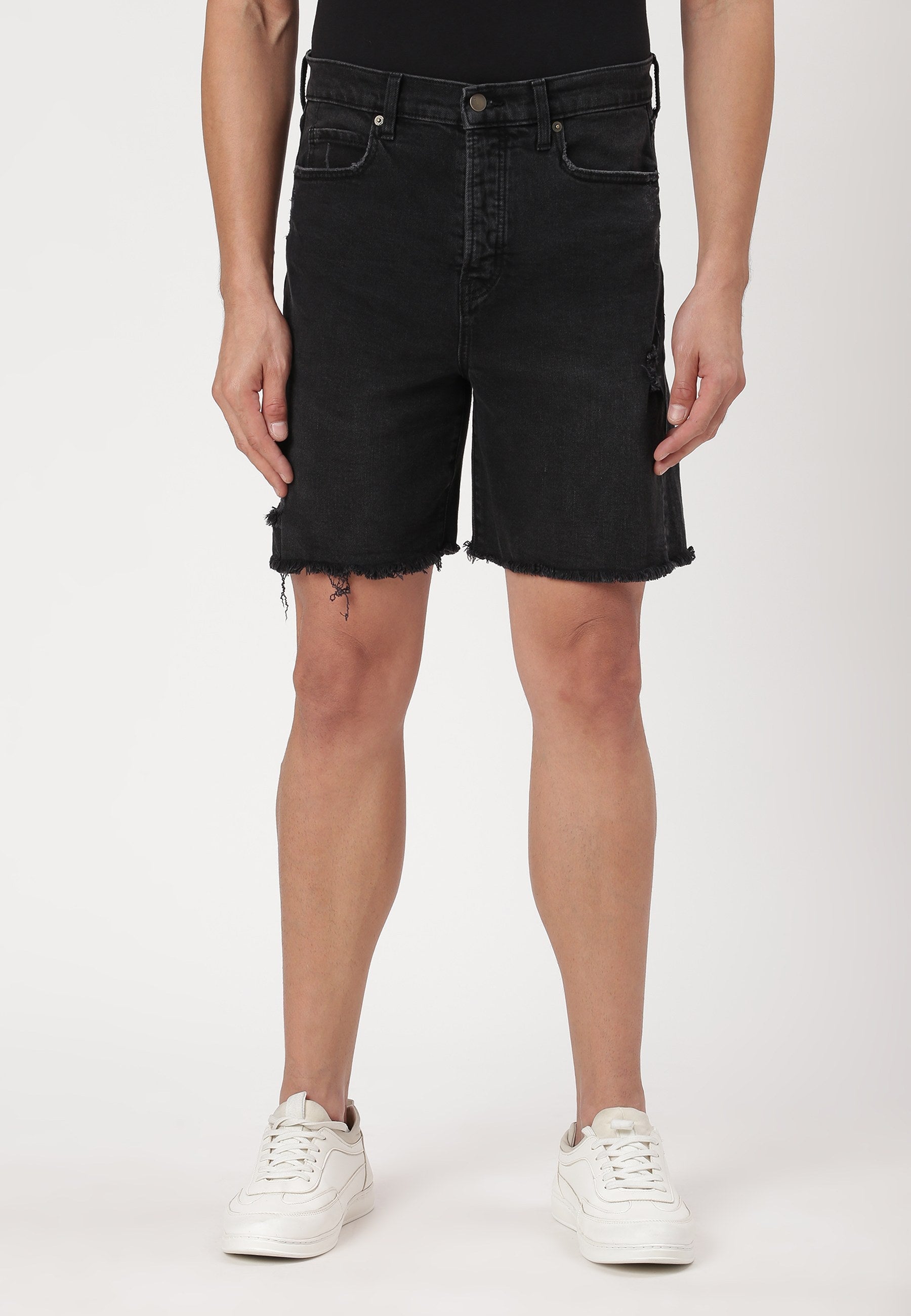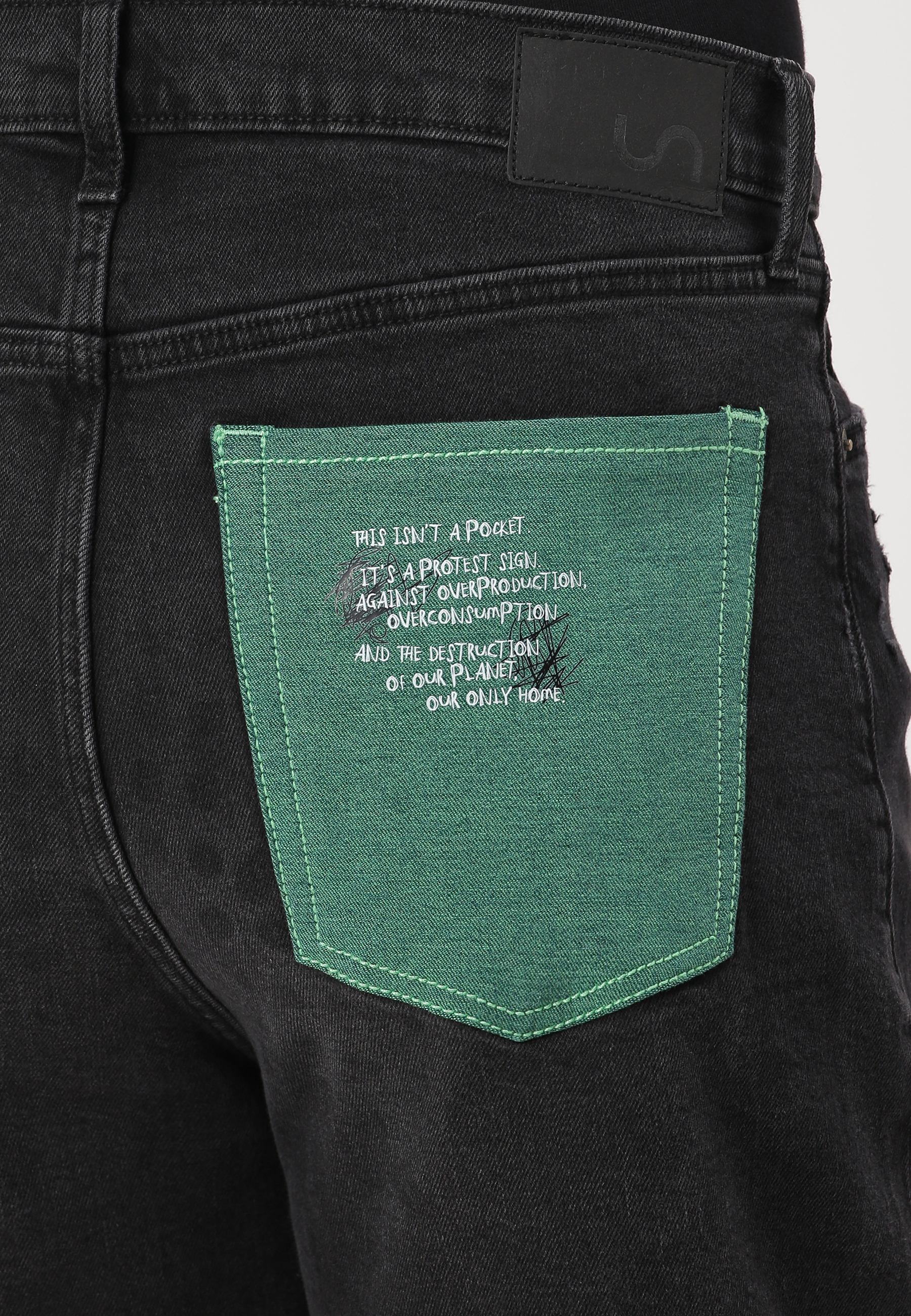Men's black bermuda denim shorts that sit high on the waist with wide leg openings. A relaxed fit around the hip and thigh. They feature Un Denim's signature GreenPocket that says - ˜This is not a green pocket, its a protest sign, against overproduction, overconsumption and the destruction of our planet, our only home.™