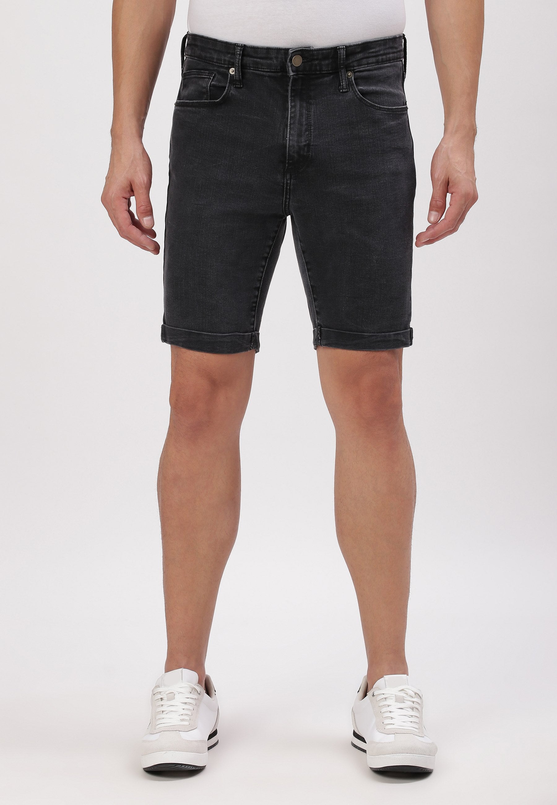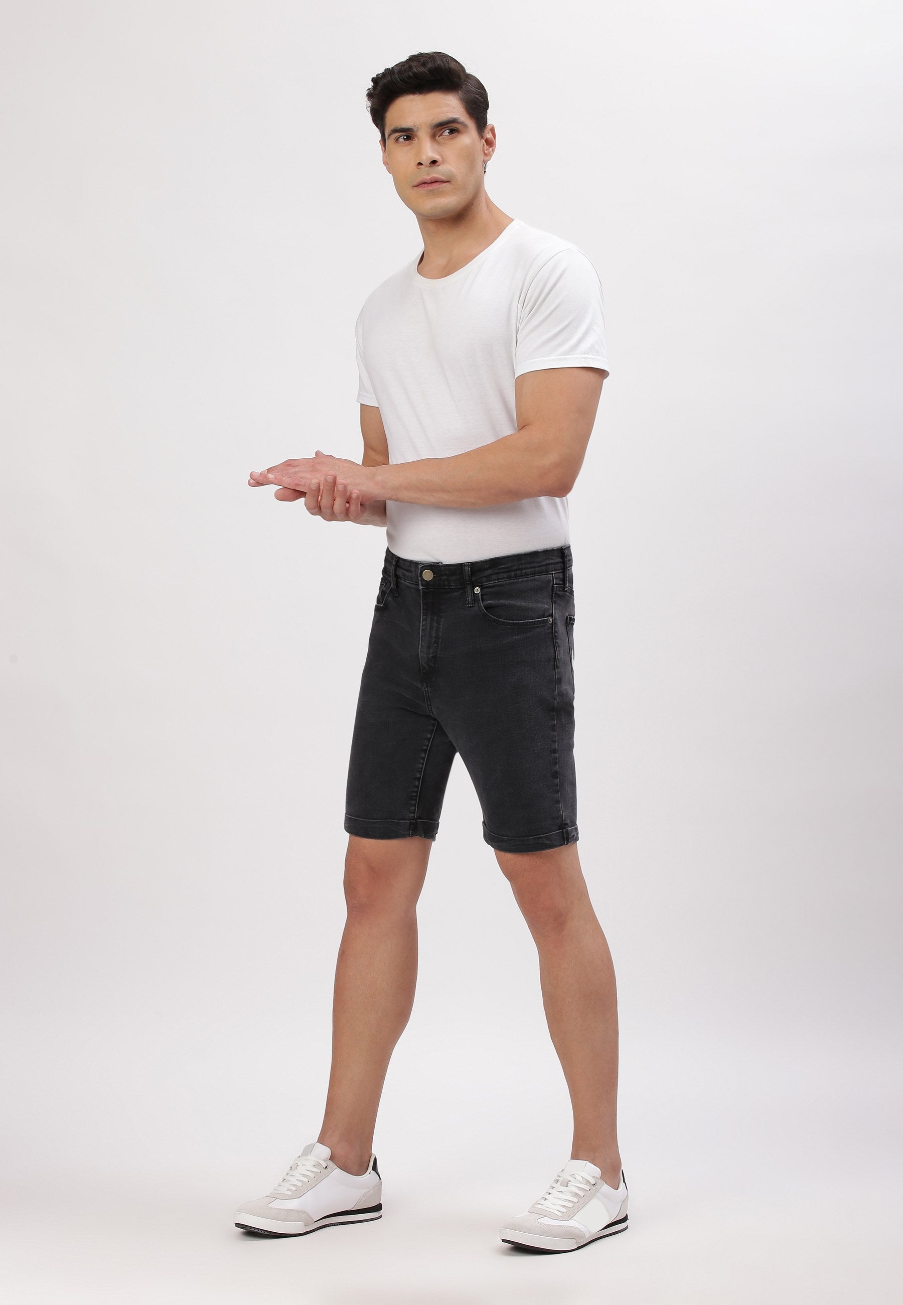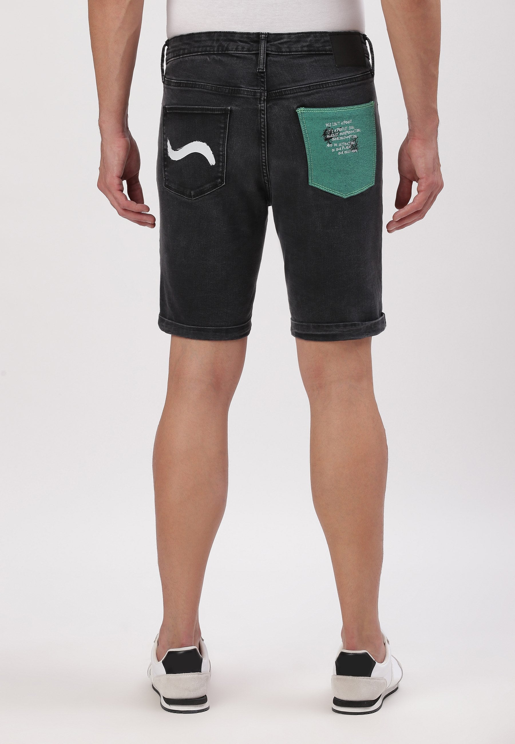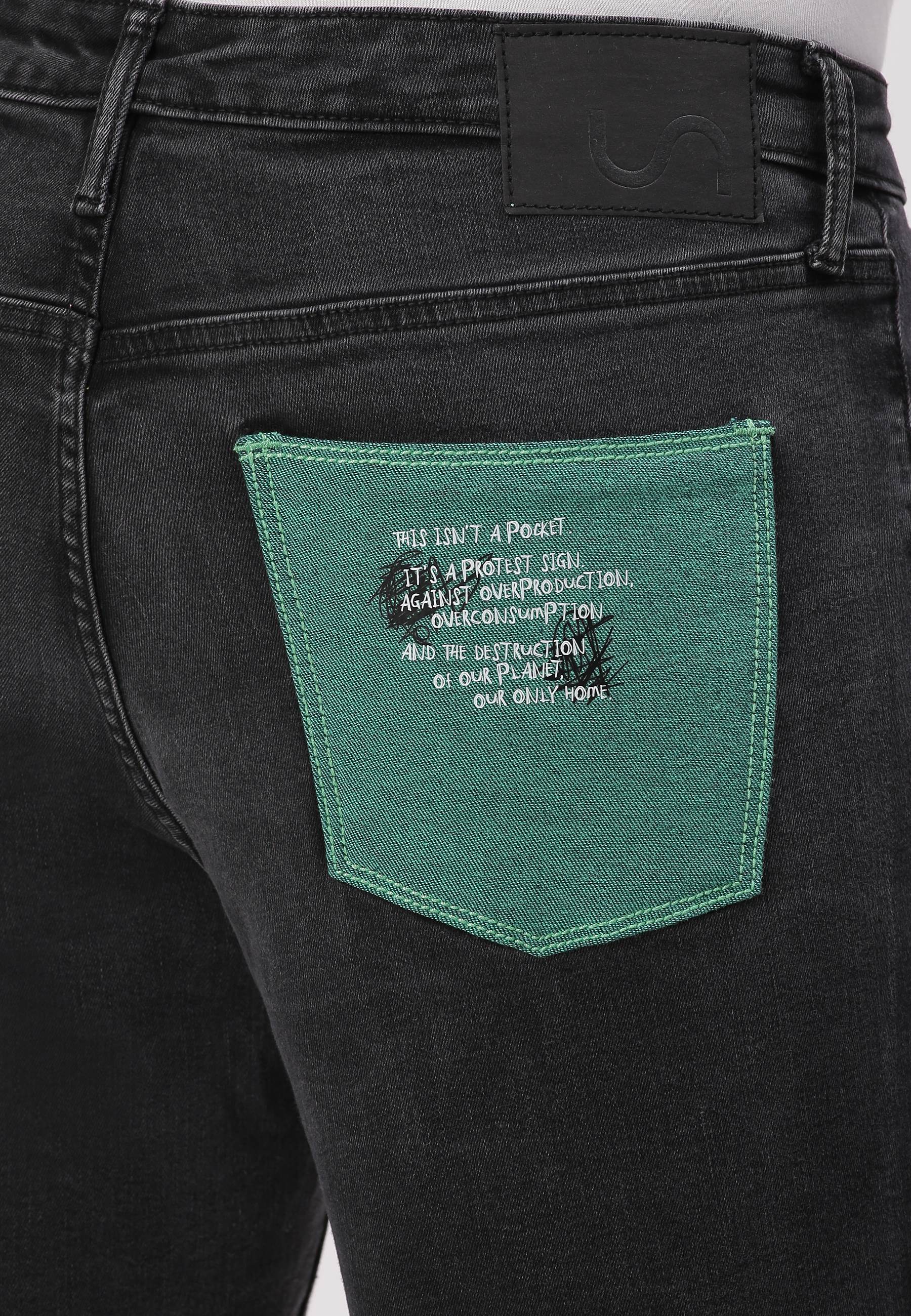 Men's black straight denim shorts that sit comfortably at the waist with narrow leg openings. They fit fuller through the hip and thigh and run straight from hip to hem. They feature Un Denim's signature GreenPocket that says - ˜This is not a green pocket, its a protest sign, against overproduction, overconsumption and the destruction of our planet, our only home.™