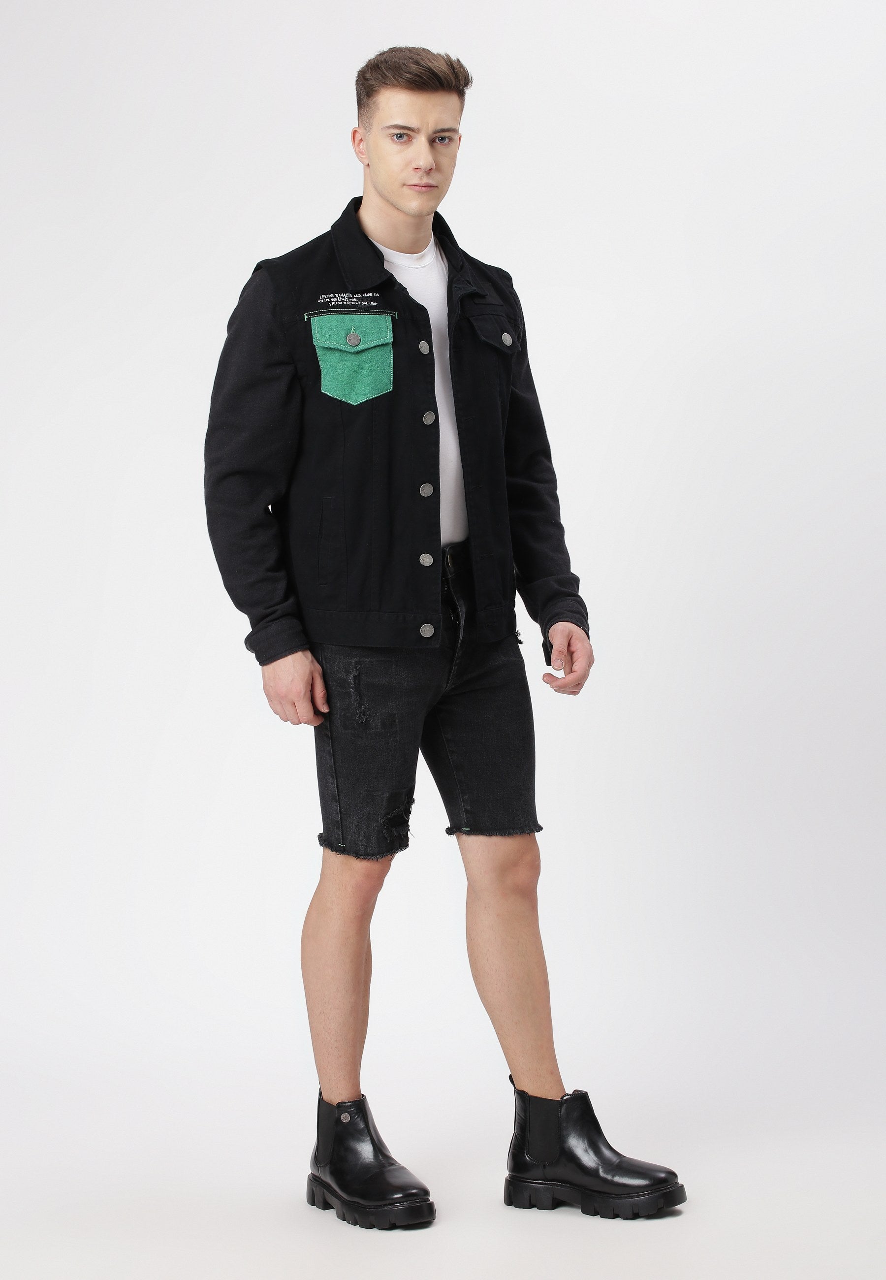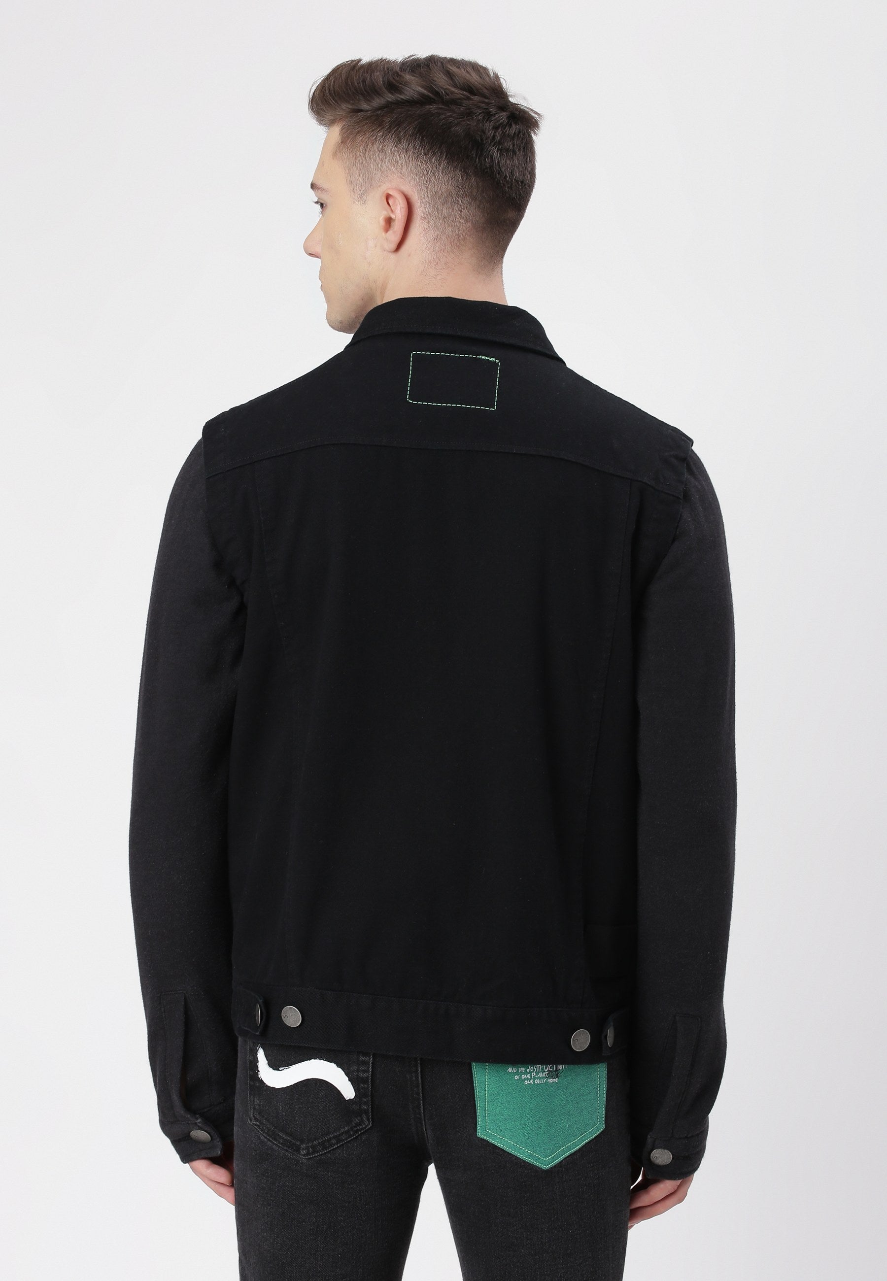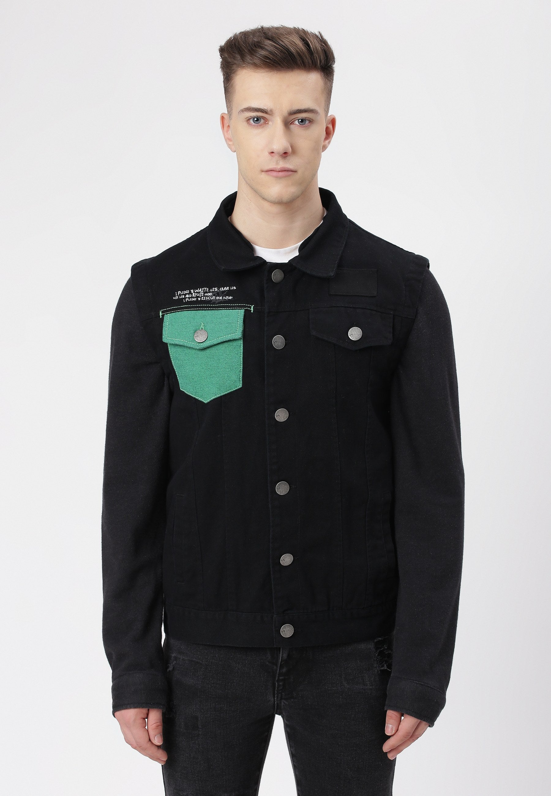 Men's black trucker denim jacket. An iconic jacket style with a slim casual cut, spread collar, pointed flap chest pockets, button tab waist adjusters, and two V-shaped seams that run from chest pocket to waist. It features Un Denim's signature GreenPocket™ that says - ‘I pledge to waste less, crave less, use less and reuse more. I pledge to rescue our future.'