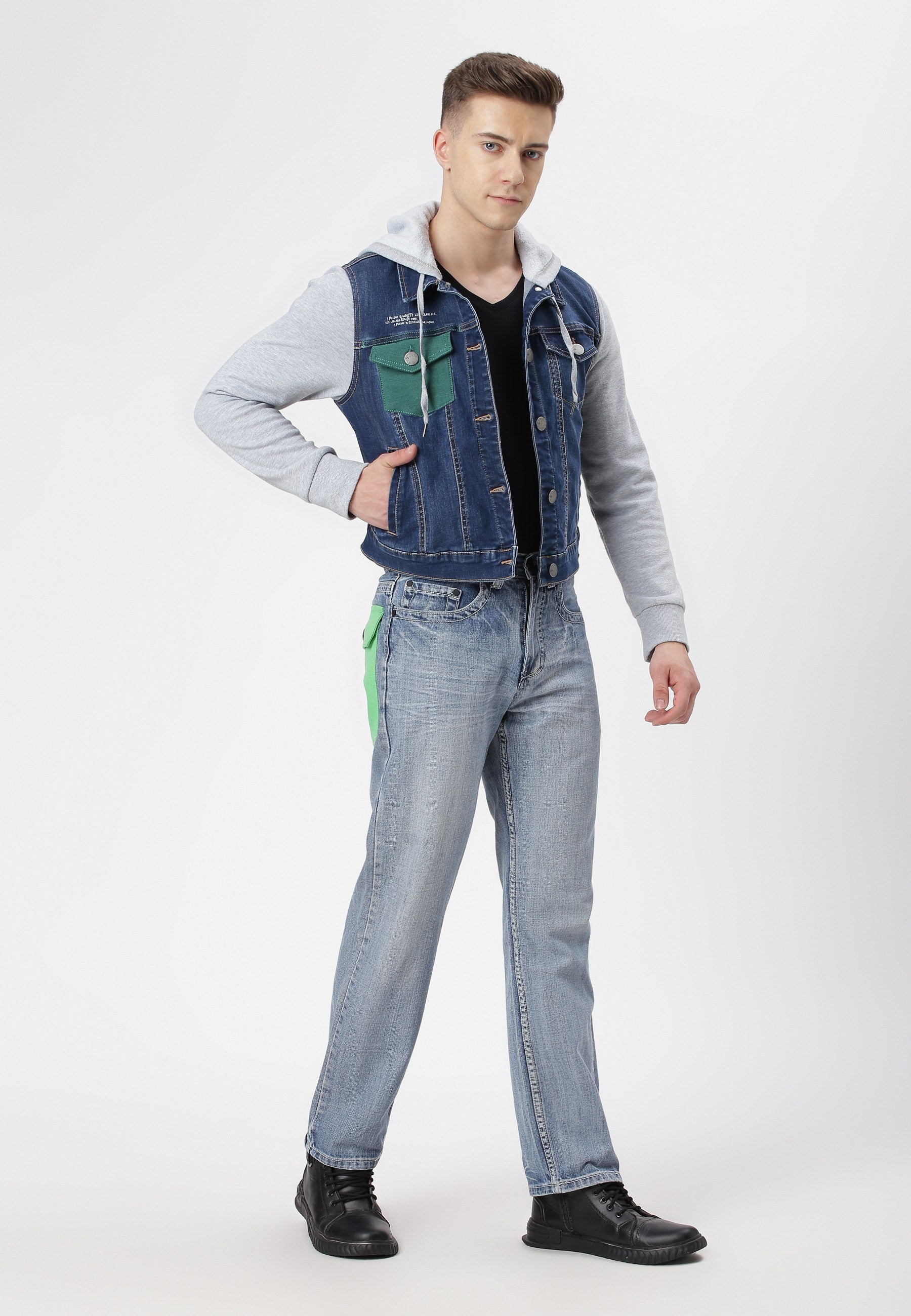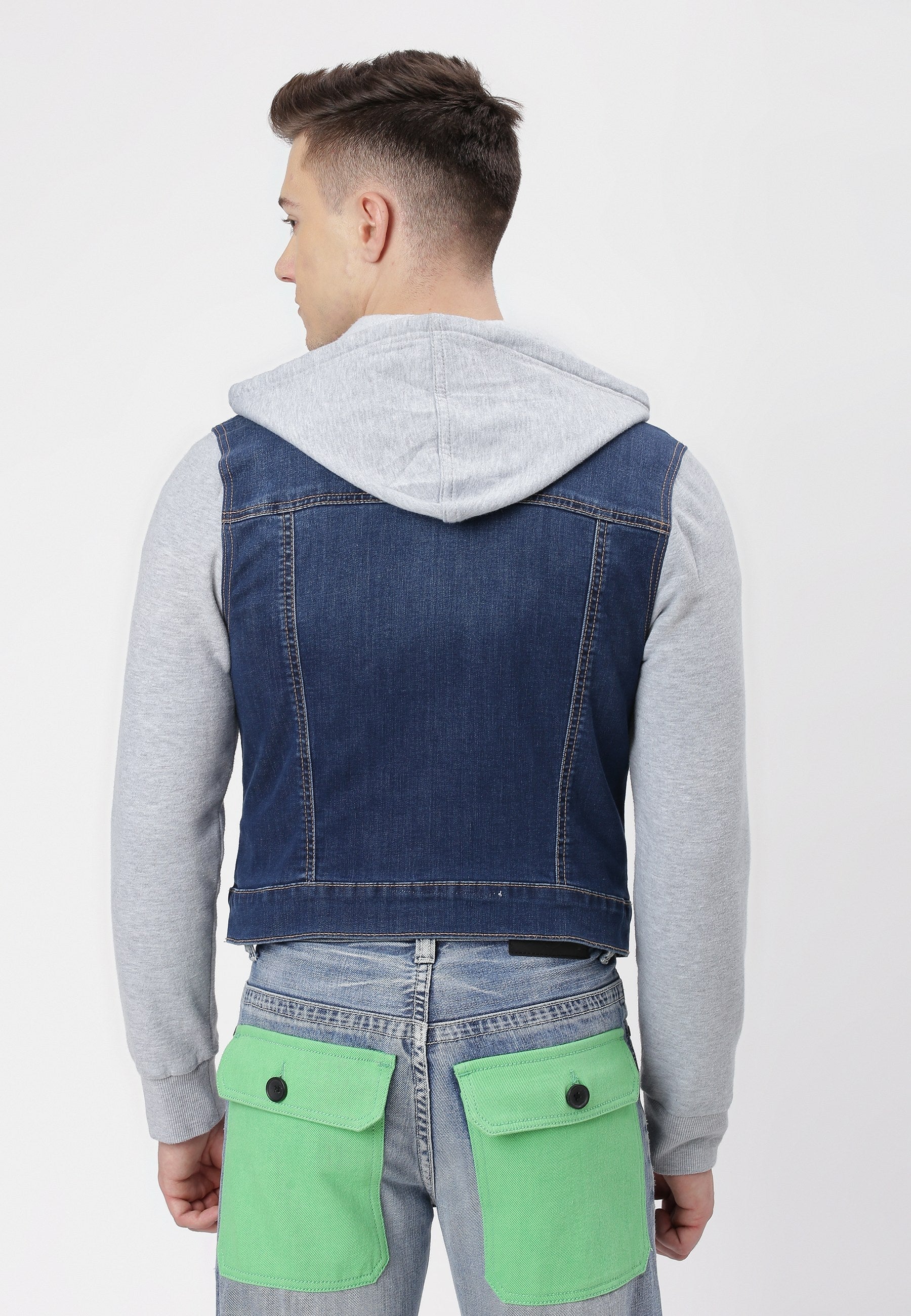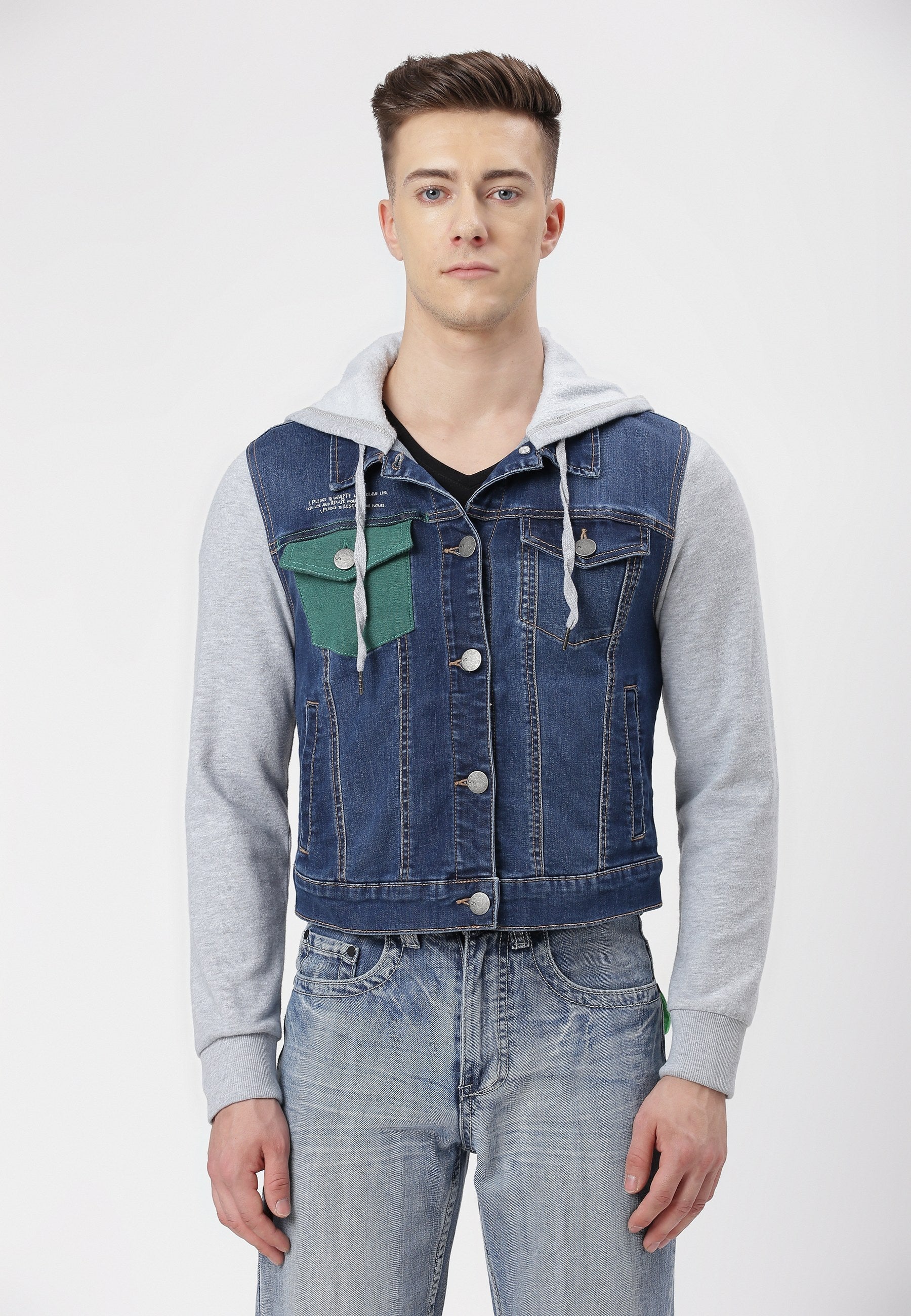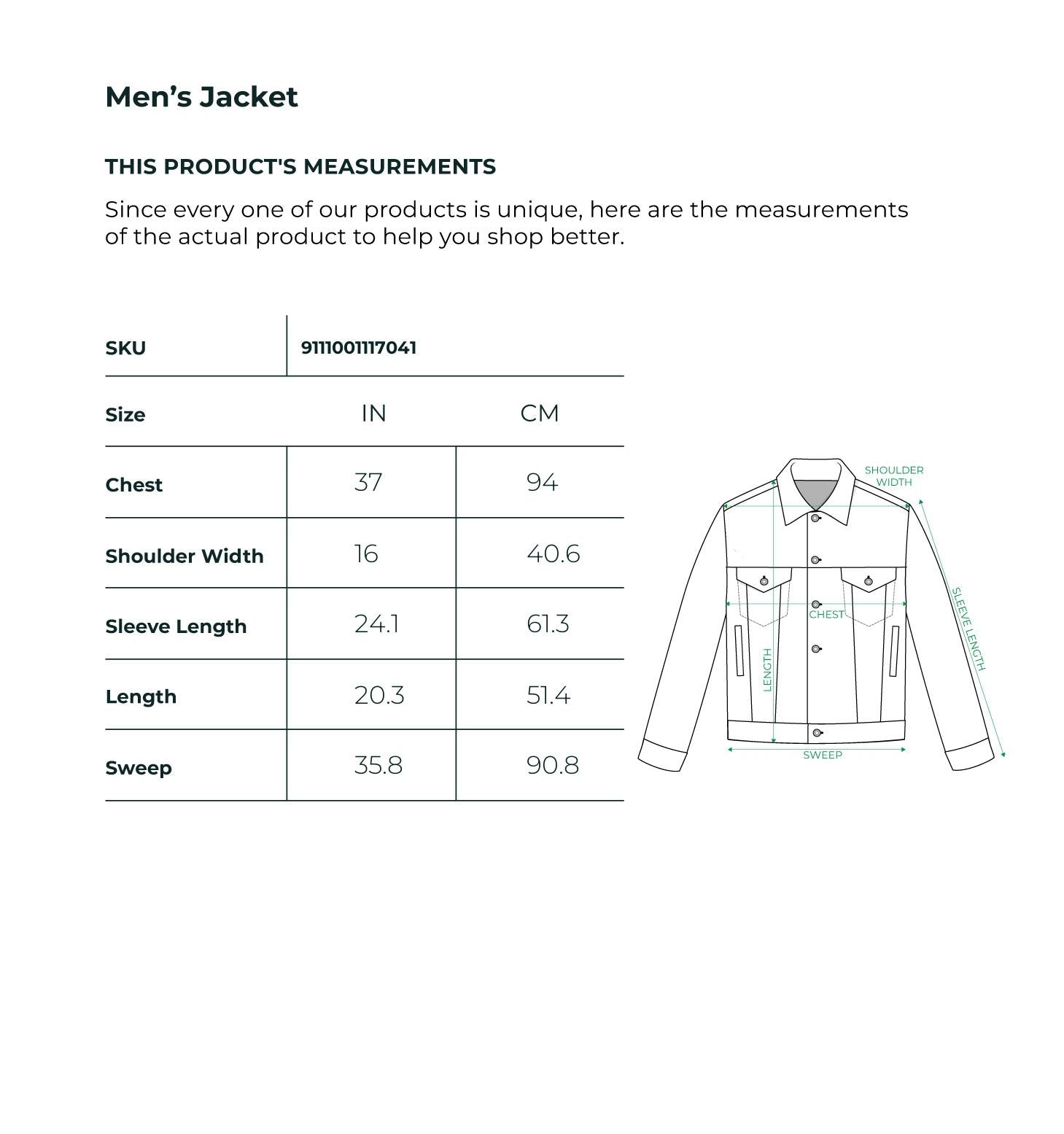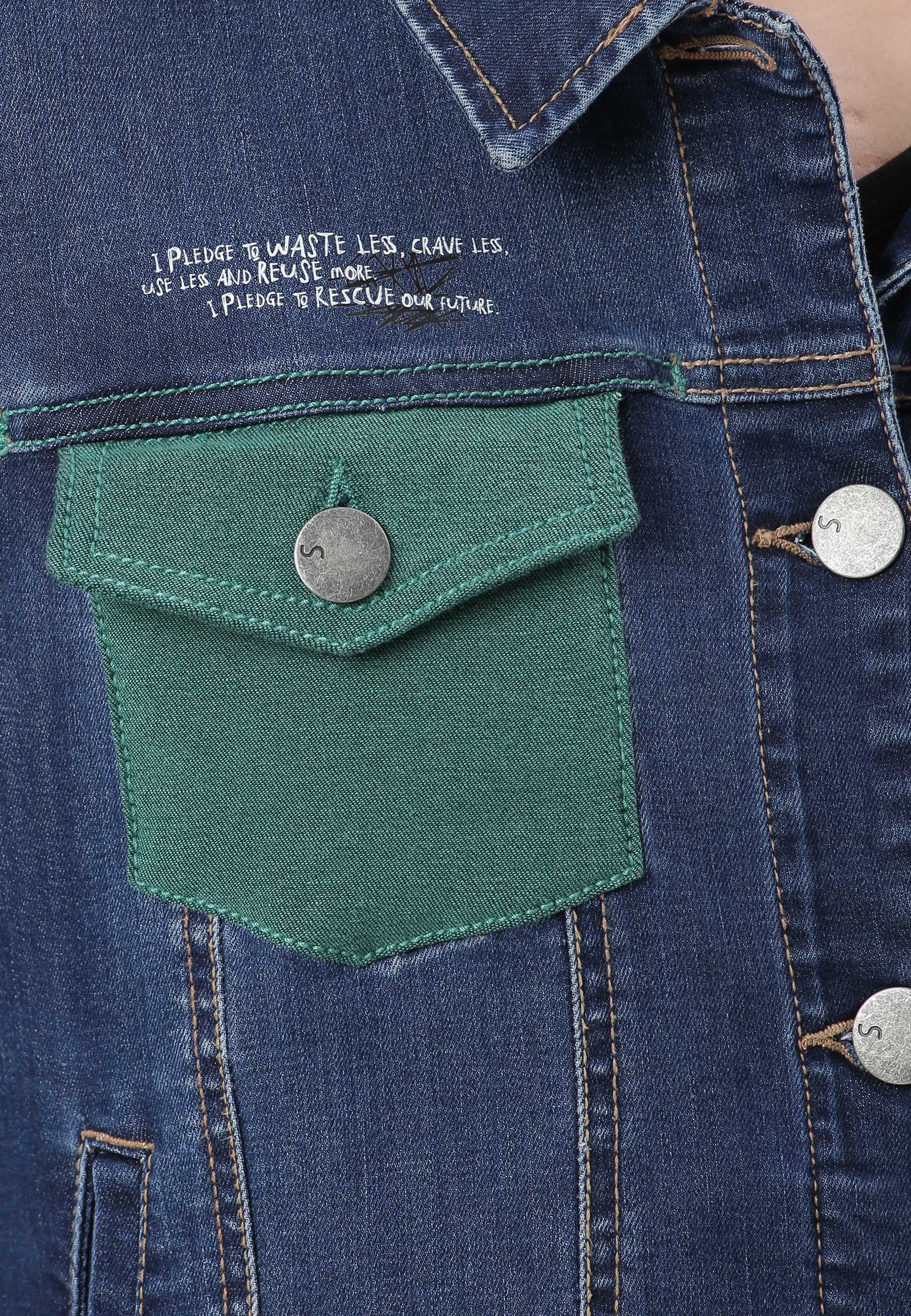 Men's dark indigo trucker denim jacket. An iconic jacket style with a slim casual cut, spread collar, pointed flap chest pockets, button tab waist adjusters, and two V-shaped seams that run from chest pocket to waist. It features a deep green pocket that says - ‘I pledge to waste less, crave less, use less and reuse more. I pledge to rescue our future.'