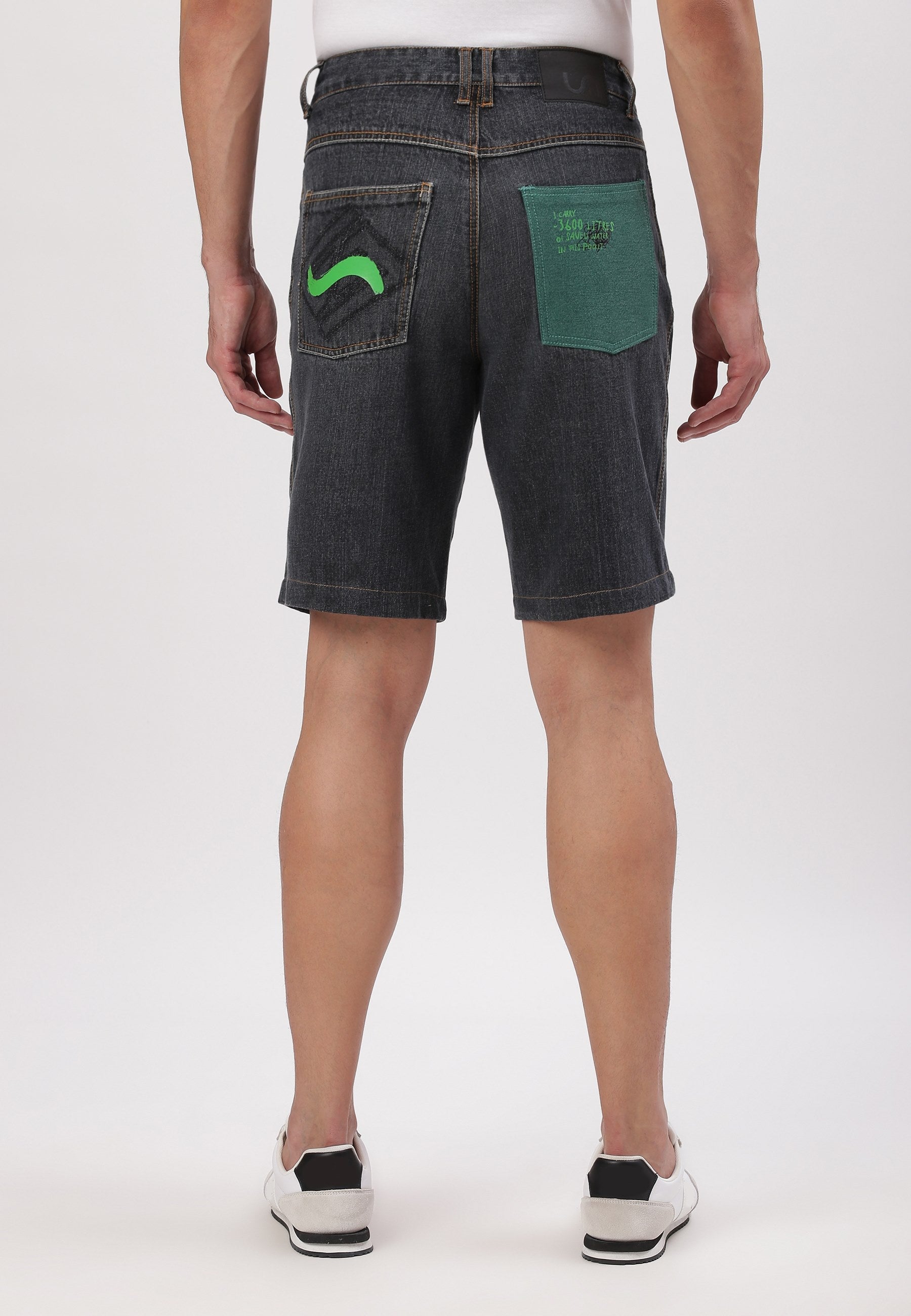 Men's dark indigo bermuda denim shorts that sit high on the waist with wide leg openings. A relaxed fit around the hip and thigh. They feature a deep green back pocket that says - ˜I carry ~3600 litres of saved water in this pocket.™