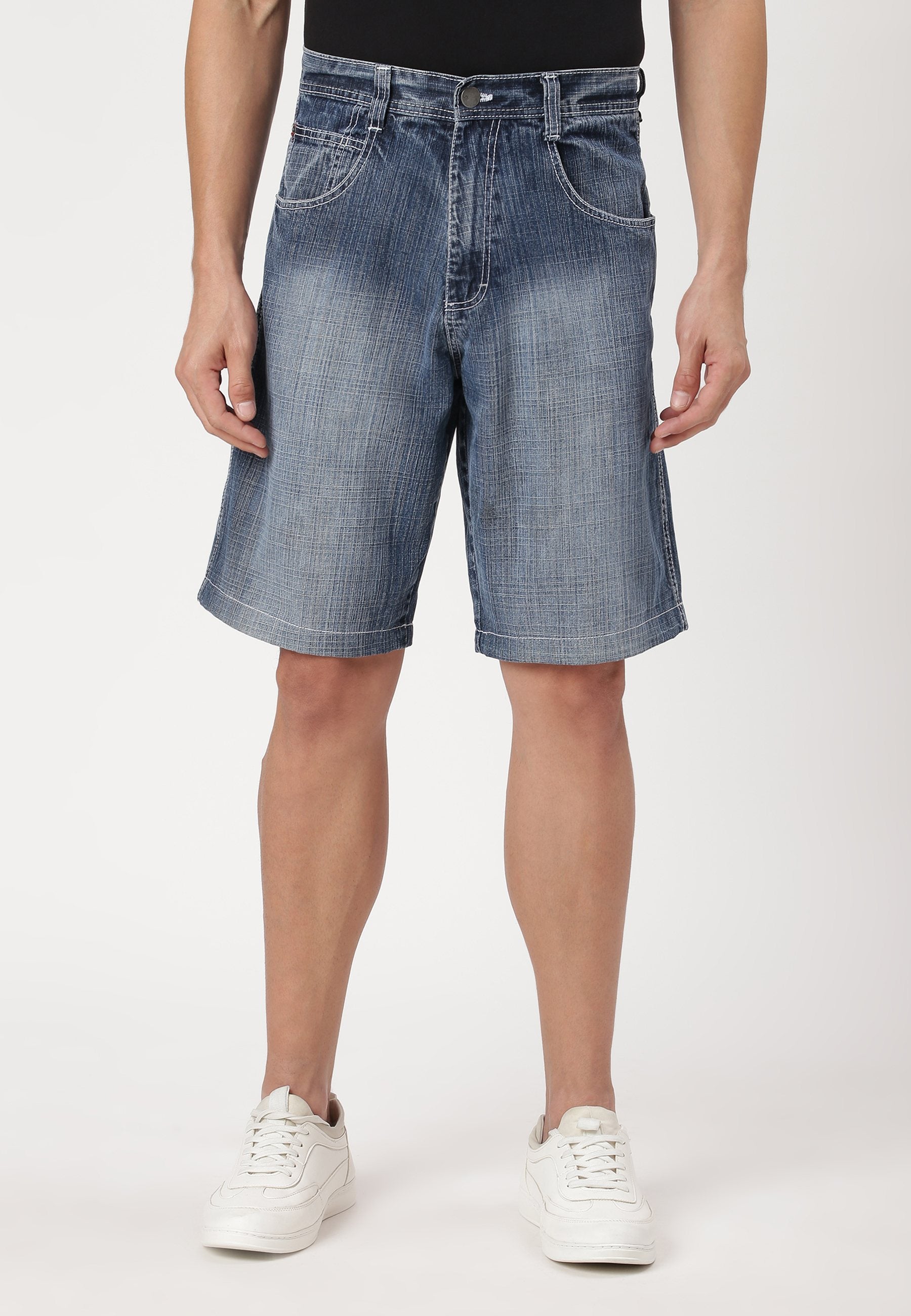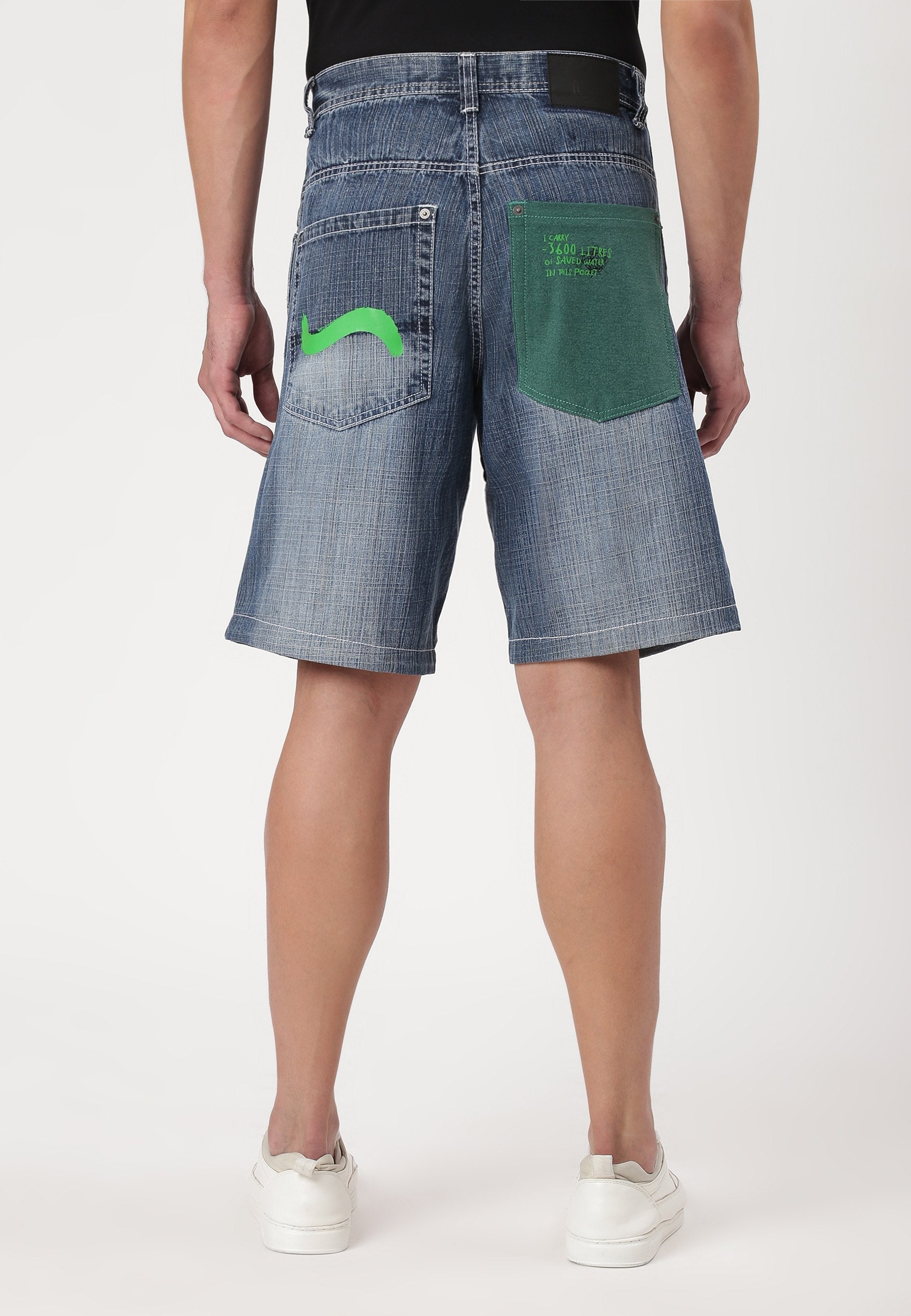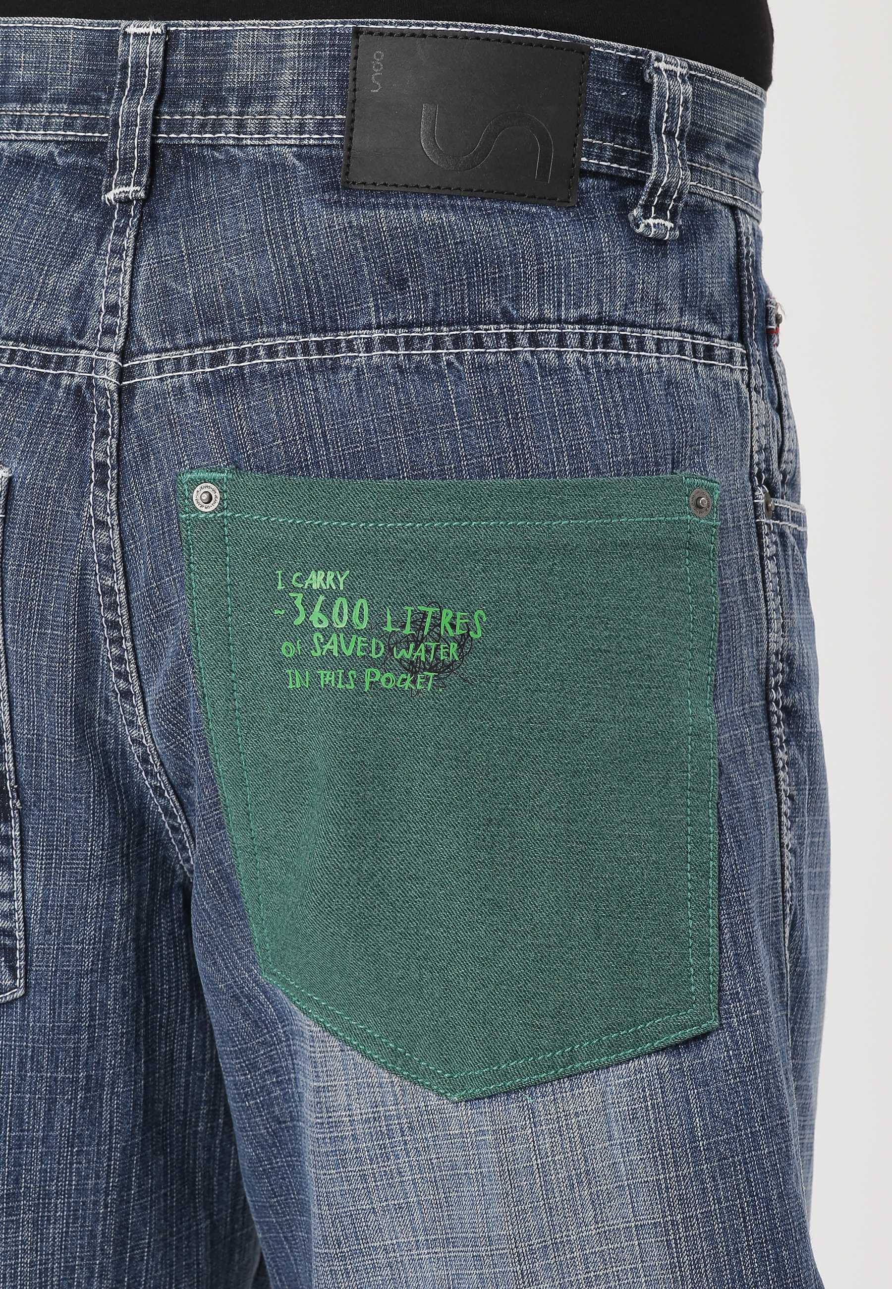 Men's dark indigo bermuda denim shorts that sit high on the waist with wide leg openings. A relaxed fit around the hip and thigh. They feature a deep green back pocket that says - ‘I carry ~3600 litres of saved water in this pocket.’