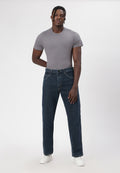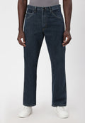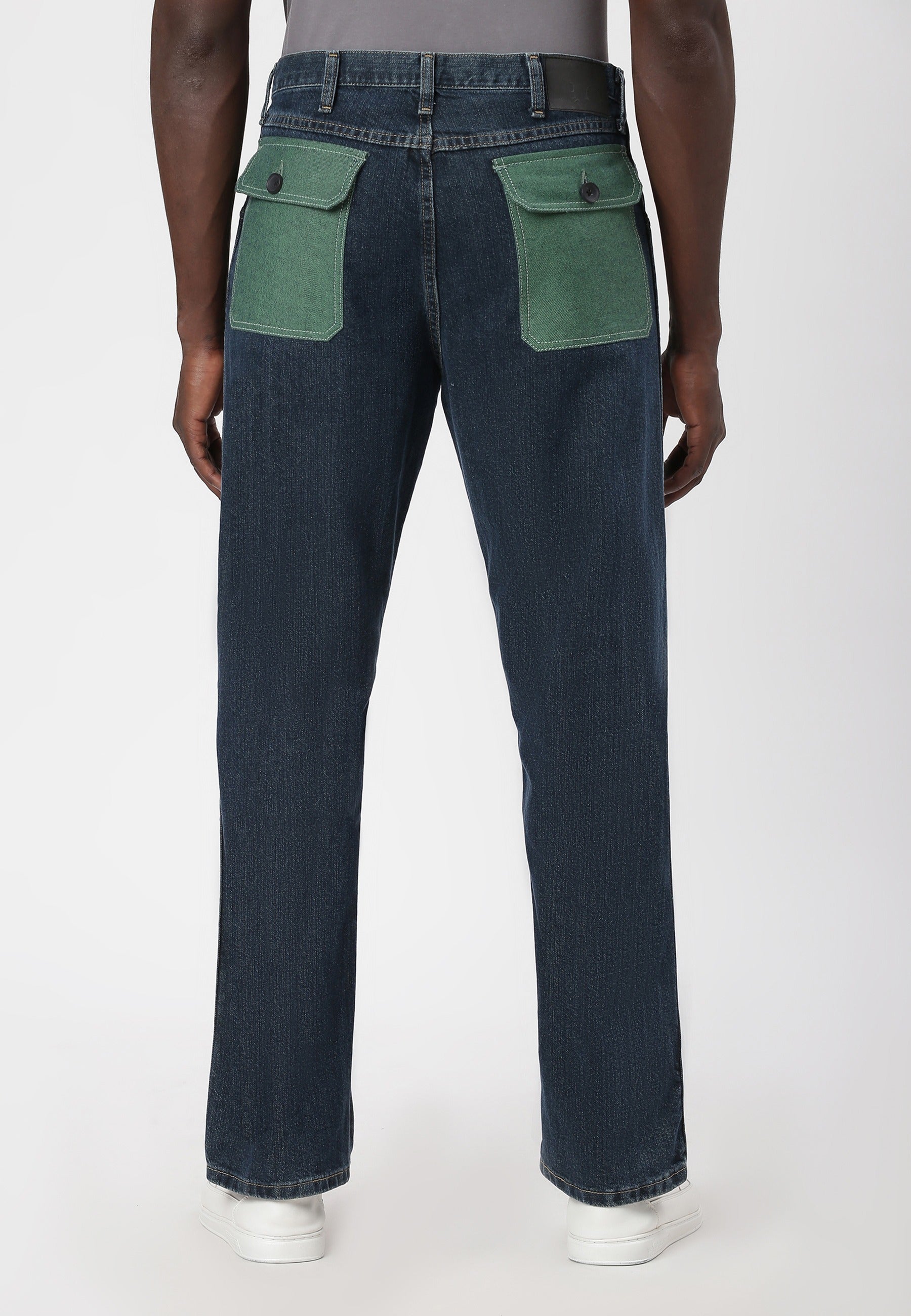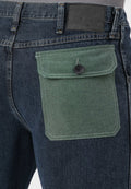 Men's dark indigo straight jeans that sit high on the waist with narrow leg openings. They fit fuller through the hip and thigh and run straight from hip to ankle. They come with bold, earthy green back pockets.