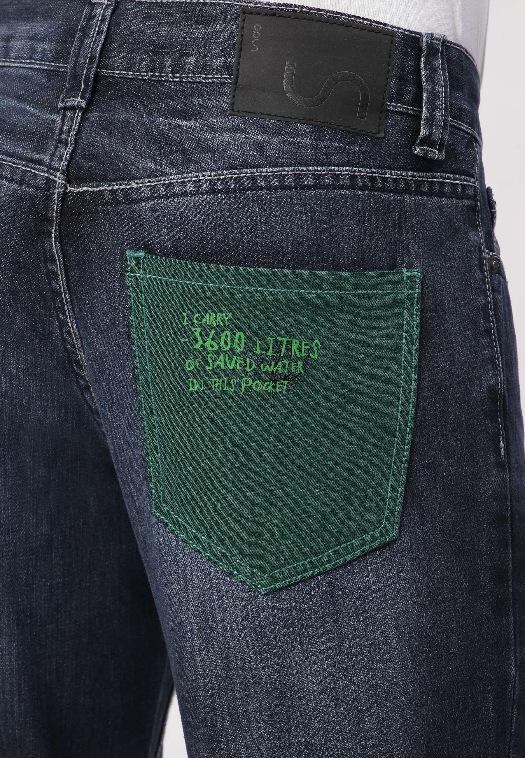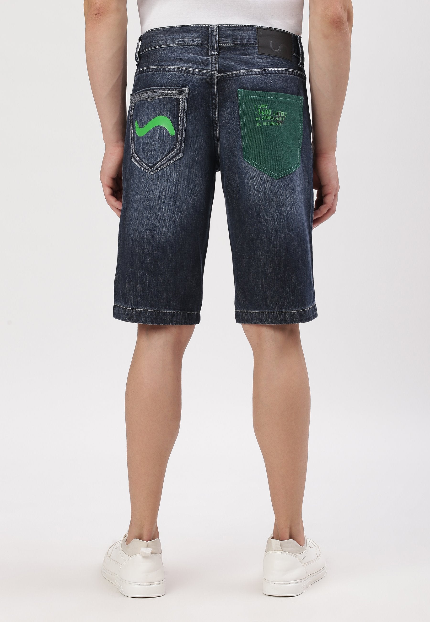 Men's dark indigo bermuda denim shorts that sit low on waist with wide leg openings. A relaxed fit around the hip and thigh. They feature a deep green back pocket that says - ˜I carry ~3600 litres of saved water in this pocket.™