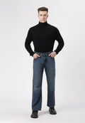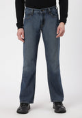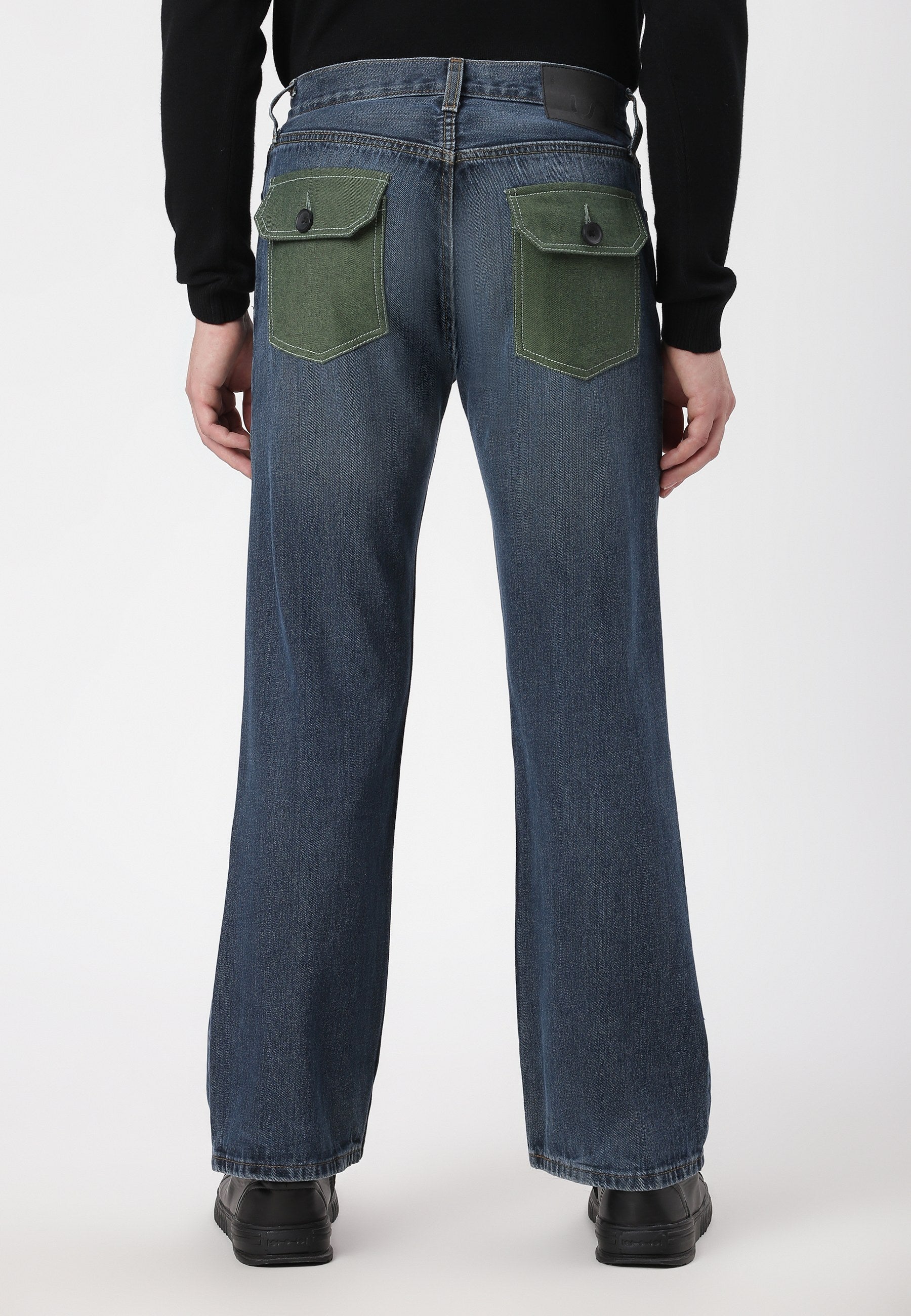 Men's dark indigo bootcut jeans that sit low on waist with wide leg openings. They fit snugly through the thigh and flare out from the knee. They come with bold, earthy green back pockets.