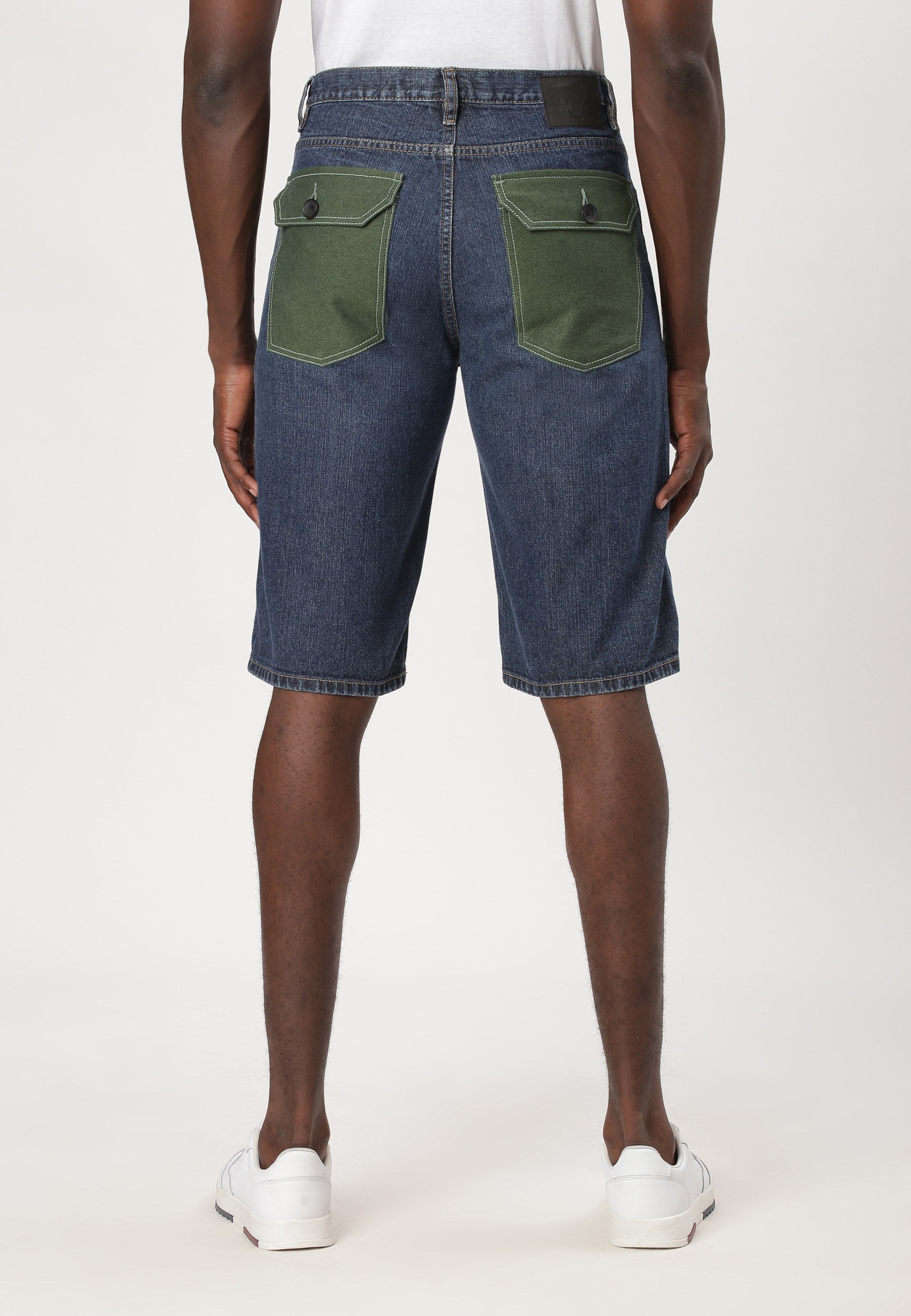 Men's dark indigo bermuda denim shorts that sit comfortably at the waist with wide leg openings. A relaxed fit around the hip and thigh. They come with bold, earthy green back pockets.