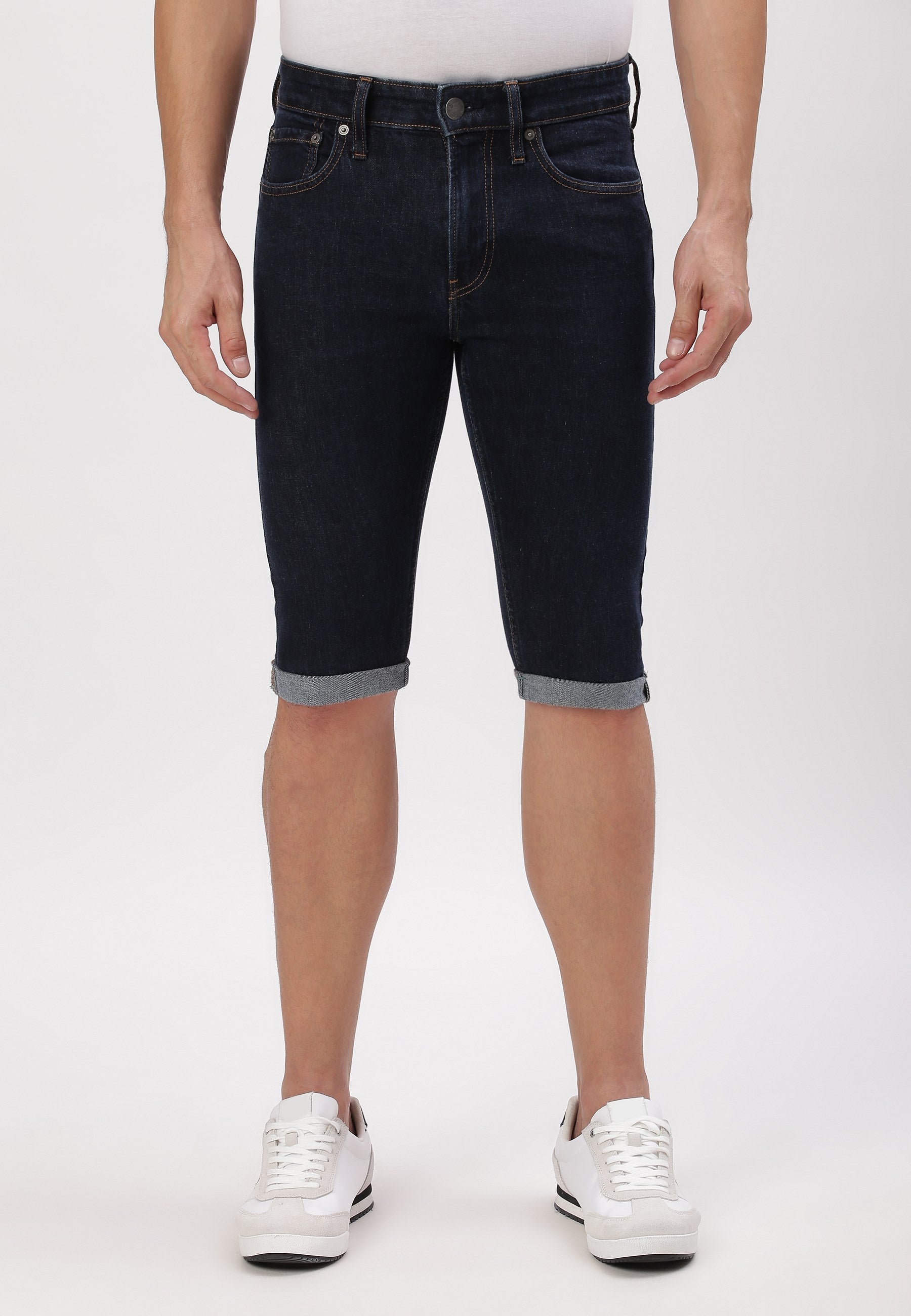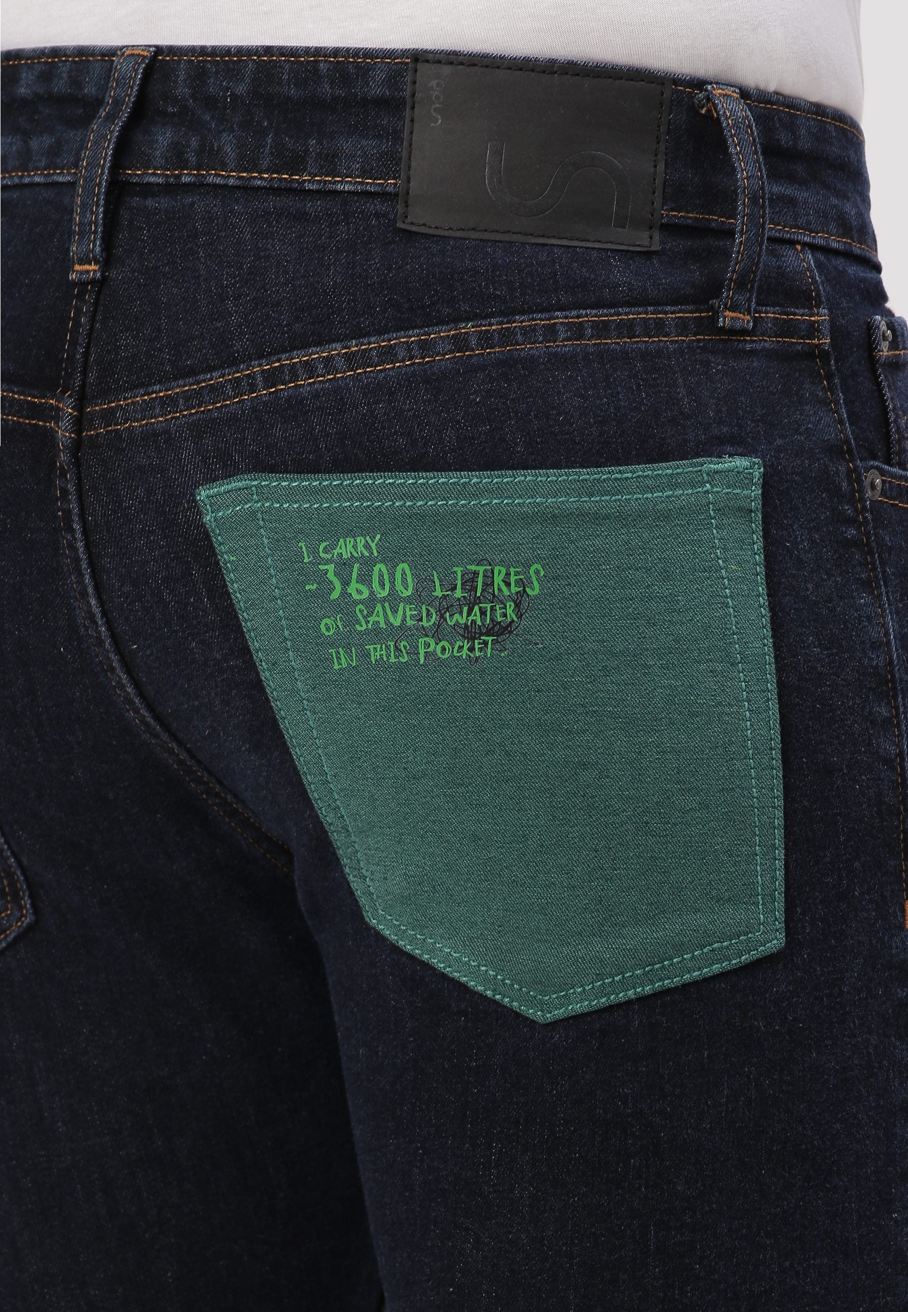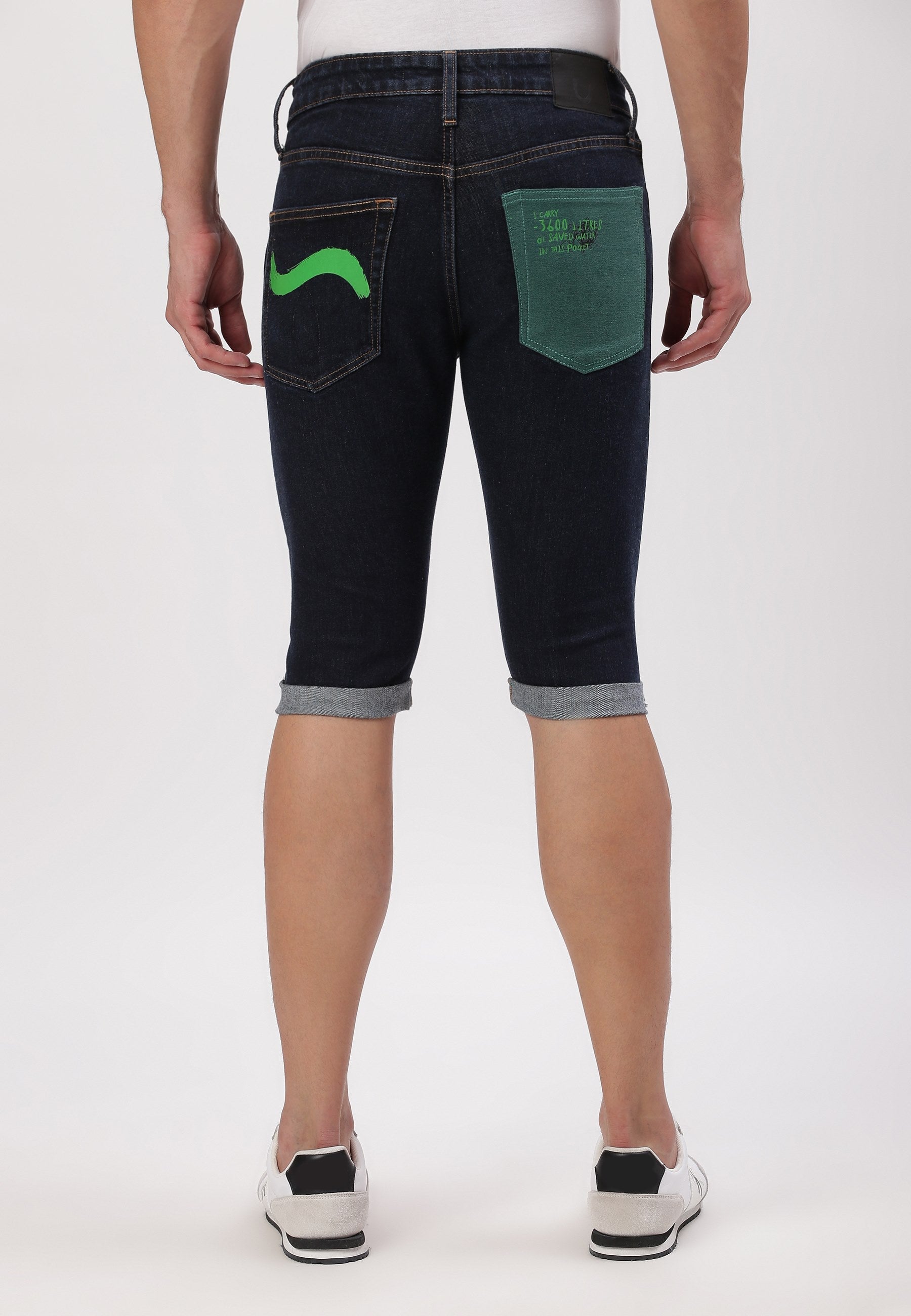 Men's dark indigo slim denim shorts that sit comfortably at the waist with narrow leg openings. They slim through the thigh and taper slightly towards knee. They feature a deep green back pocket that says - ‘I carry ~3600 litres of saved water in this pocket.’