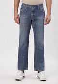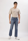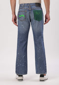 Men's dark indigo straight jeans that sit comfortably at the waist with narrow leg openings. They fit fuller through the hip and thigh and run straight from hip to ankle. They feature a deep green back pocket that says - ‘I carry ~3600 litres of saved water in this pocket.’