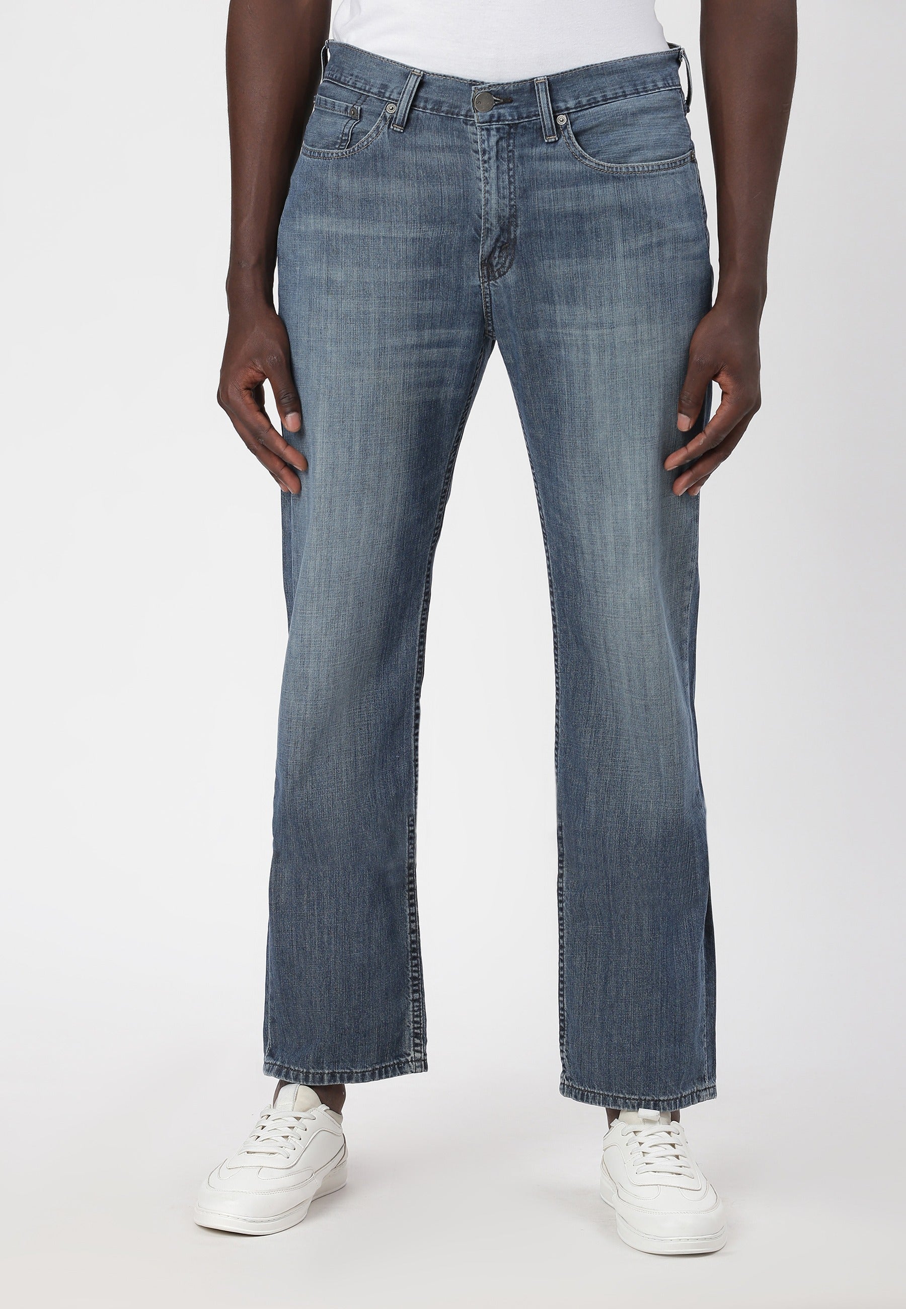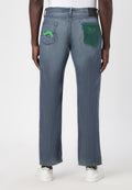 Men's dark indigo straight jeans that sit comfortably at the waist with narrow leg openings. They fit fuller through the hip and thigh and run straight from hip to ankle. They feature a deep green back pocket that says - ‘I carry ~3600 litres of saved water in this pocket.’