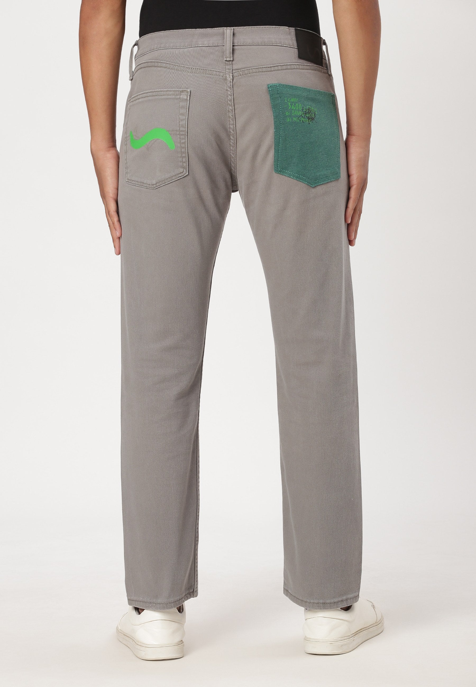 Men's dark indigo straight jeans that sit comfortably at the waist with narrow leg openings. They fit fuller through the hip and thigh and run straight from hip to ankle. They feature a deep green back pocket that says - I carry ~3600 litres of saved water in this pocket.™