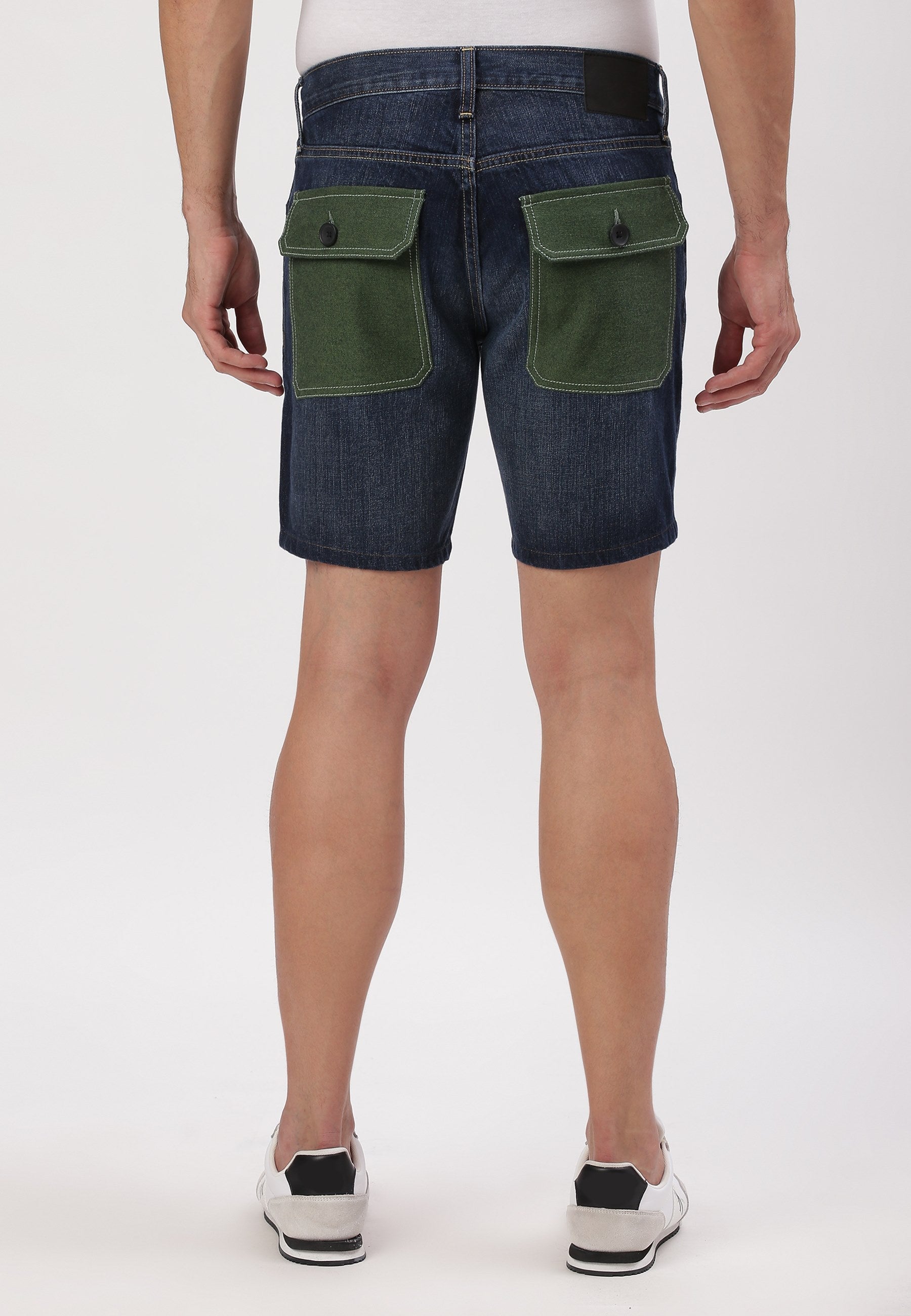 Men's dark indigo straight denim shorts that sit comfortably at the waist with narrow leg openings. They fit fuller through the hip and thigh and run straight from hip to hem. They come with bold, earthy green back pockets.