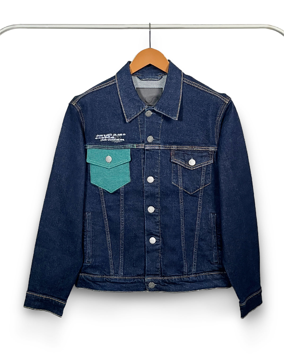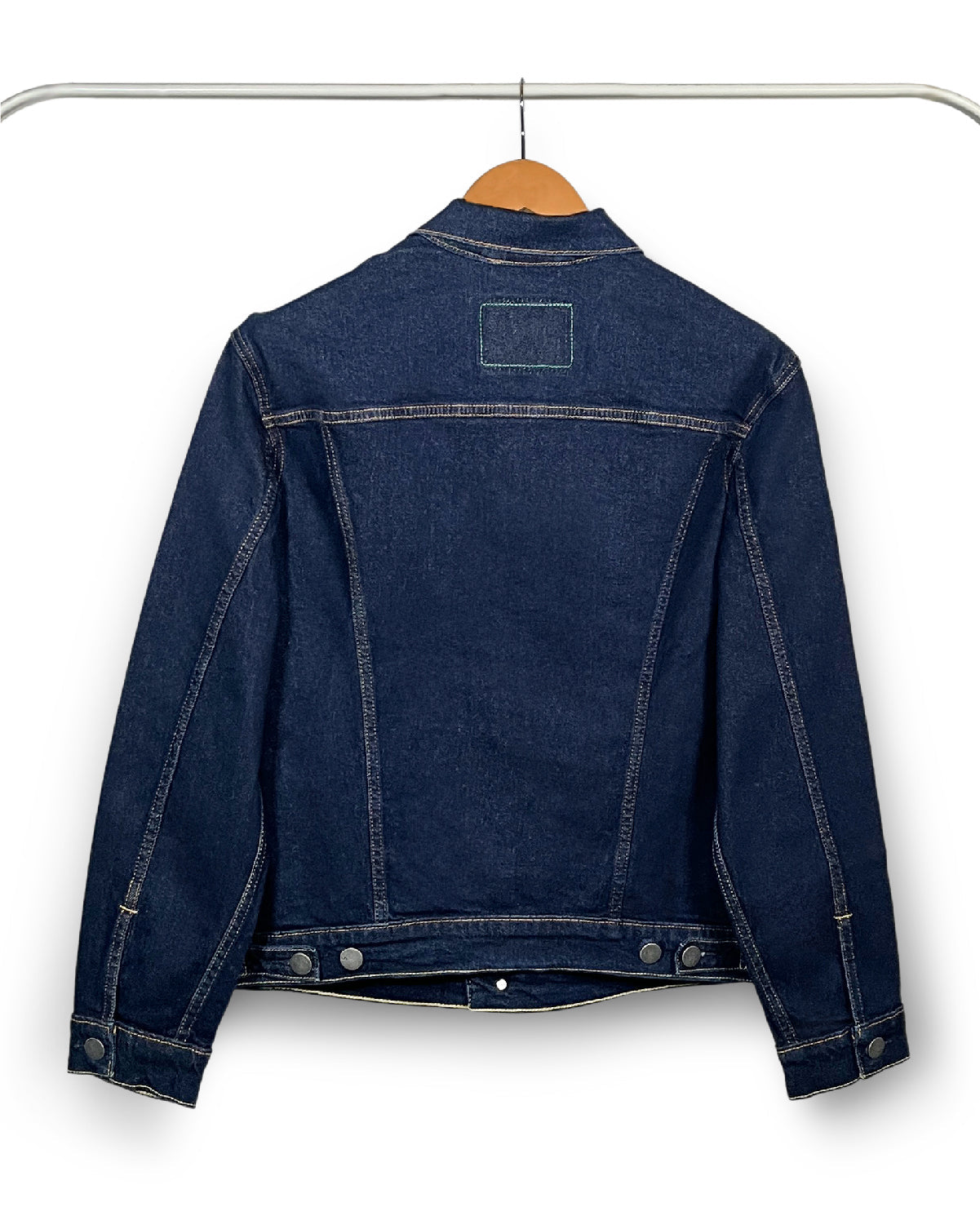 Men's dark indigo trucker denim jacket. An iconic jacket style with a slim casual cut, spread collar, pointed flap chest pockets, button tab waist adjusters, and two V-shaped seams that run from chest pocket to waist. It features a deep green pocket that says - ‘I pledge to waste less, crave less, use less and reuse more. I pledge to rescue our future.'