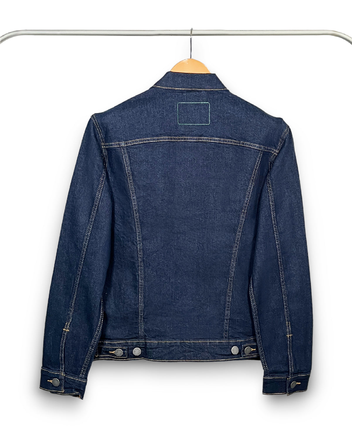 Men's dark indigo trucker denim jacket. An iconic jacket style with a slim casual cut, spread collar, pointed flap chest pockets, button tab waist adjusters, and two V-shaped seams that run from chest pocket to waist. It features a deep green pocket that says - ‘I pledge to waste less, crave less, use less and reuse more. I pledge to rescue our future.'