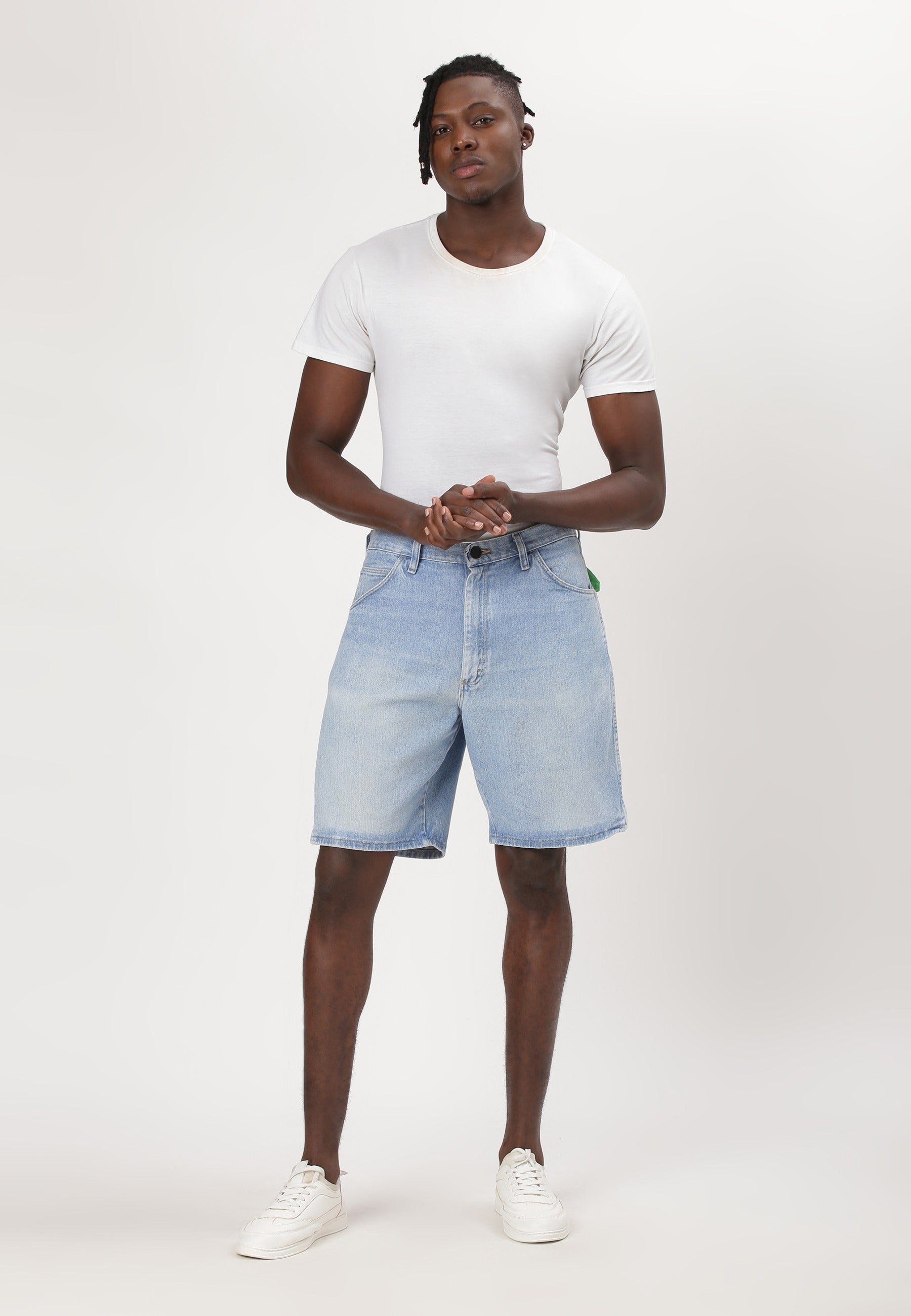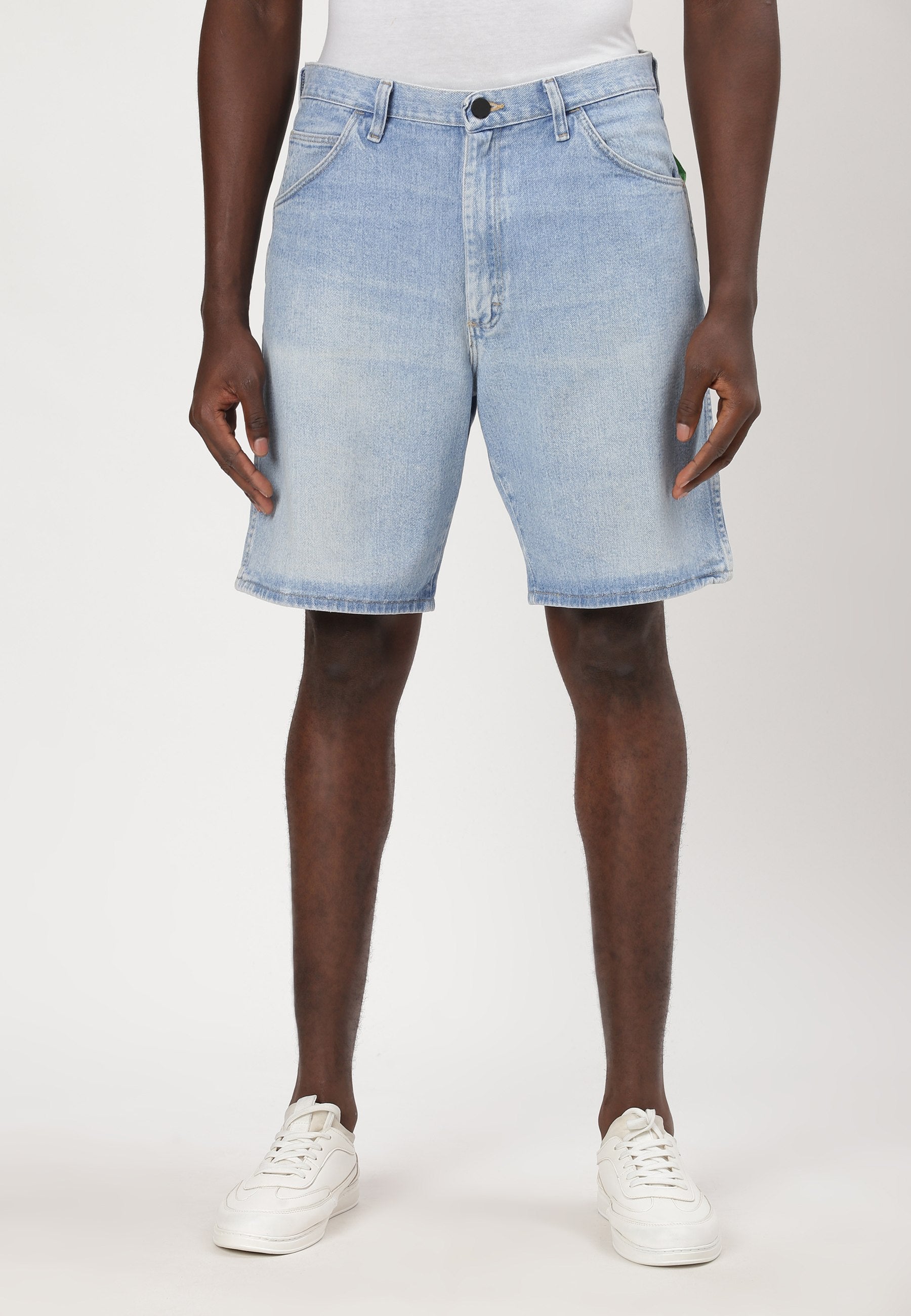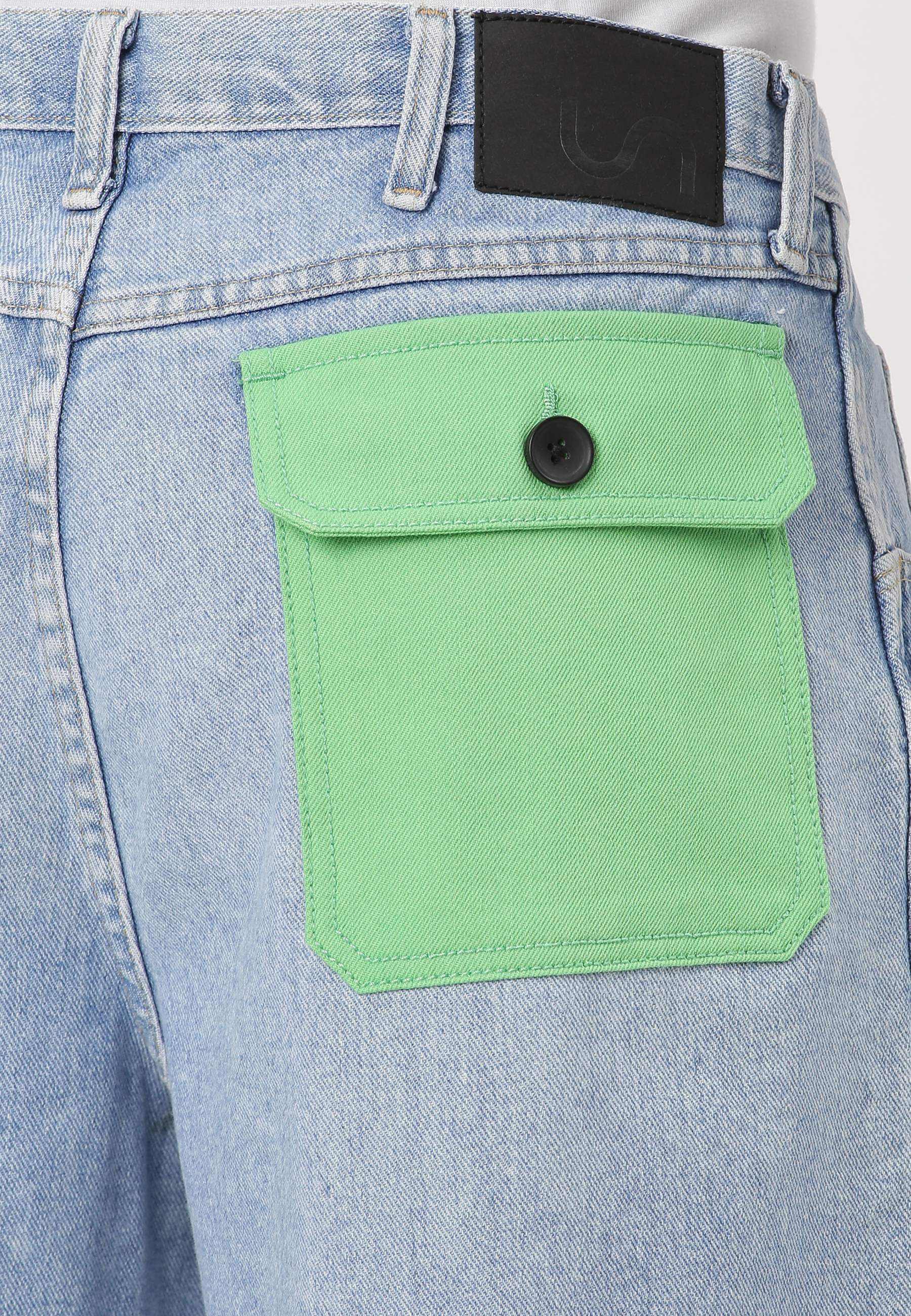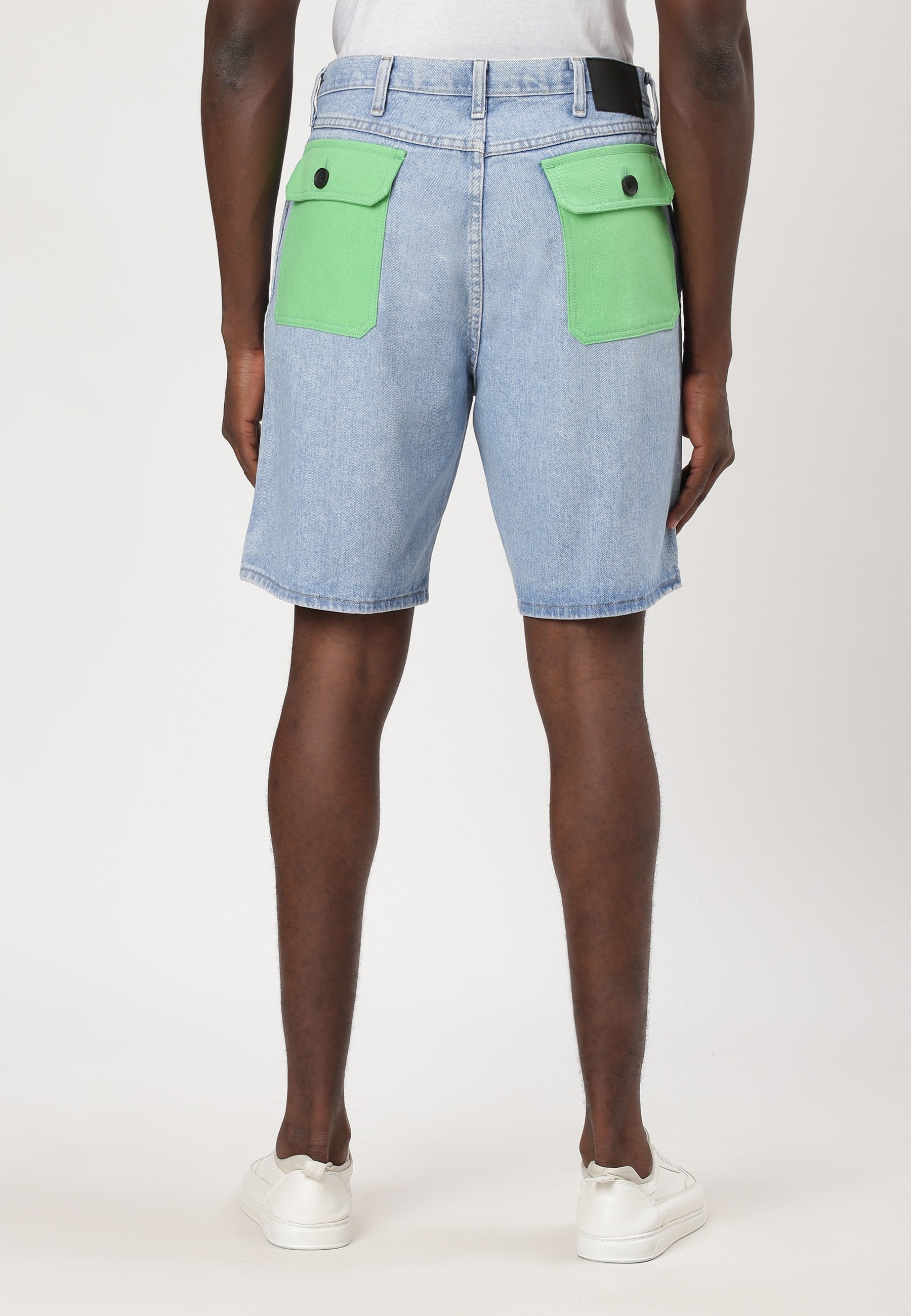 Men's light indigo bermuda denim shorts that sit high on the waist with wide leg openings. A relaxed fit around the hip and thigh. They come with bold, bright green back pockets.