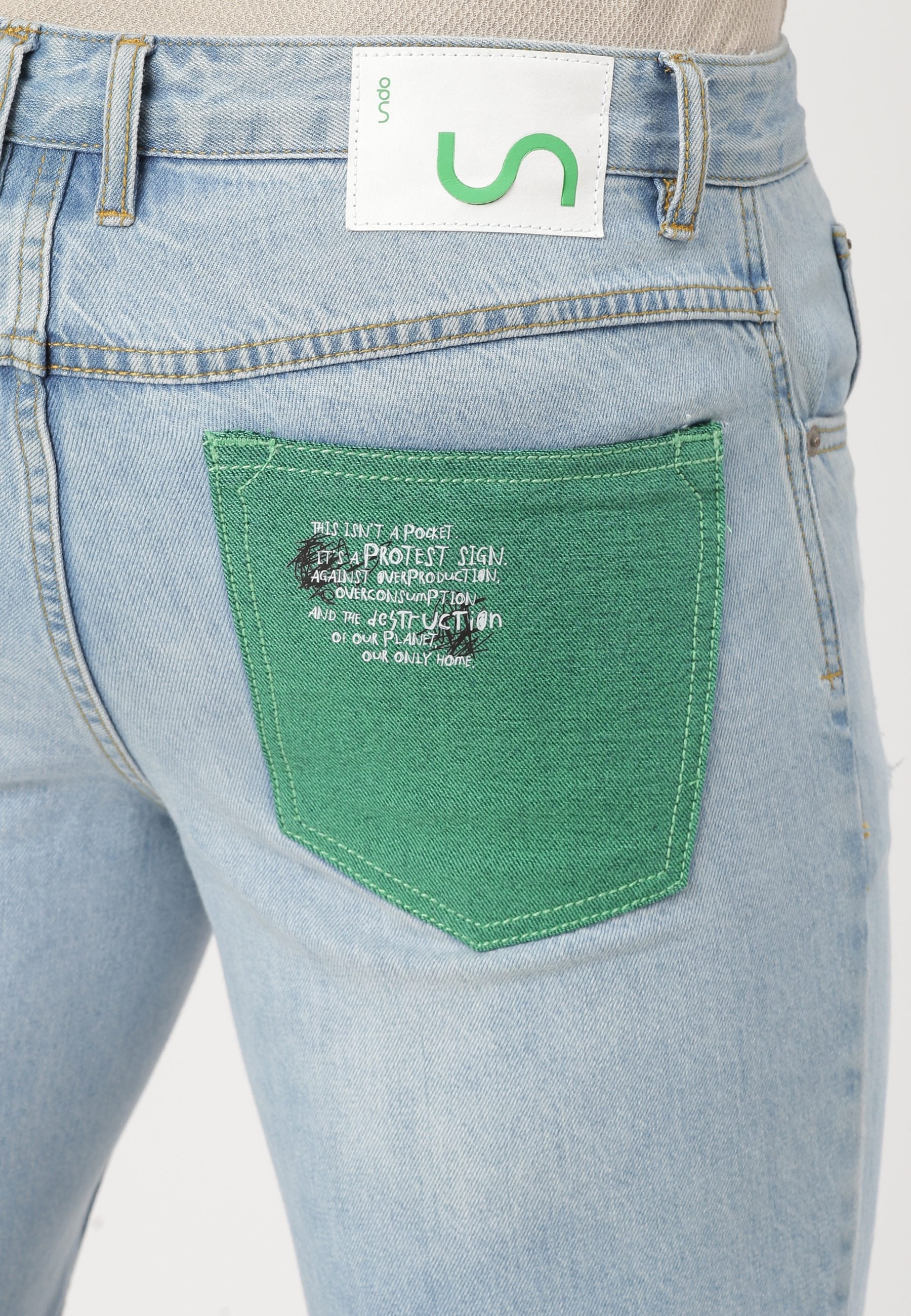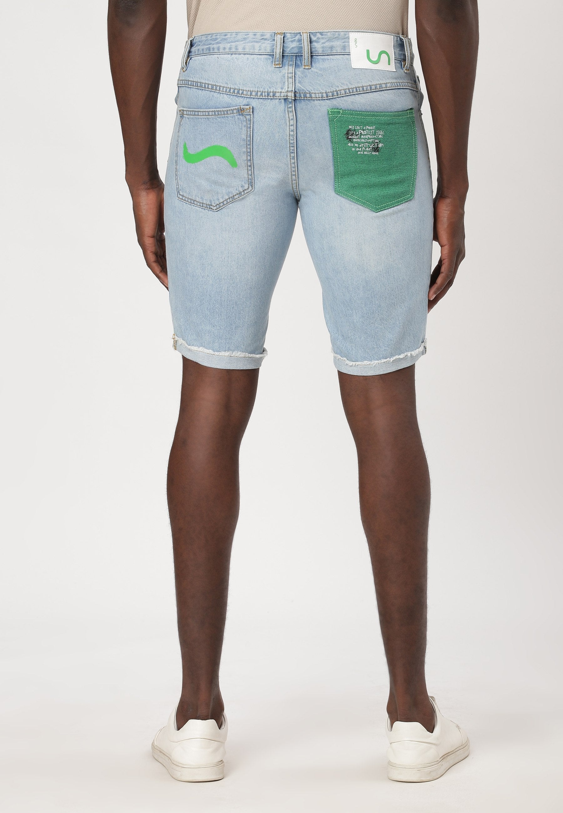Men's light indigo slim denim shorts that sit high on the waist with narrow leg openings. They slim through the thigh and taper slightly towards knee. They feature Un Denim's signature GreenPocket™ that says - ‘This is not a green pocket, it’s a protest sign, against overproduction, overconsumption and the destruction of our planet, our only home.’