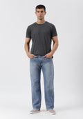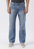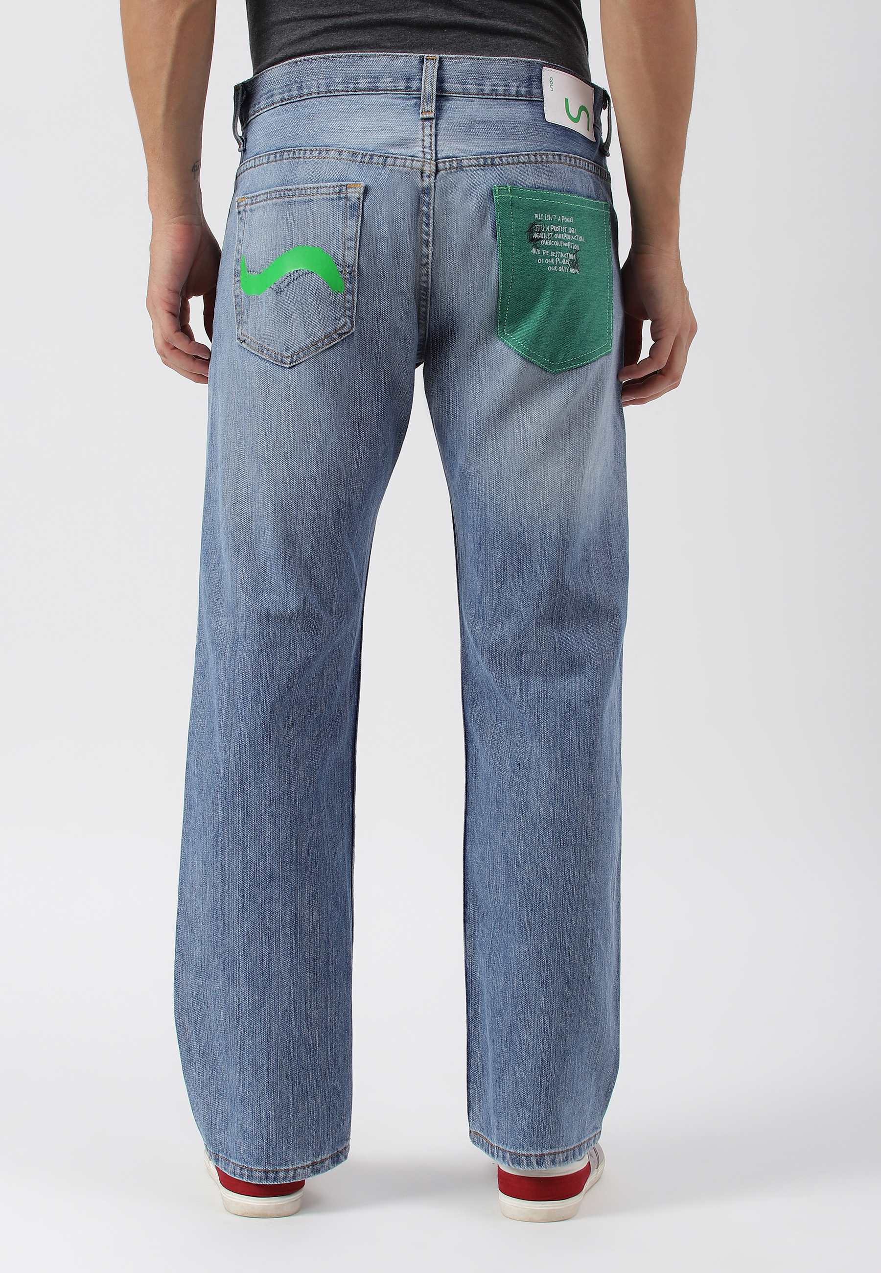 Men's light indigo straight jeans that sit high on the waist with narrow leg openings. They fit fuller through the hip and thigh and run straight from hip to ankle. They feature Un Denim's signature GreenPocket™ that says - ‘This is not a green pocket, it’s a protest sign, against overproduction, overconsumption and the destruction of our planet, our only home.’