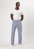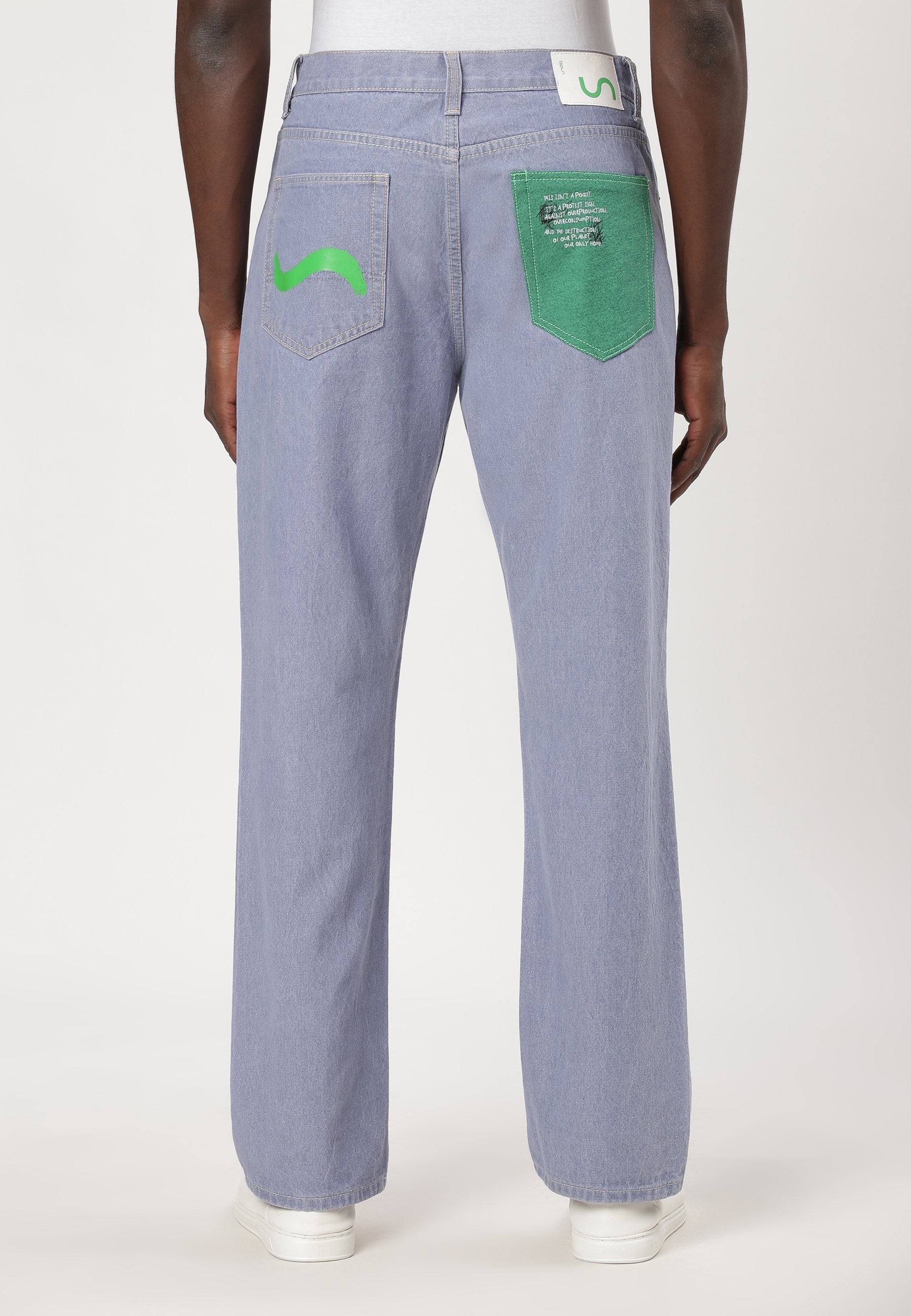 Men's light indigo straight jeans that sit high on the waist with narrow leg openings. They fit fuller through the hip and thigh and run straight from hip to ankle. They feature Un Denim's signature GreenPocket™ that says - ‘This is not a green pocket, it’s a protest sign, against overproduction, overconsumption and the destruction of our planet, our only home.’