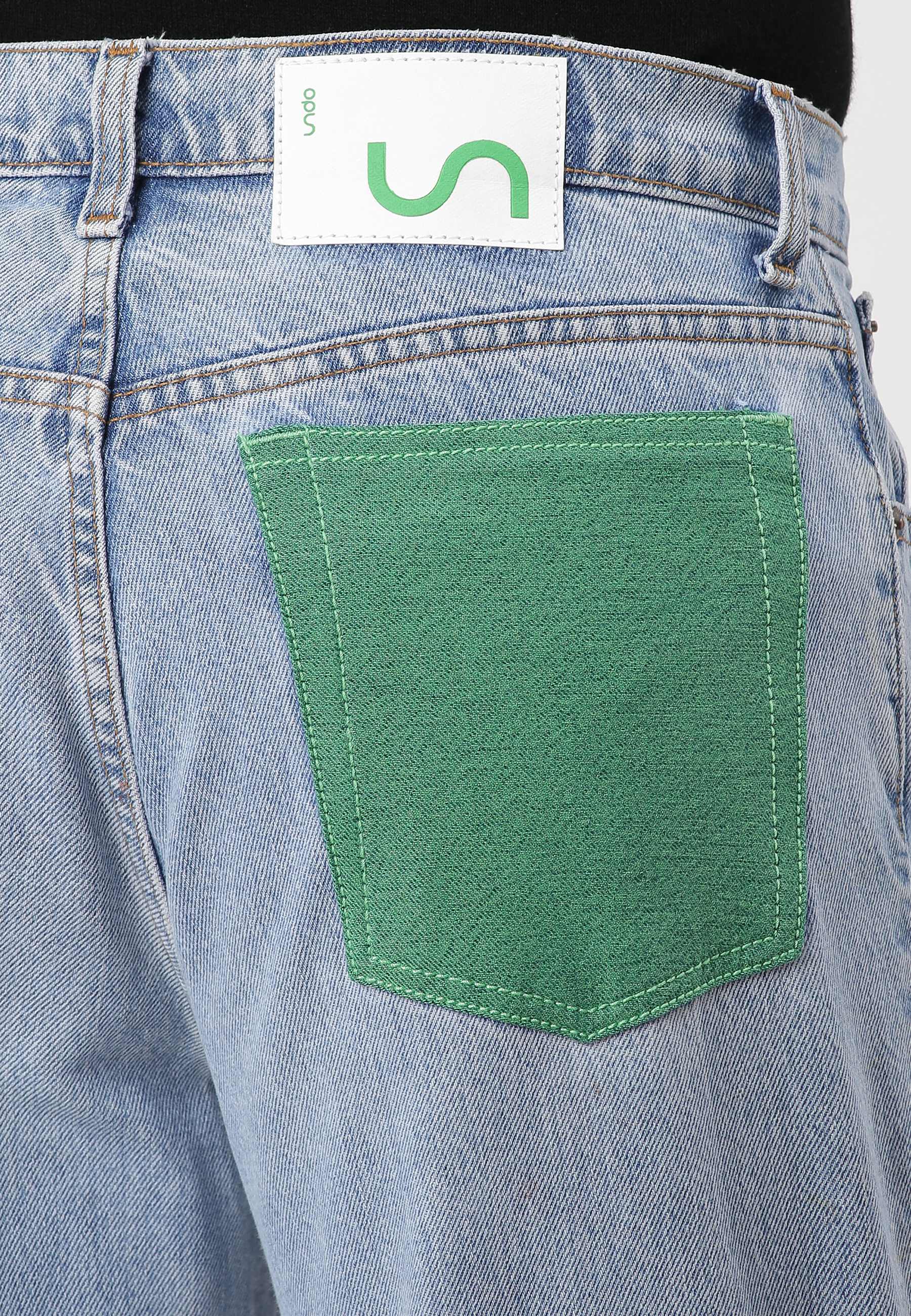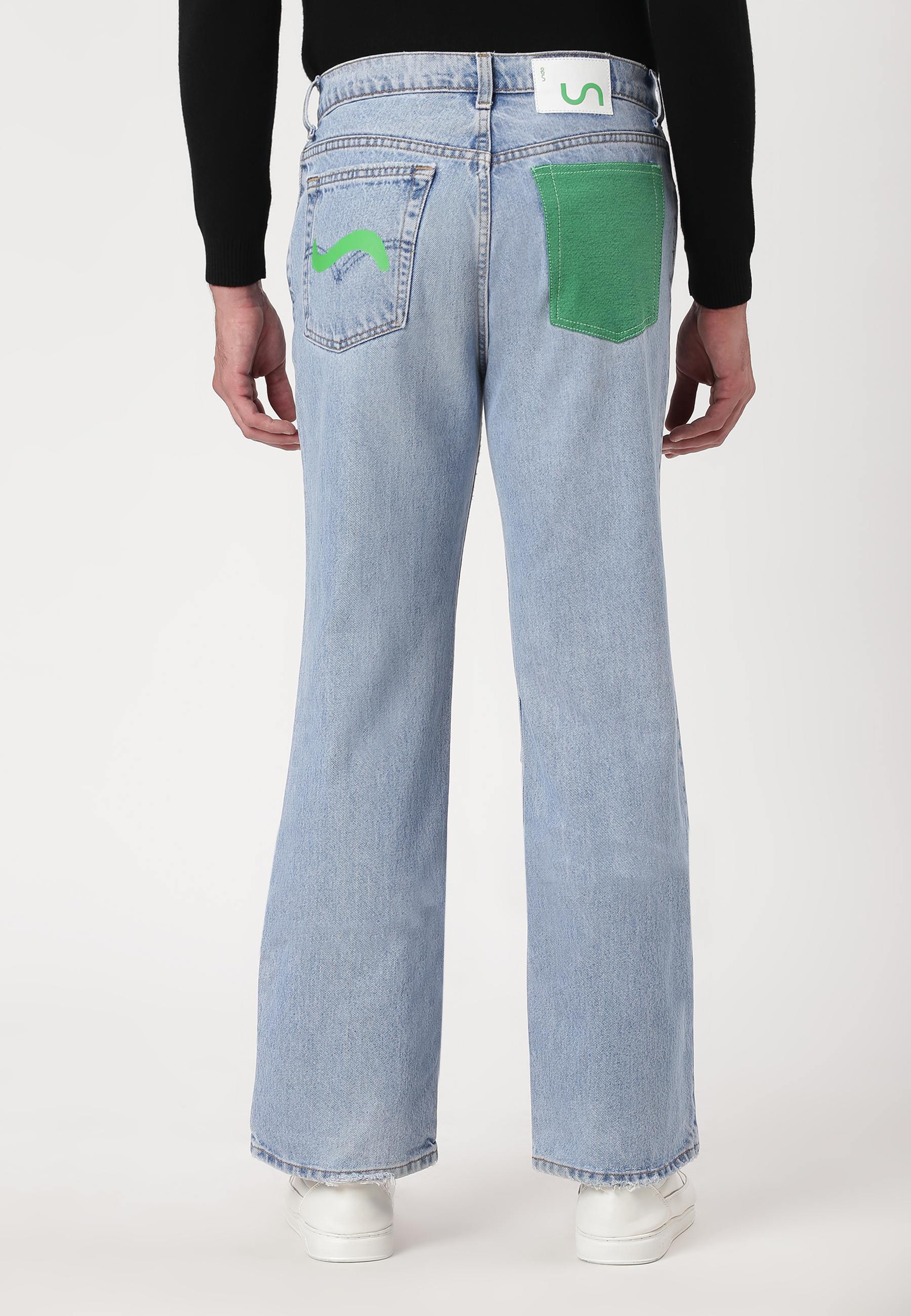Men's light indigo straight jeans that sit high on the waist with narrow leg openings. They fit fuller through the hip and thigh and run straight from hip to ankle. They feature Un Denim's signature GreenPocket™ - our distinctive design