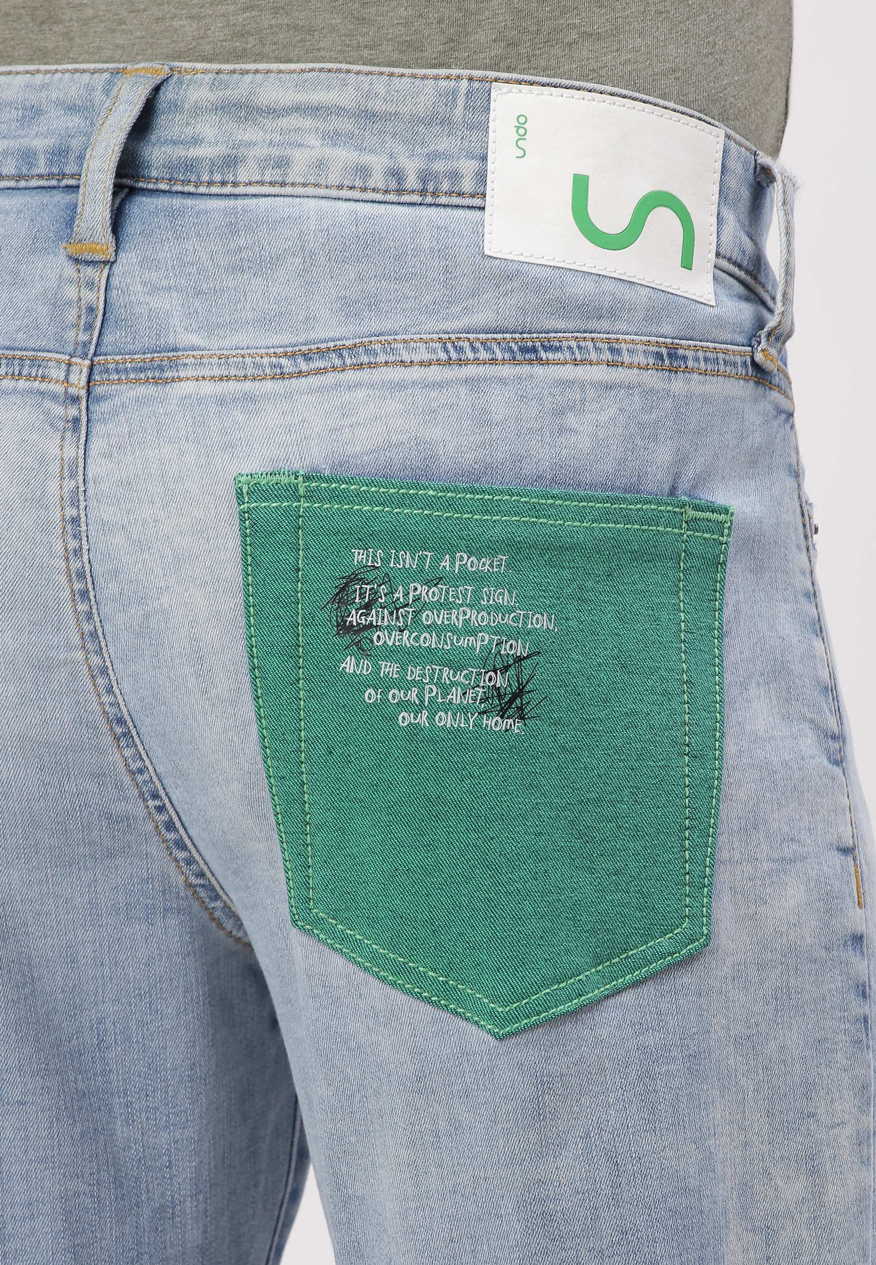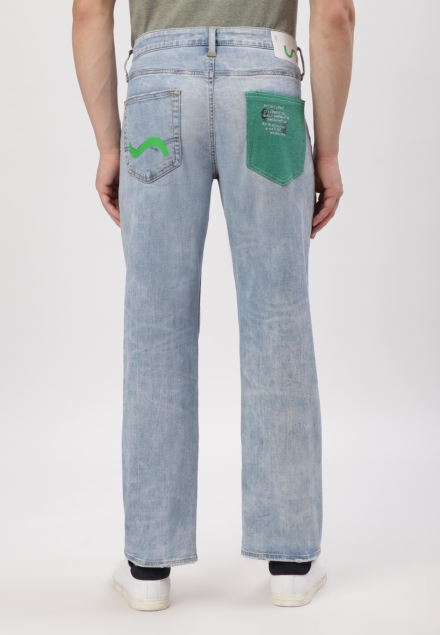 Men's light indigo straight jeans that sit low on waist with narrow leg openings. They fit fuller through the hip and thigh and run straight from hip to ankle. They feature Un Denim's signature GreenPocket„¢ that says - This is not a green pocket, its a protest sign, against overproduction, overconsumption and the destruction of our planet, our only home.™