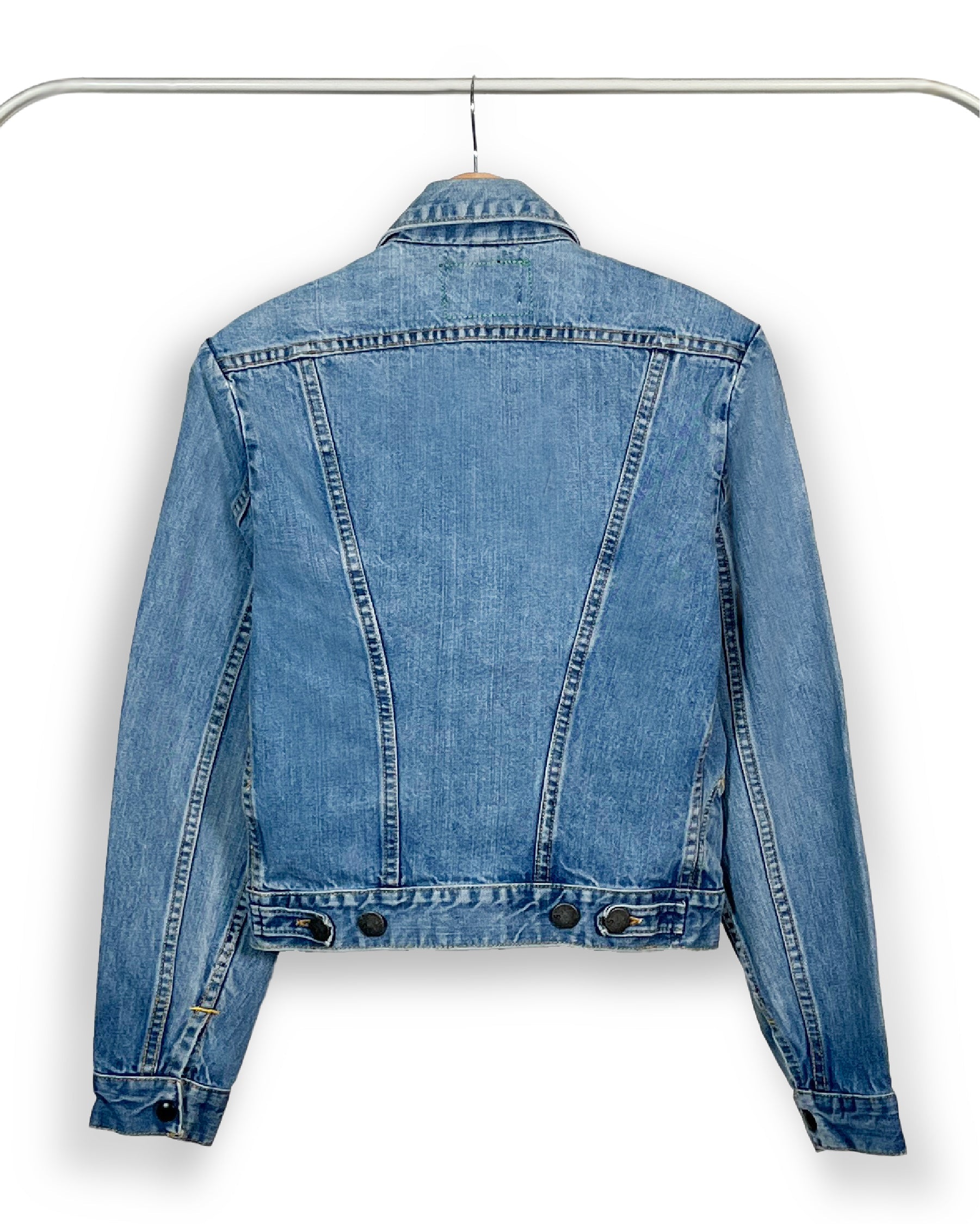 Men's mid indigo trucker denim jacket. An iconic jacket style with a slim casual cut, spread collar, pointed flap chest pockets, button tab waist adjusters, and two V-shaped seams that run from chest pocket to waist. It features Un Denim's signature GreenPocket™ that says - ‘I pledge to waste less, crave less, use less and reuse more. I pledge to rescue our future.'