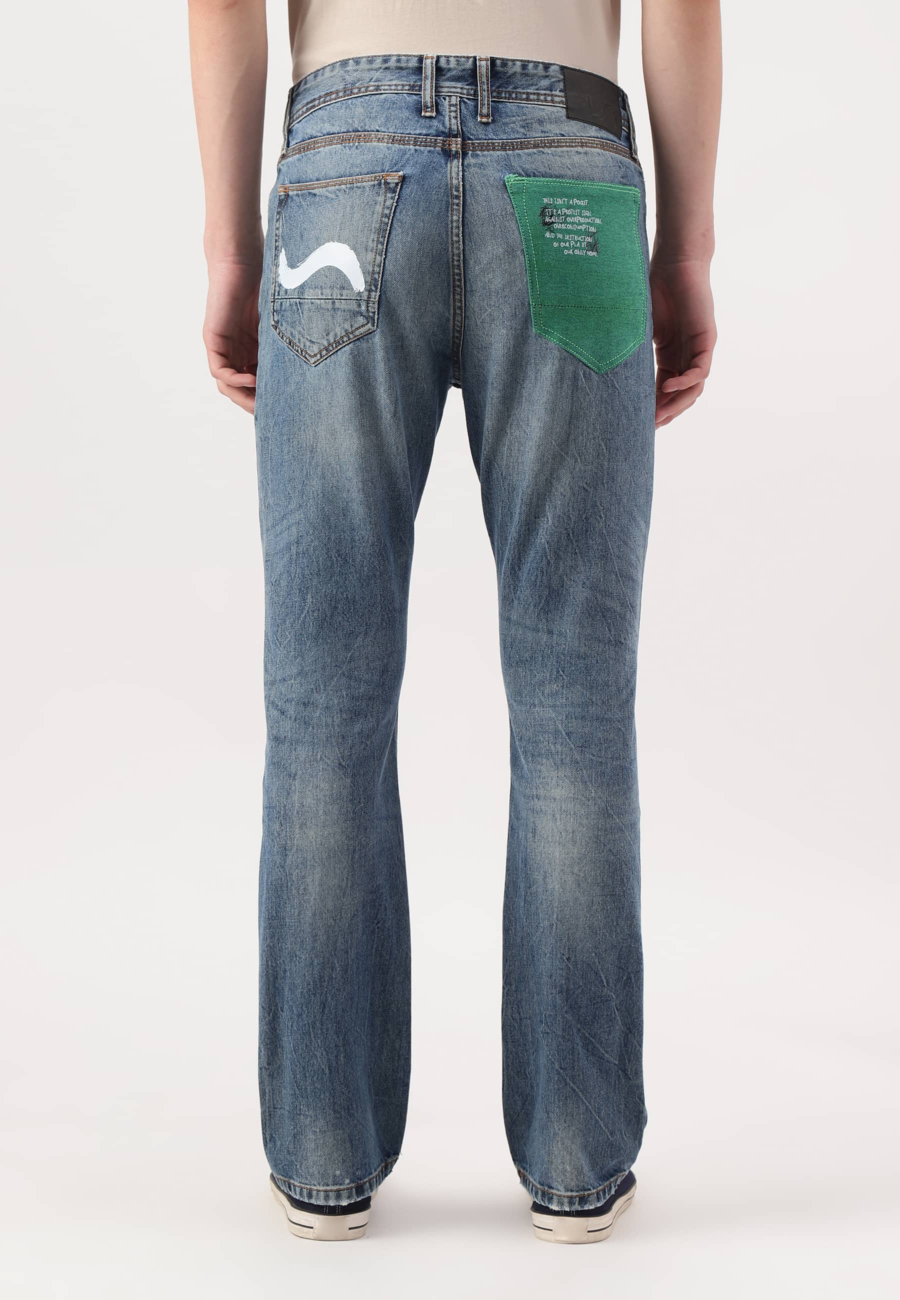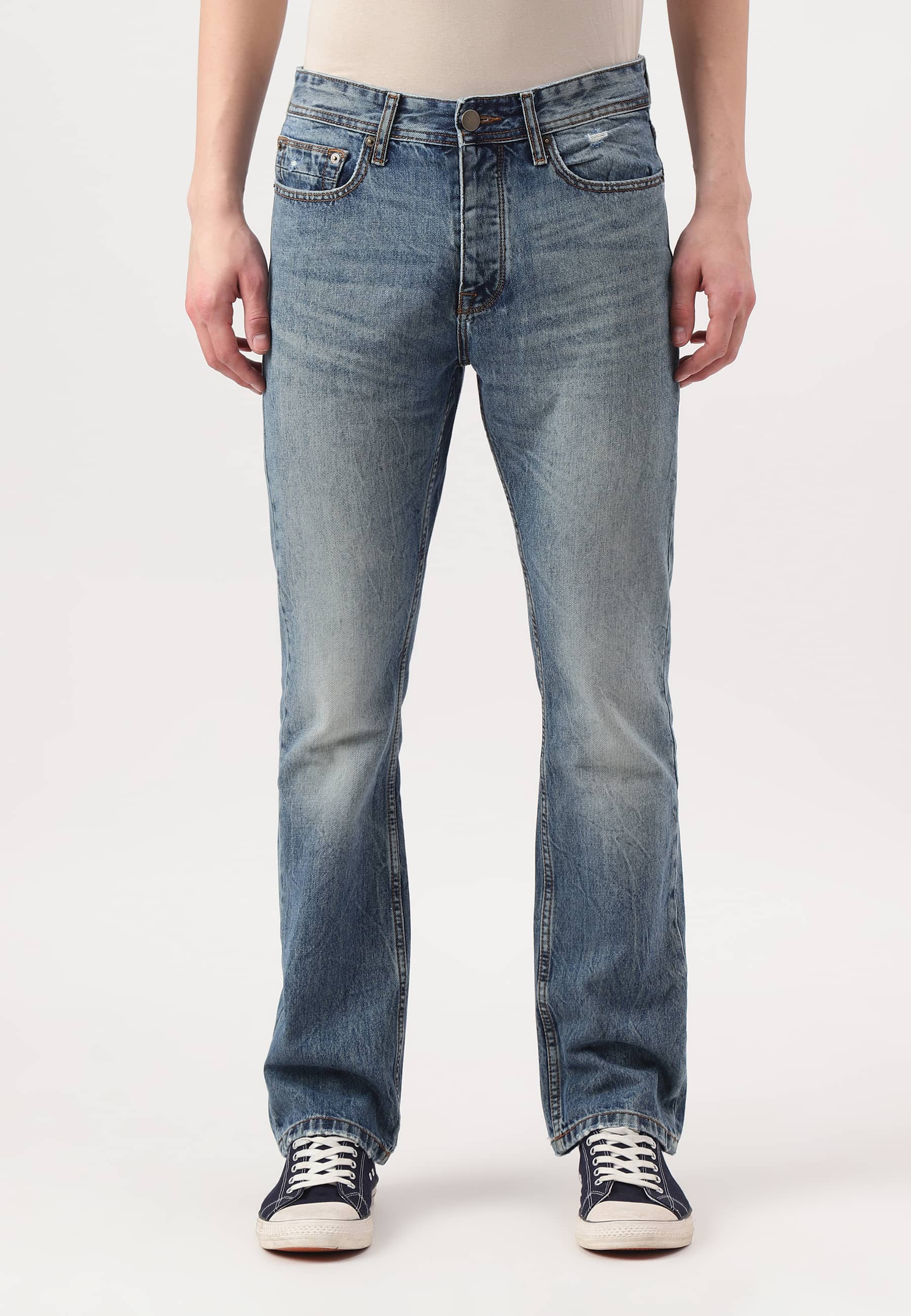 Men's mid indigo bootcut jeans that sit high on the waist with wide leg openings. They fit snugly through the thigh and flare out from the knee. They feature Un Denim's signature GreenPocket that says - ˜This is not a green pocket, its a protest sign, against overproduction, overconsumption and the destruction of our planet, our only home.™
