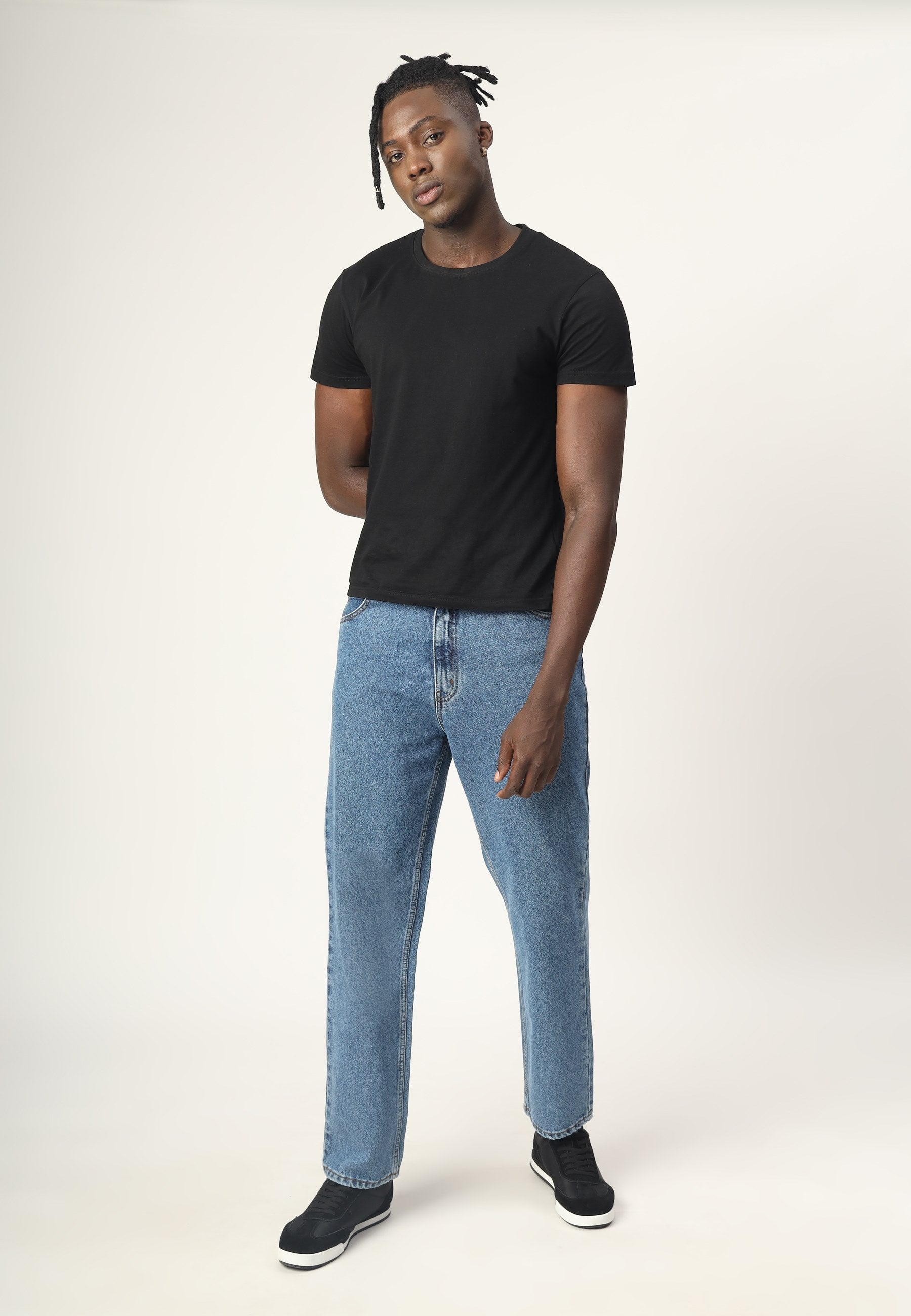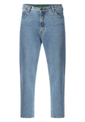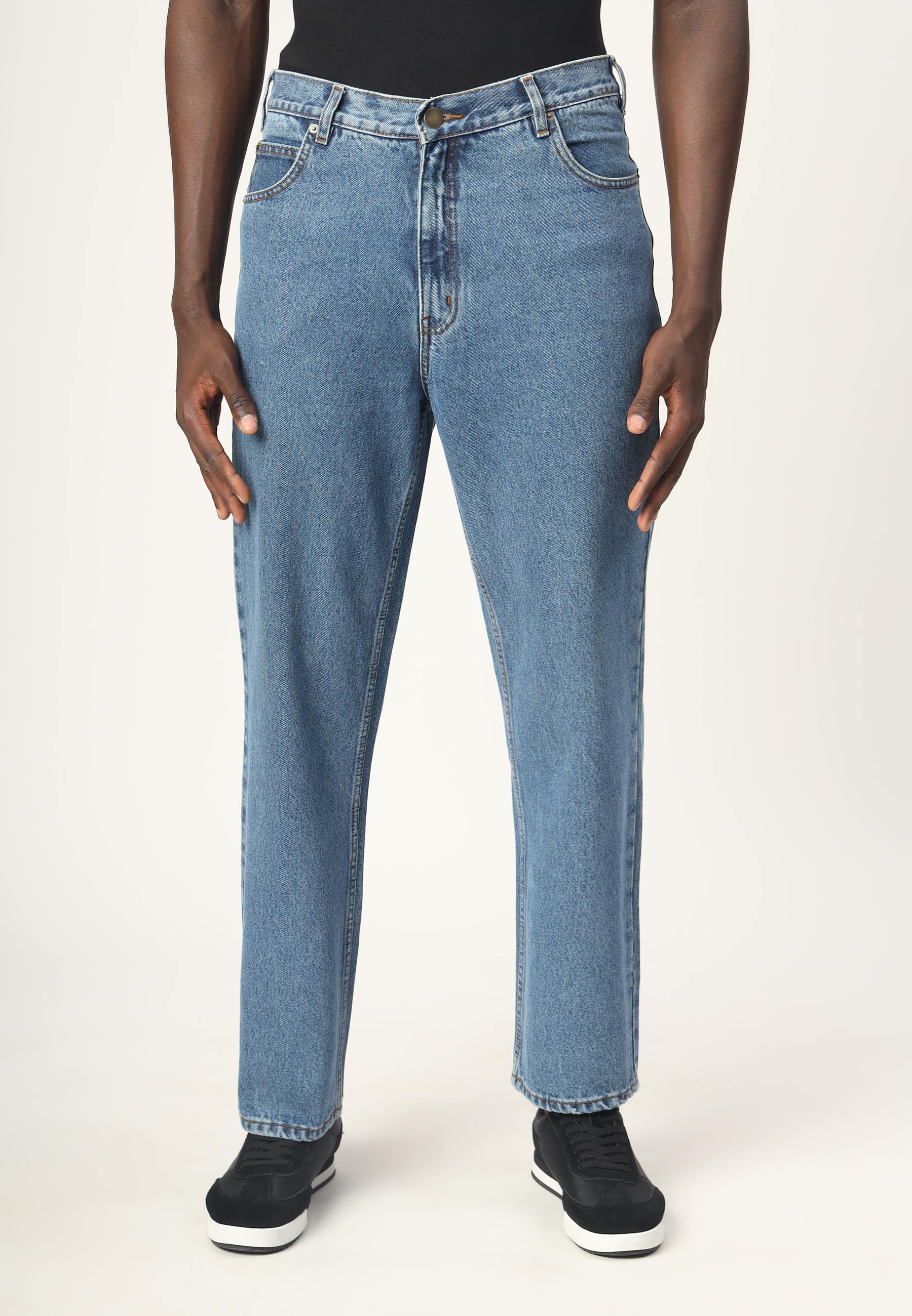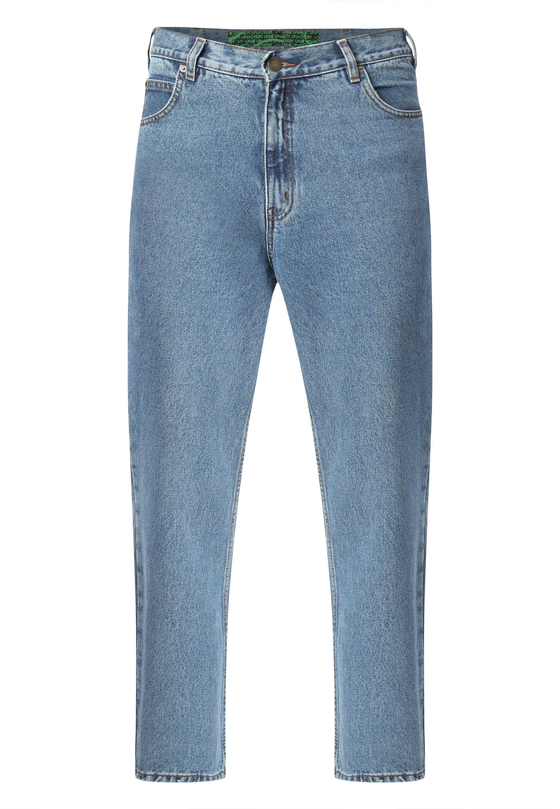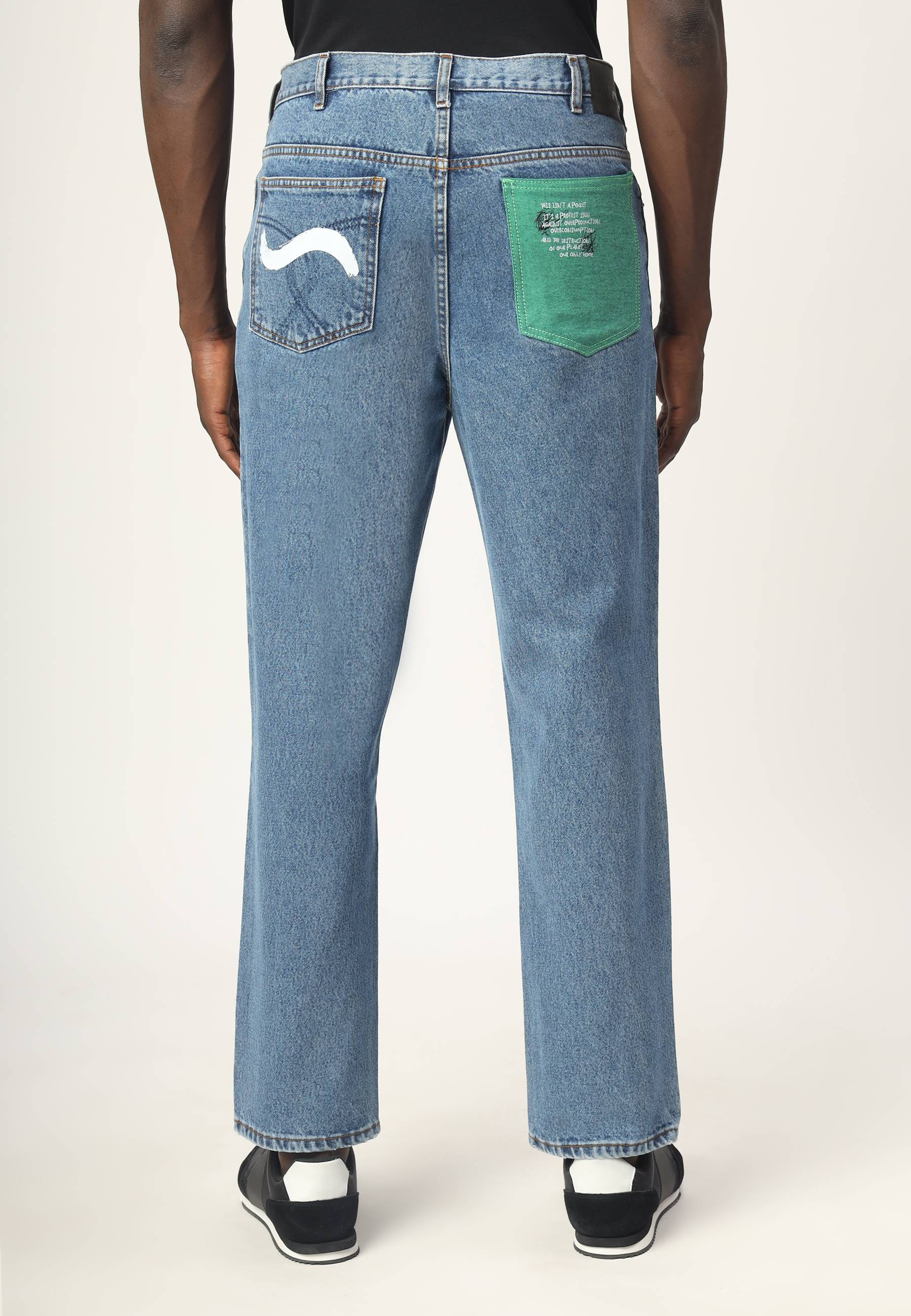 Men's mid indigo straight jeans that sit high on the waist with narrow leg openings. They fit fuller through the hip and thigh and run straight from hip to ankle. They feature Un Denim's signature GreenPocket™ that says - ‘This is not a green pocket, it’s a protest sign, against overproduction, overconsumption and the destruction of our planet, our only home.’