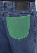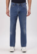 Men's mid indigo straight jeans that sit high on the waist with narrow leg openings. They fit fuller through the hip and thigh and run straight from hip to ankle. They feature Un Denim's signature GreenPocket™ - our distinctive design