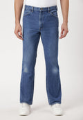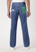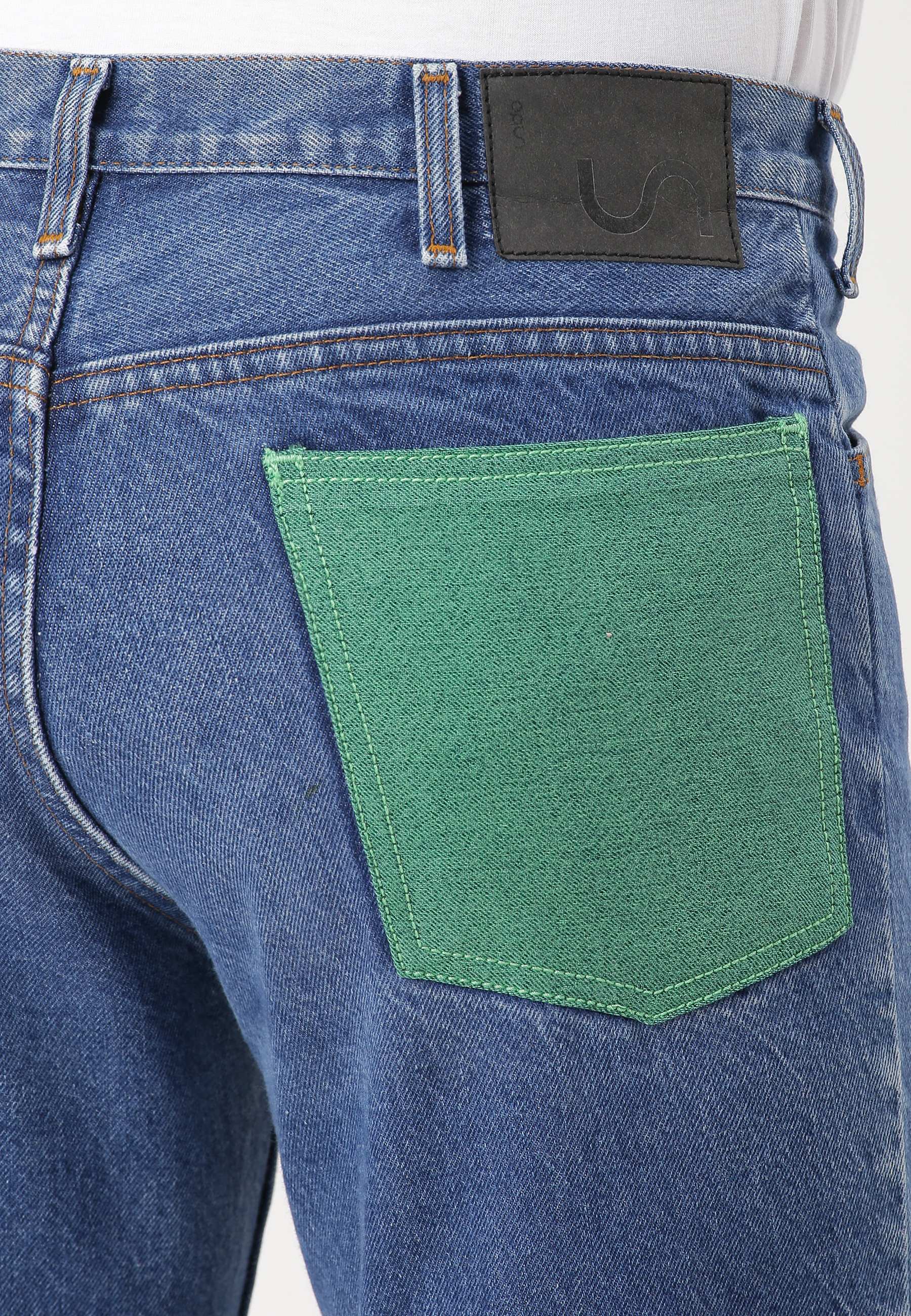 Men's mid indigo straight jeans that sit high on the waist with narrow leg openings. They fit fuller through the hip and thigh and run straight from hip to ankle. They feature Un Denim's signature GreenPocket™ - our distinctive design