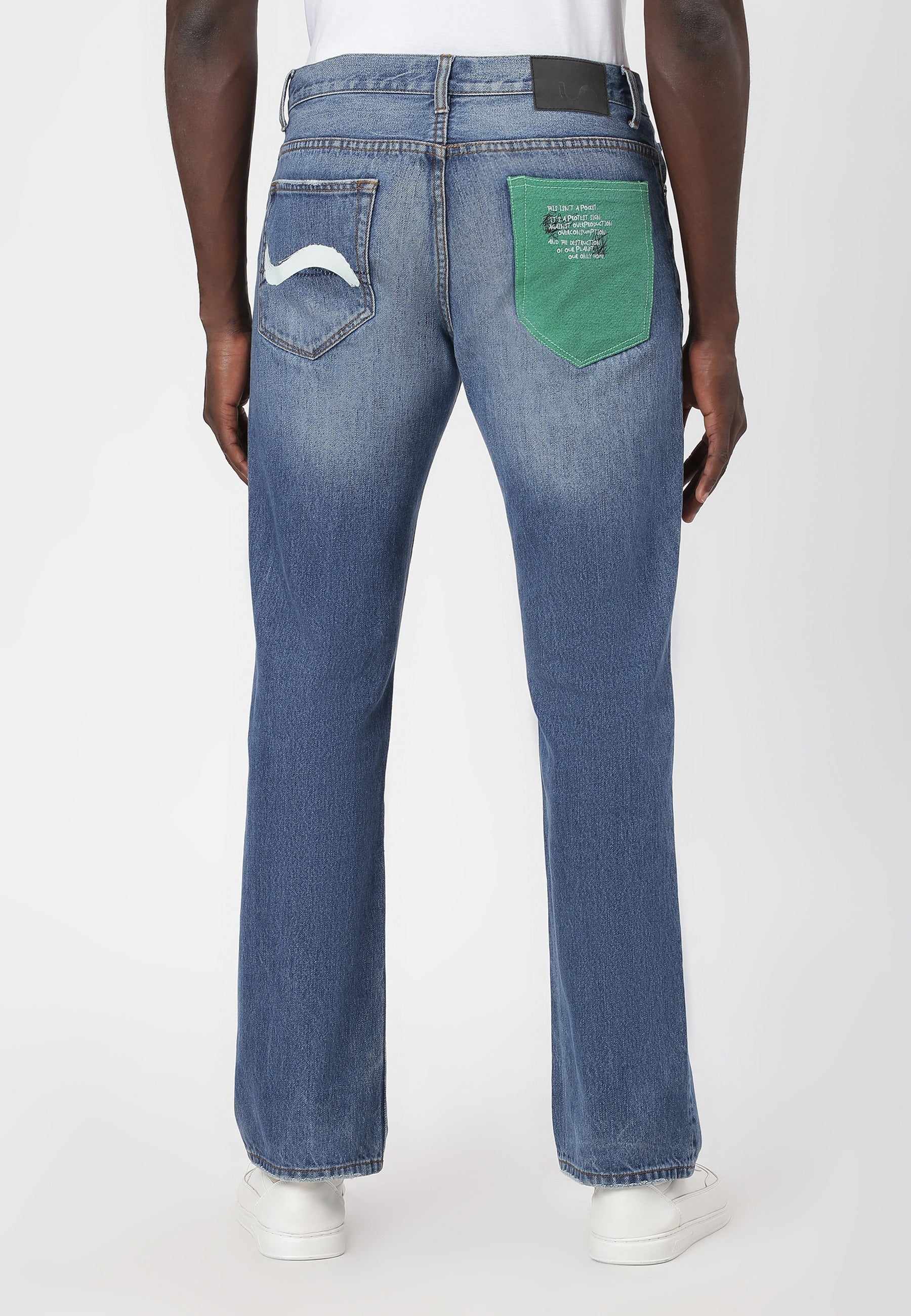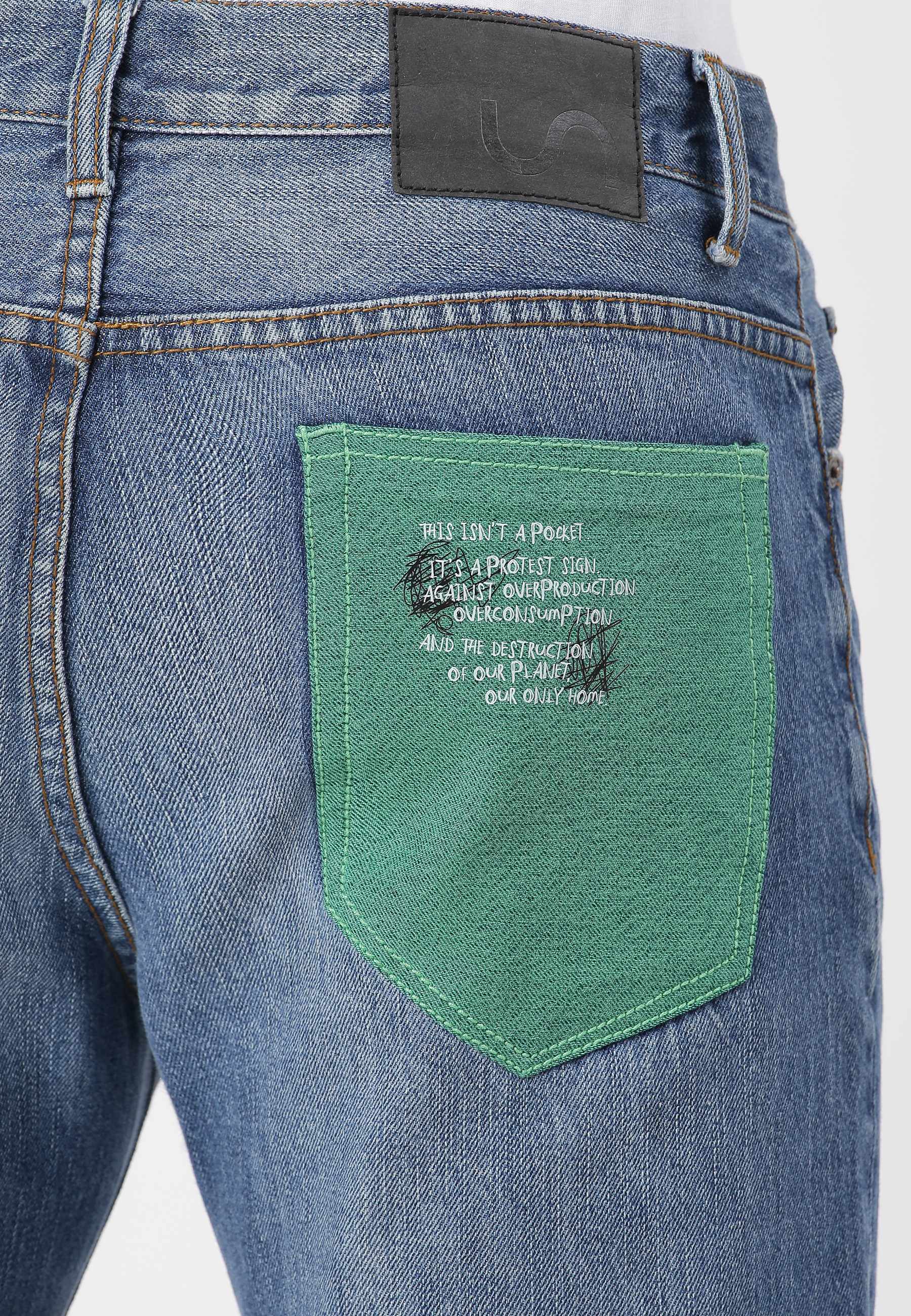 Men's mid indigo straight jeans that sit comfortably at the waist with narrow leg openings. They fit fuller through the hip and thigh and run straight from hip to ankle. They feature Un Denim's signature GreenPocket™ that says - ‘This is not a green pocket, it’s a protest sign, against overproduction, overconsumption and the destruction of our planet, our only home.’