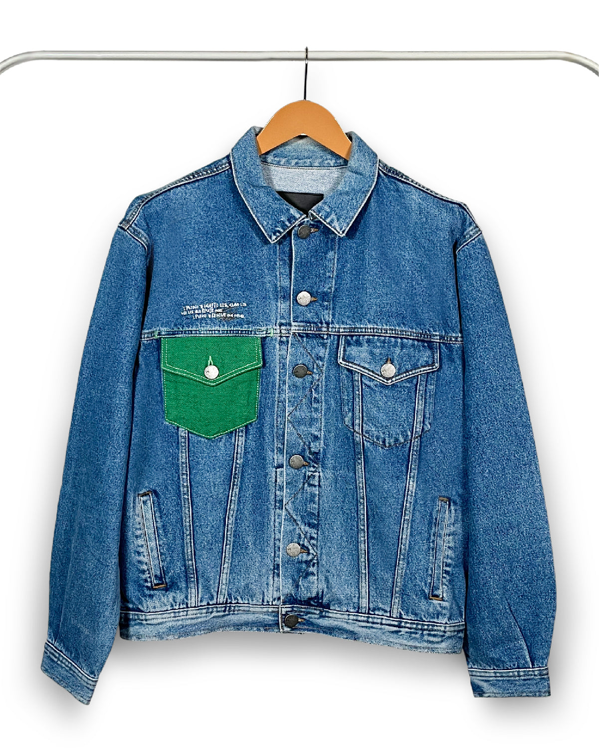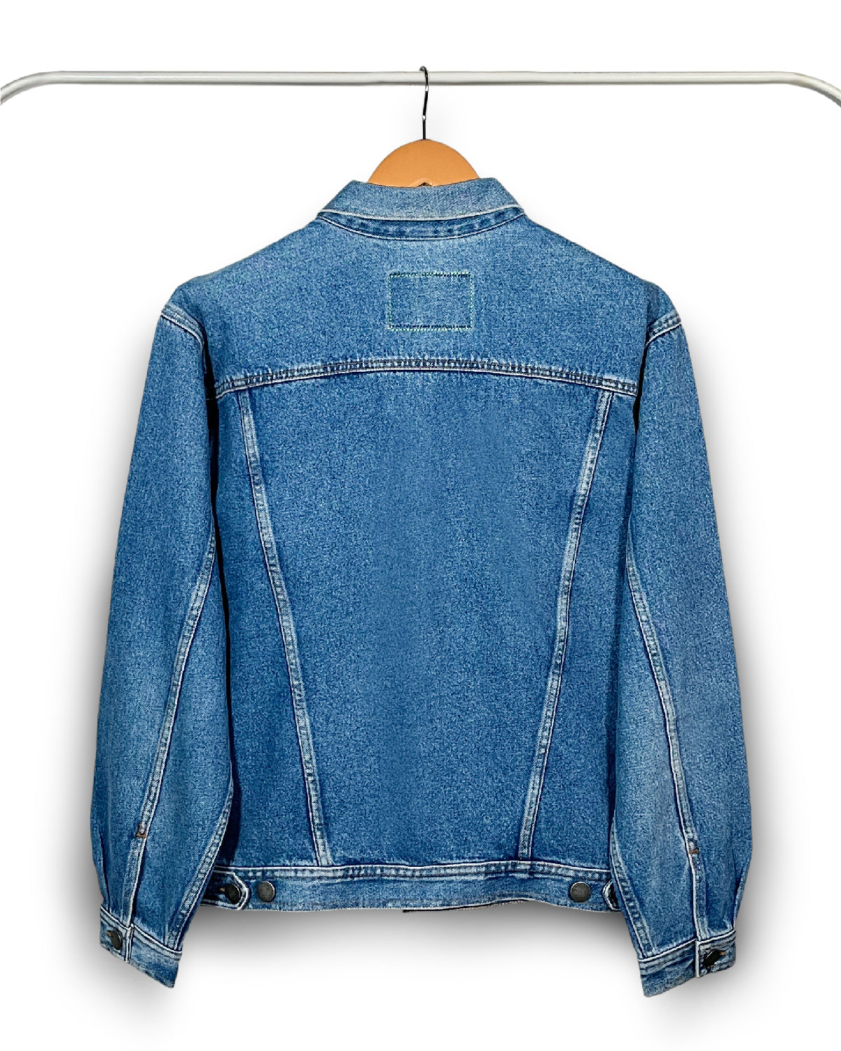 Men's mid indigo trucker denim jacket. An iconic jacket style with a slim casual cut, spread collar, pointed flap chest pockets, button tab waist adjusters, and two V-shaped seams that run from chest pocket to waist. It features Un Denim's signature GreenPocket™ that says - ‘I pledge to waste less, crave less, use less and reuse more. I pledge to rescue our future.'
